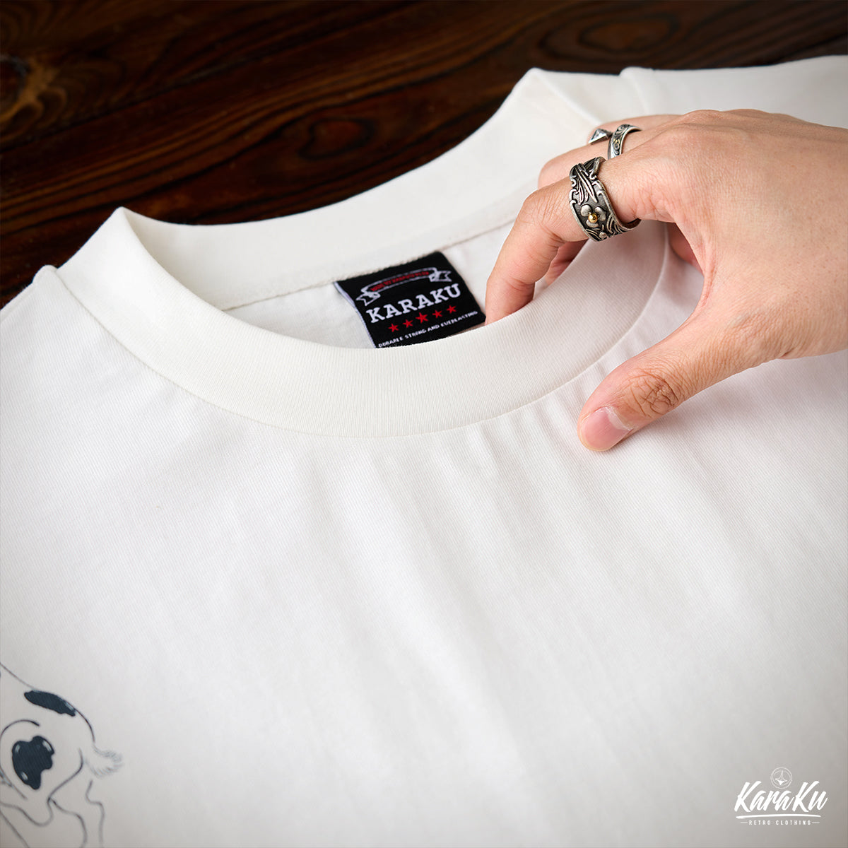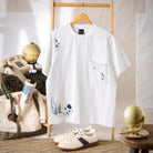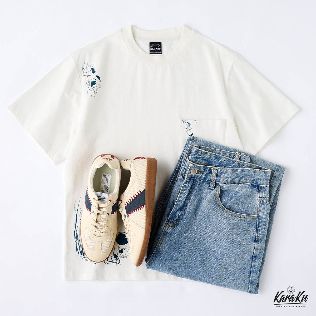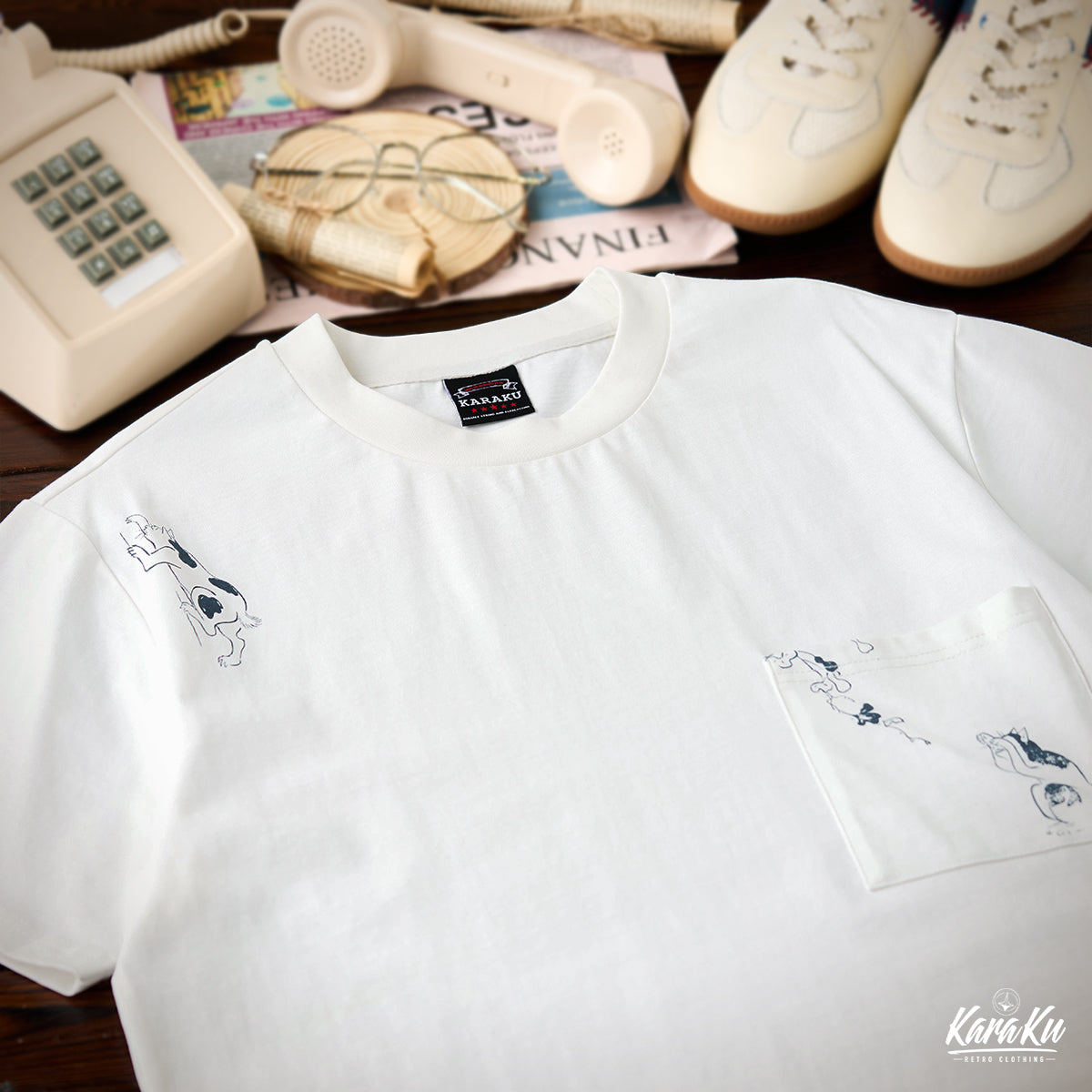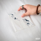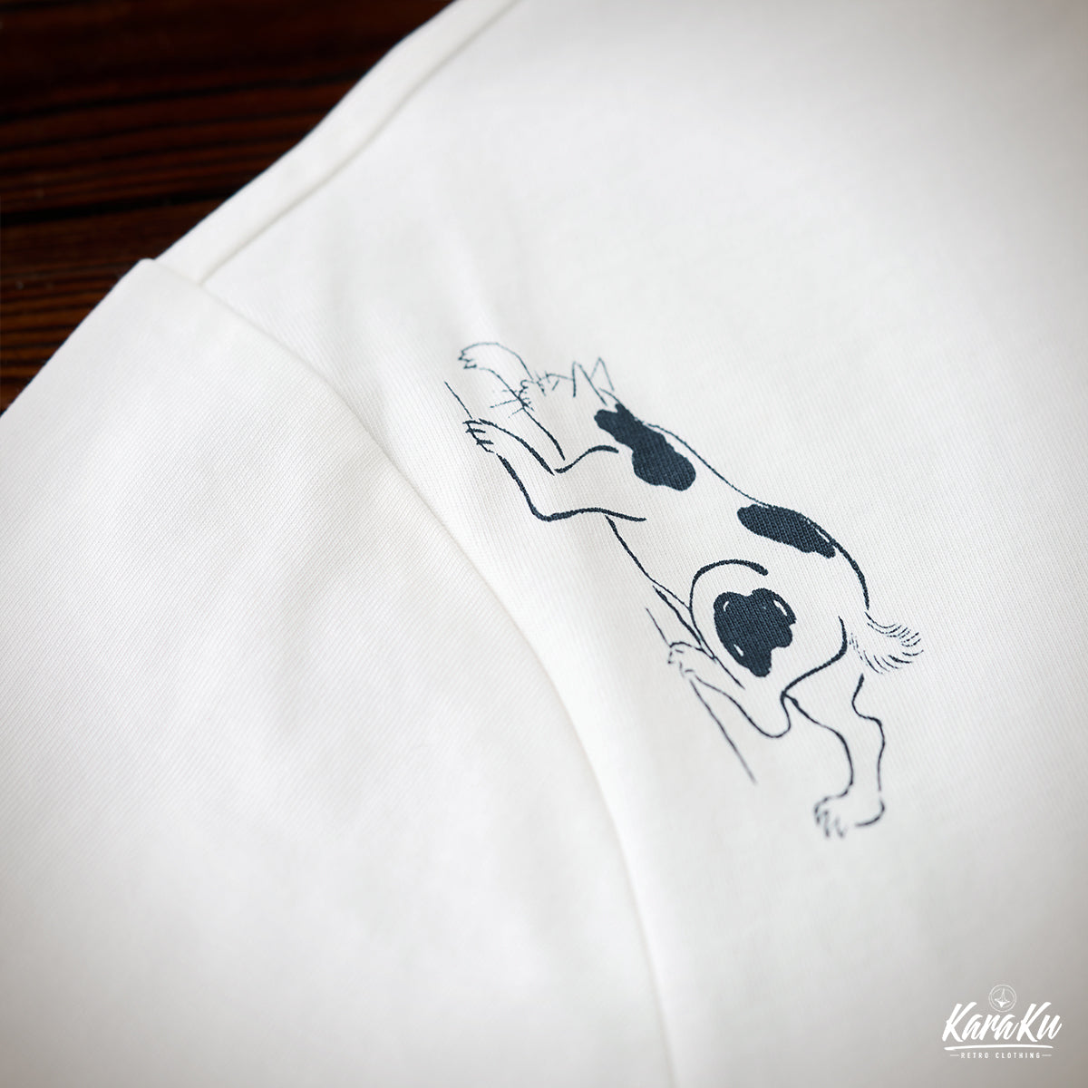 흰 바탕에 쪽빛 컬러로 그려진 고양이들이 유쾌한 분위기를 자아내며, 포켓에는 장난치는 고양이로 위트 있는 포인트를 더했습니다.