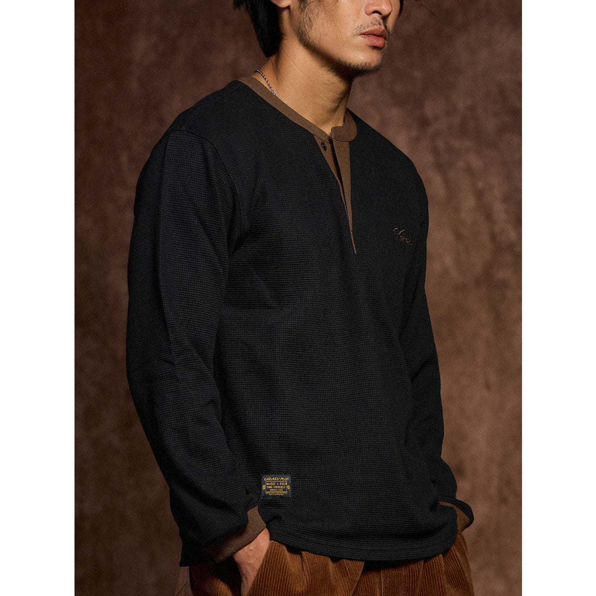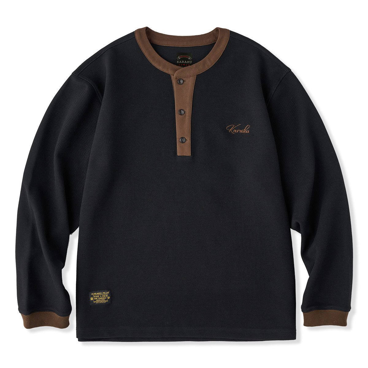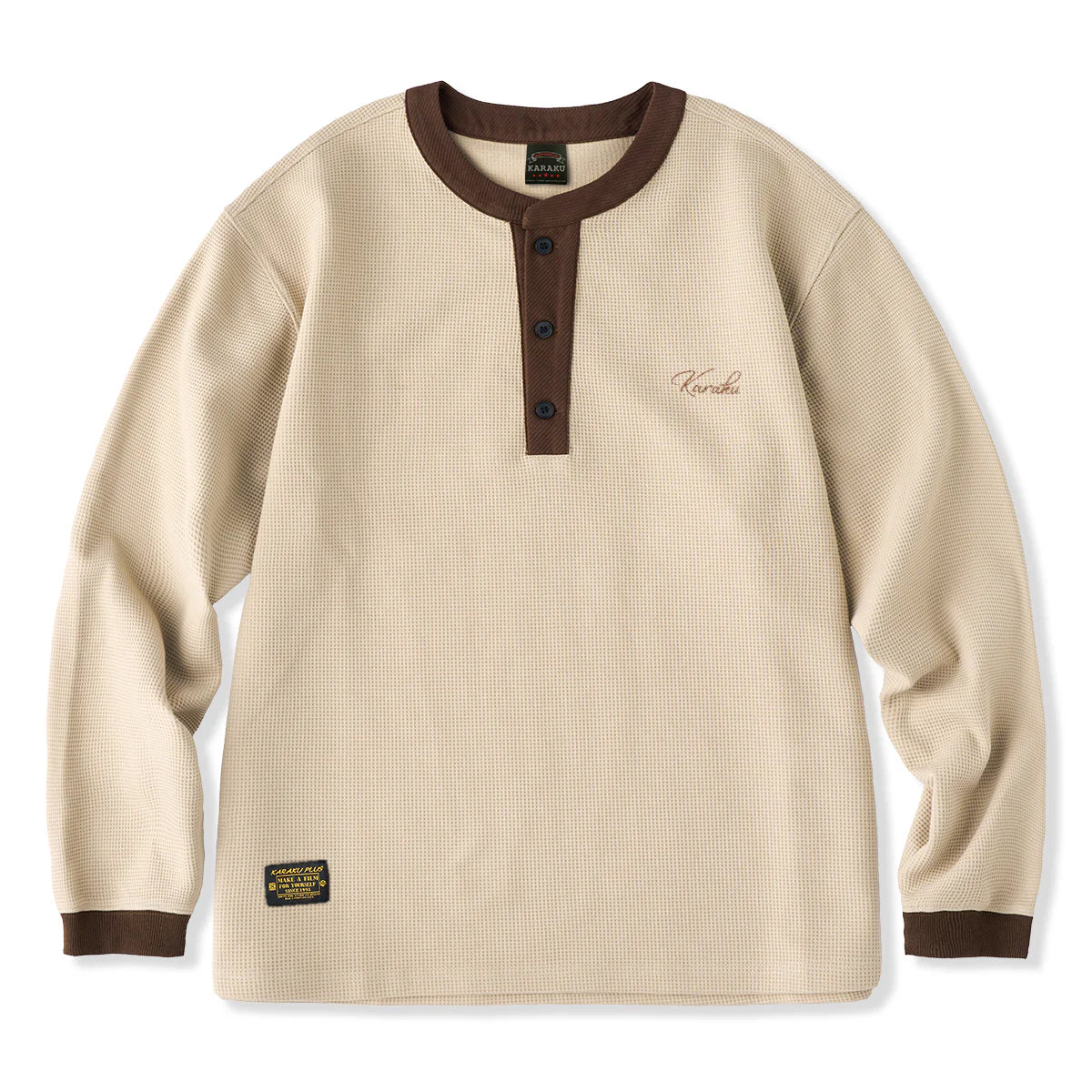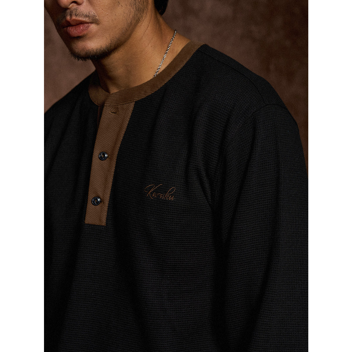 「KaraKu」Embroidered Waffle Henley Neck Long T