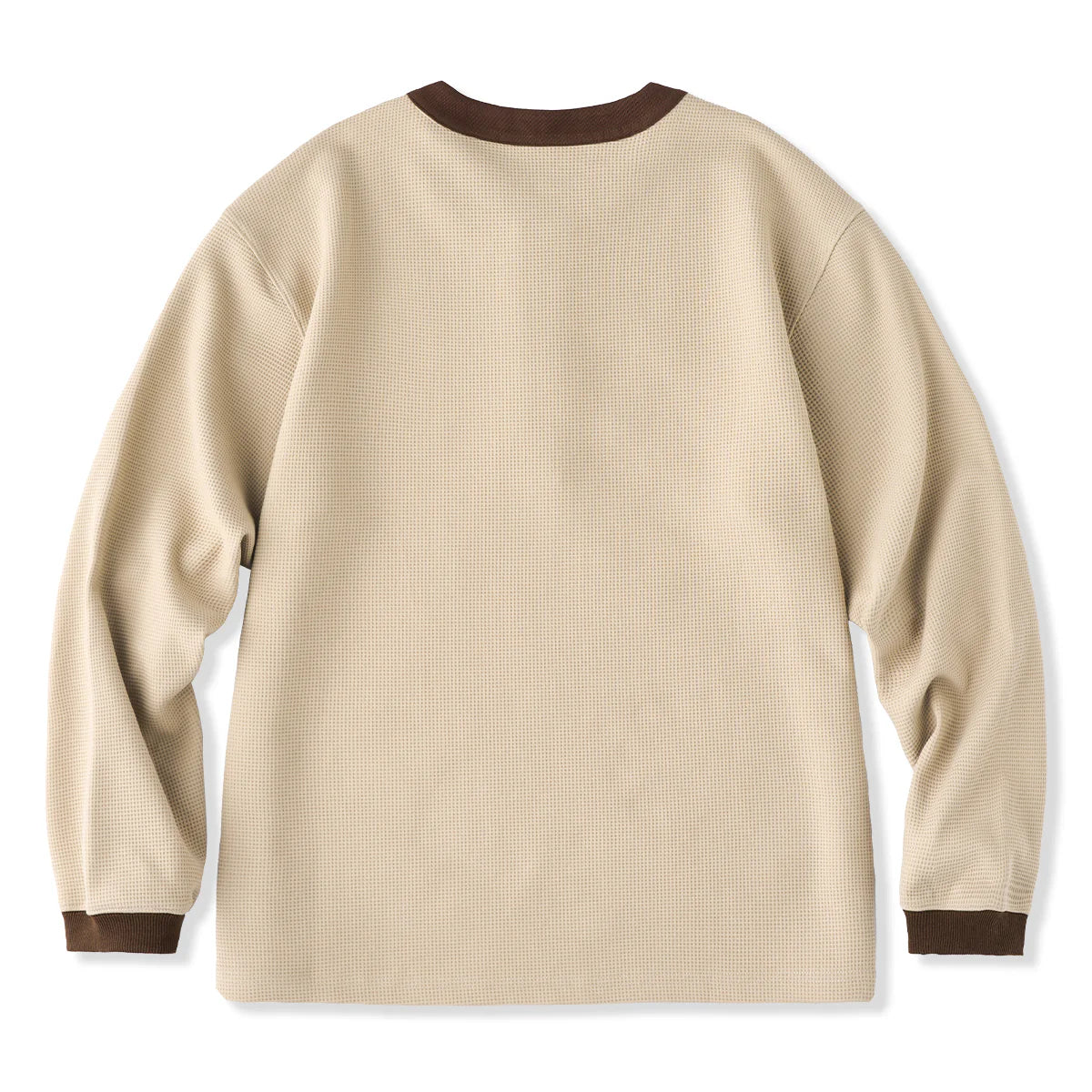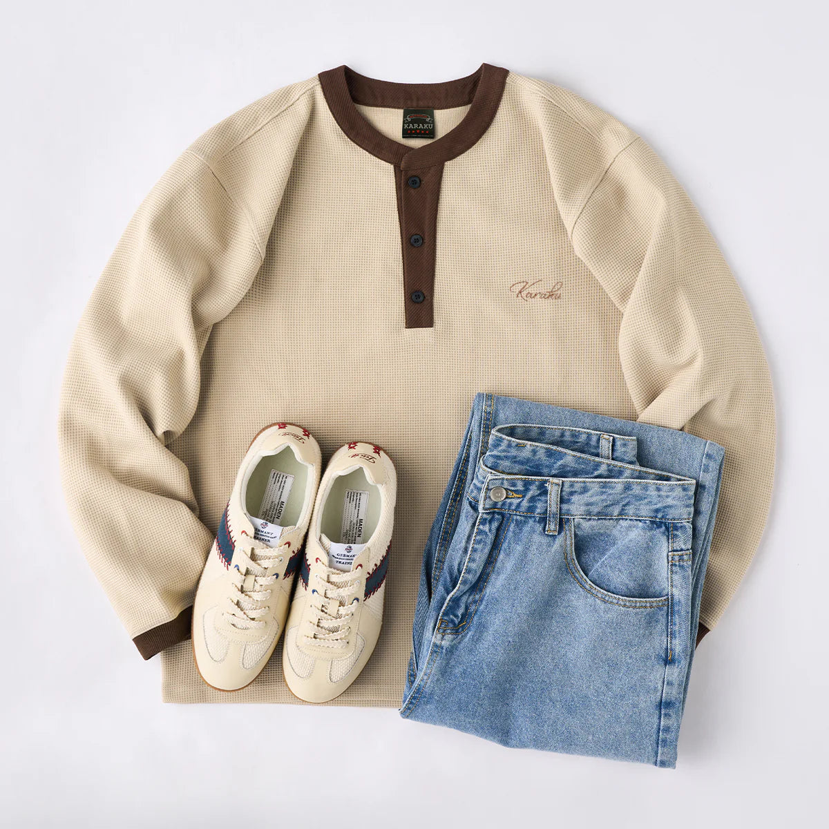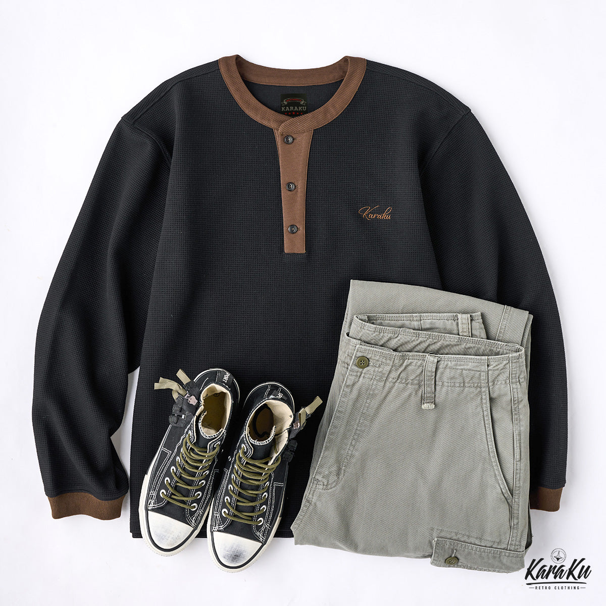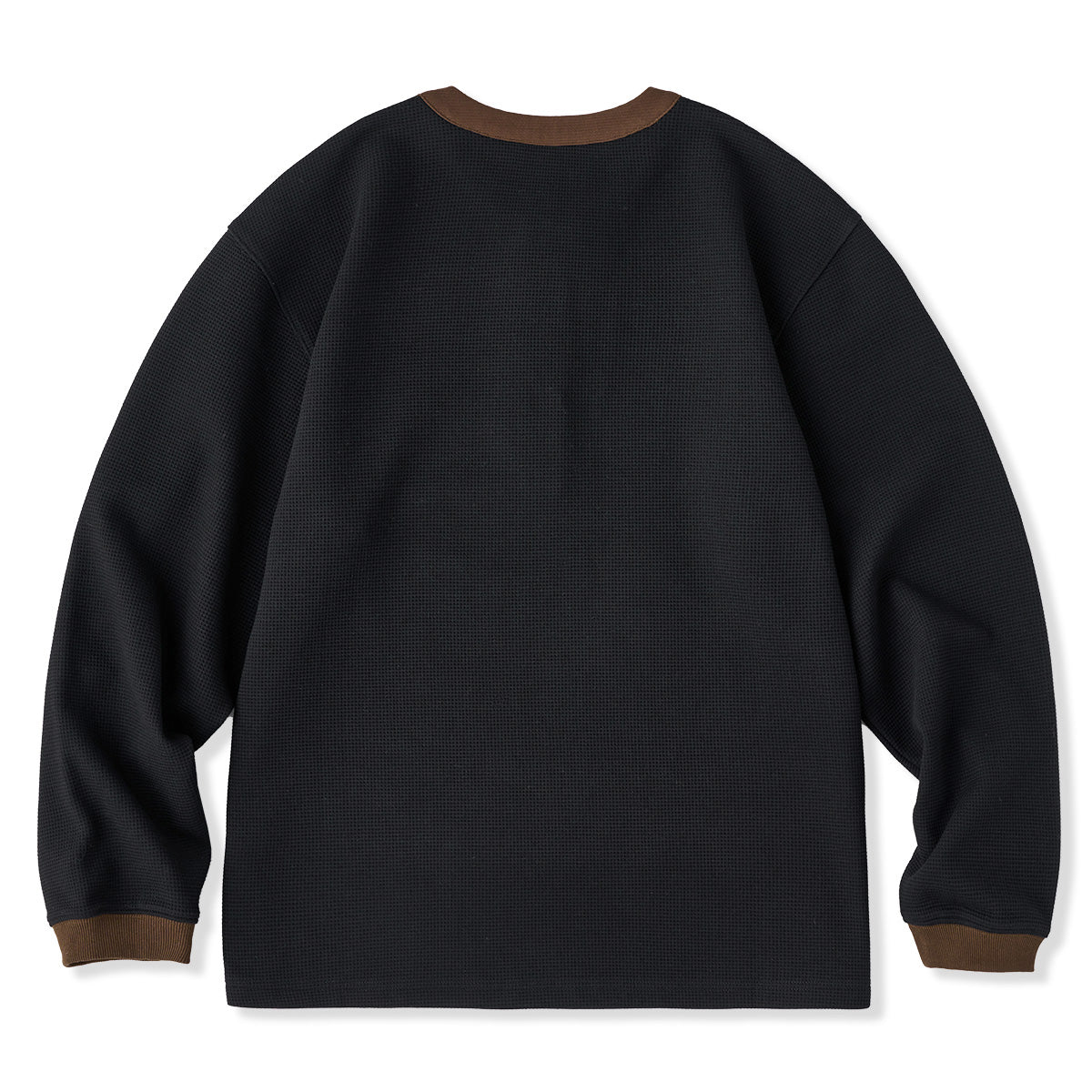 「KaraKu」Embroidered Waffle Henley Neck Long T