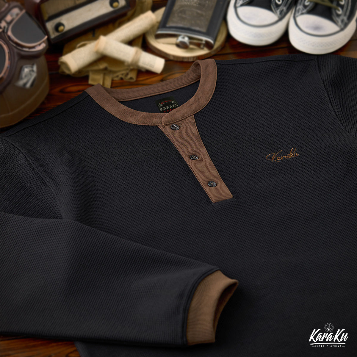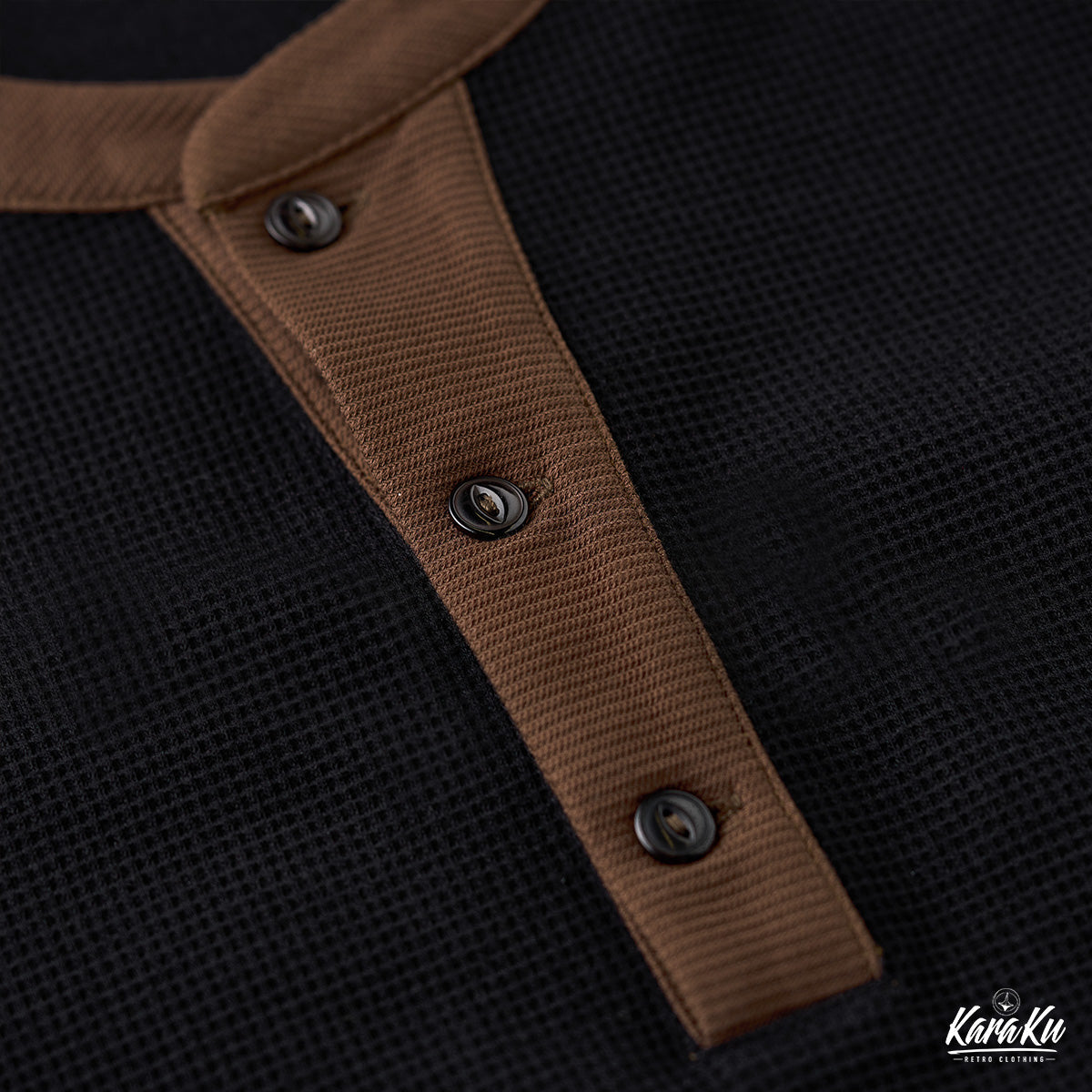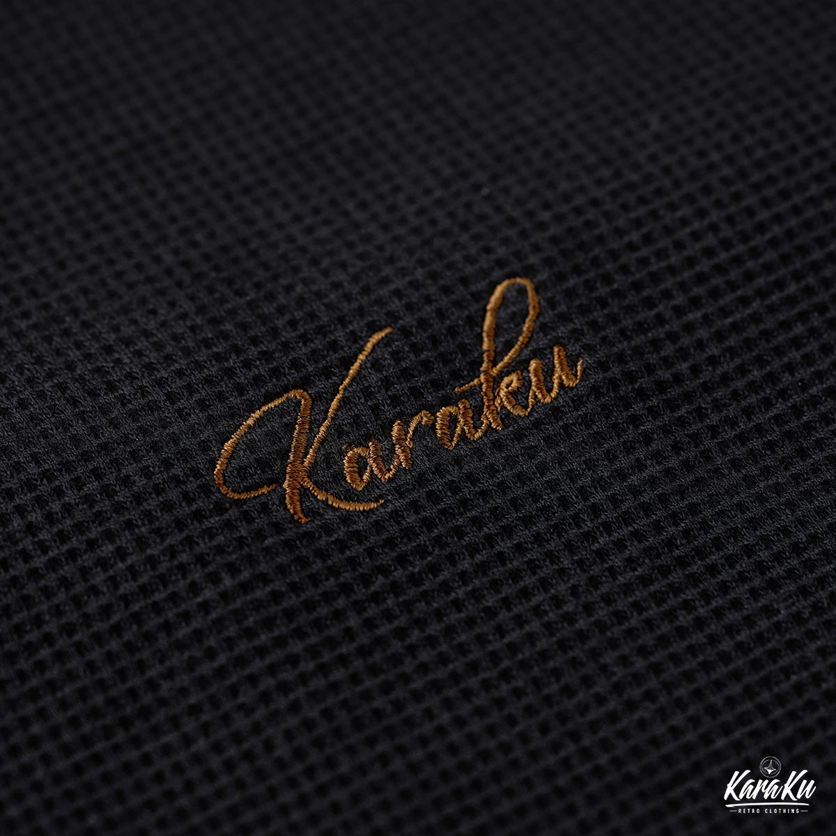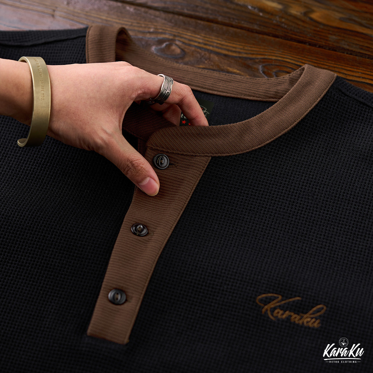 This black top is accented with a luxurious feel with a 3-button henley neck design and a gold embroidered 'KaraKu' logo. The waffle-weave cotton fabric provides comfort and breathability, and the brown color scheme adds a sophisticated feel.