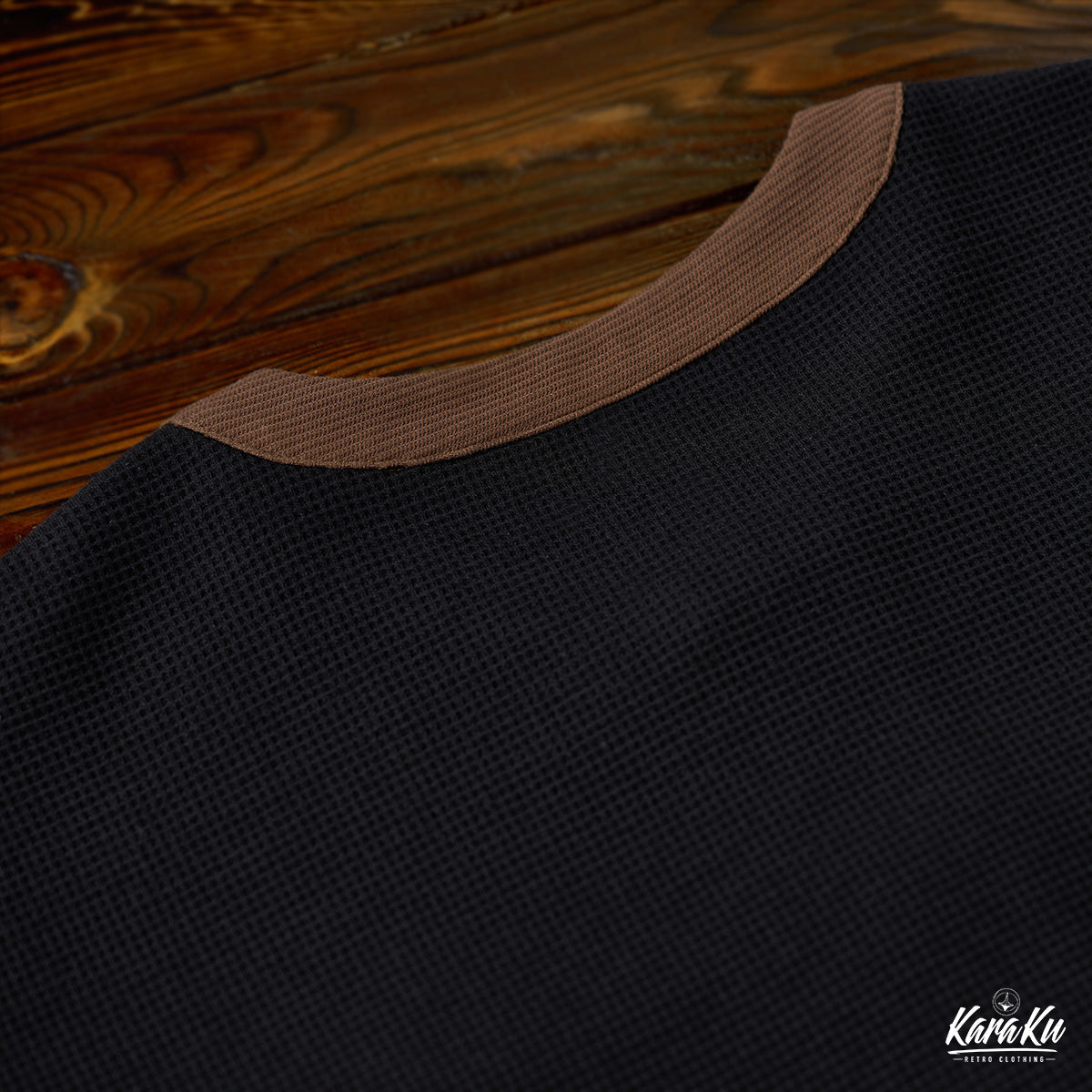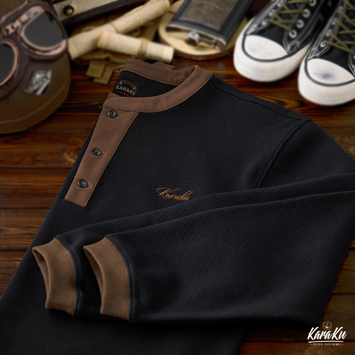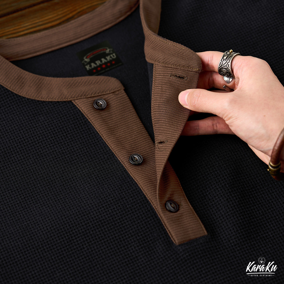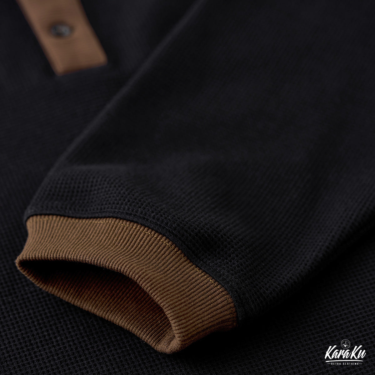 This black top is accented with a luxurious feel with a 3-button henley neck design and a gold embroidered 'KaraKu' logo. The waffle-weave cotton fabric provides comfort and breathability, and the brown color scheme adds a sophisticated feel.