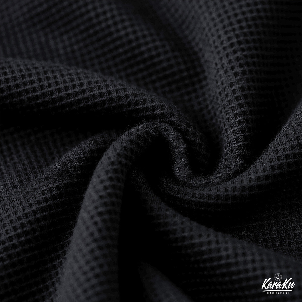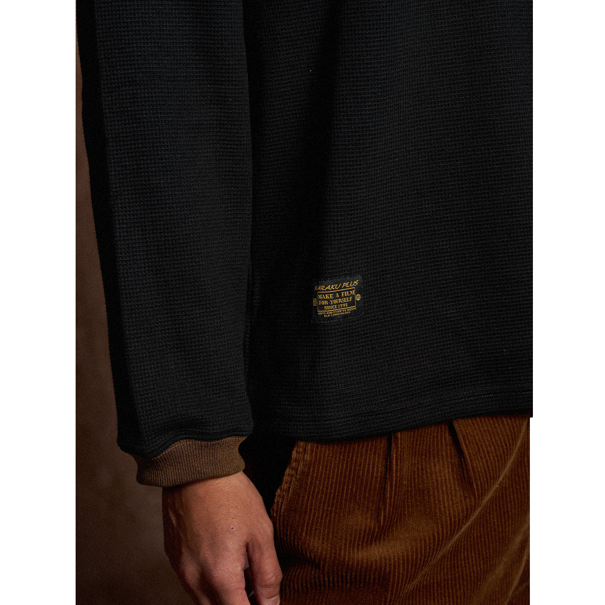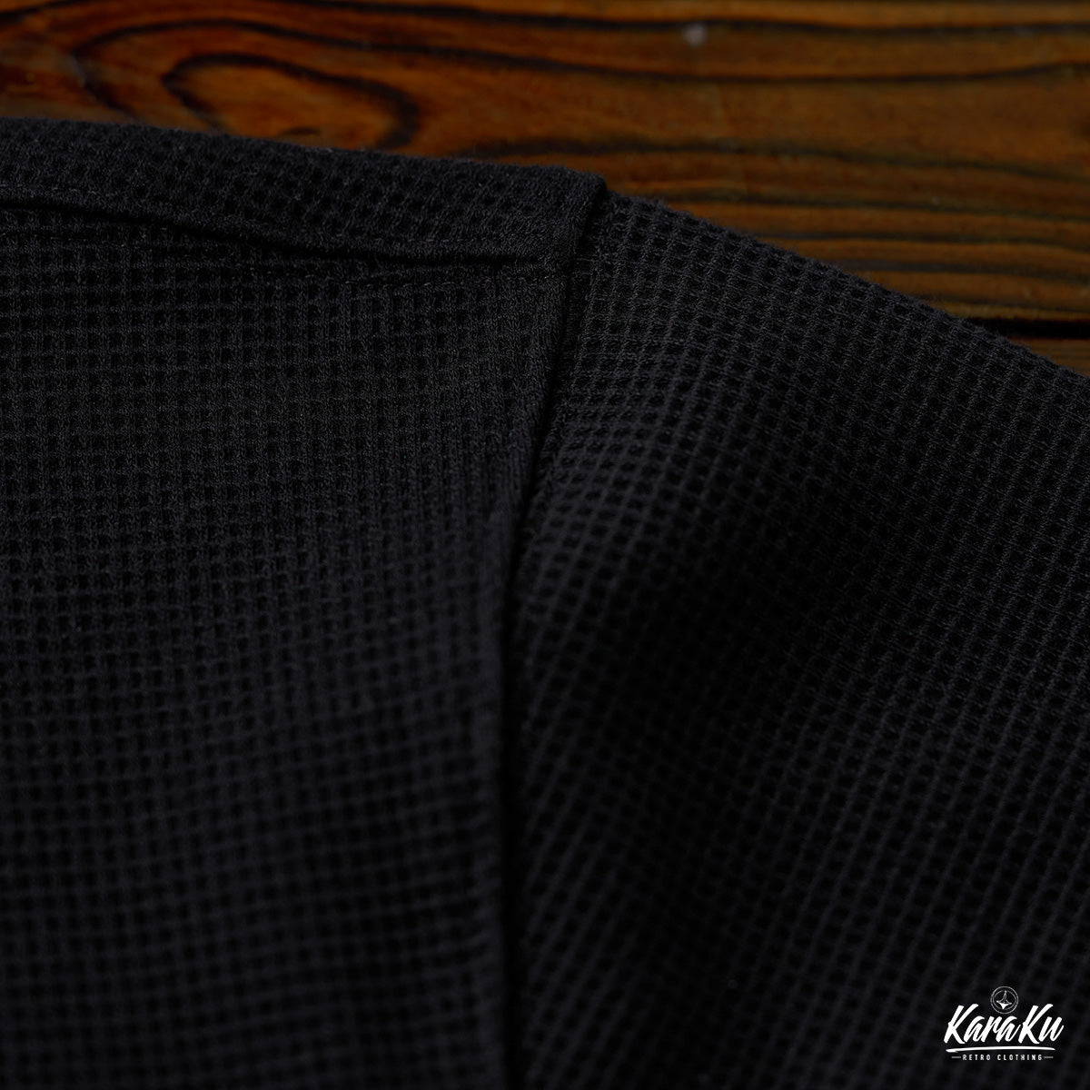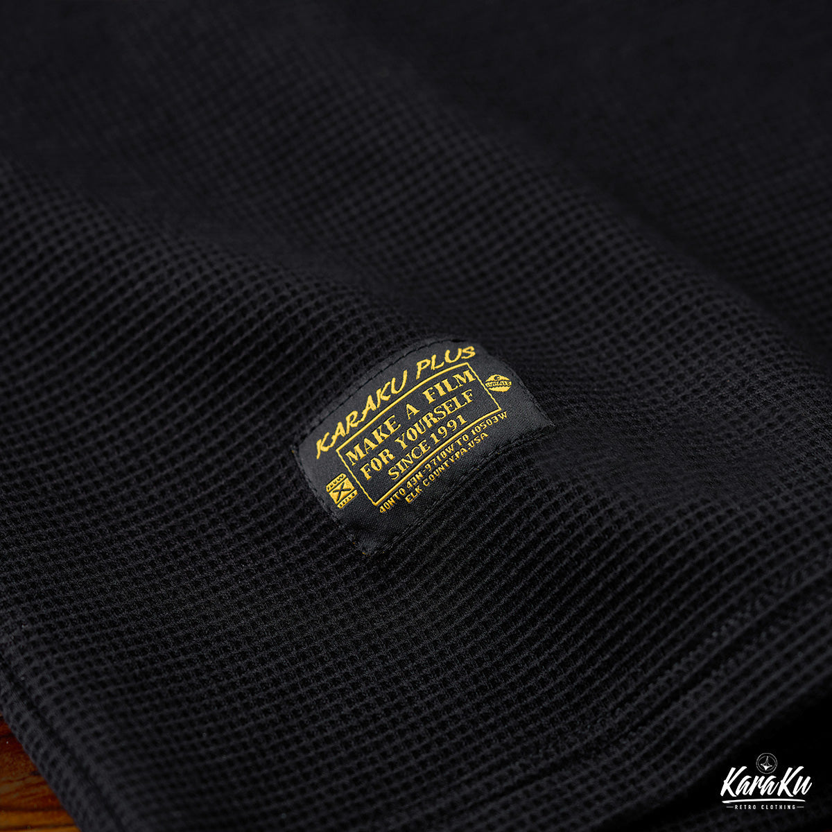 This black top is accented with a luxurious feel with a 3-button henley neck design and a gold embroidered 'KaraKu' logo. The waffle-weave cotton fabric provides comfort and breathability, and the brown color scheme adds a sophisticated feel.