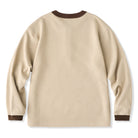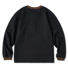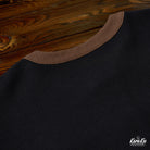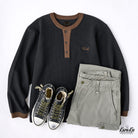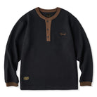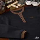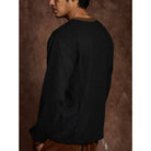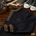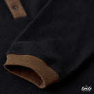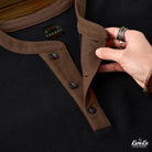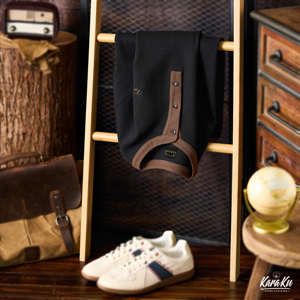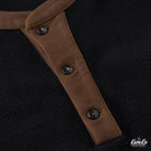 The black color with brown accents on the neck, sleeves, and henley neck button line emphasizes luxury.