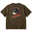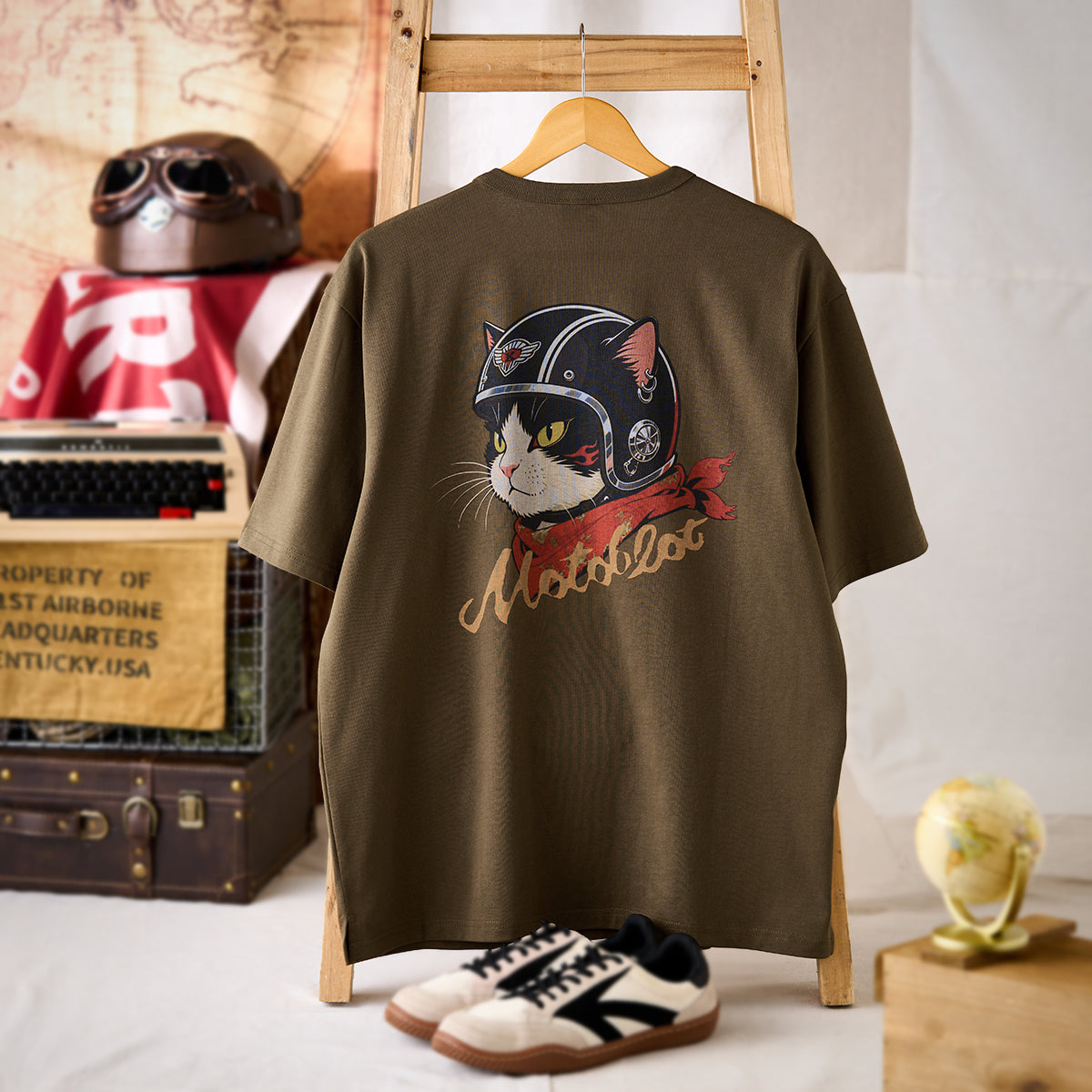 「헬멧 쓴 고양이」프린트 & KaraKu 로고 자수 코튼 티셔츠