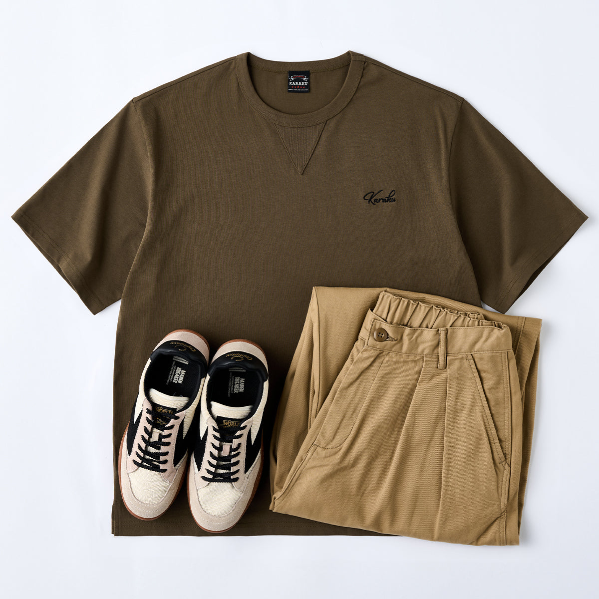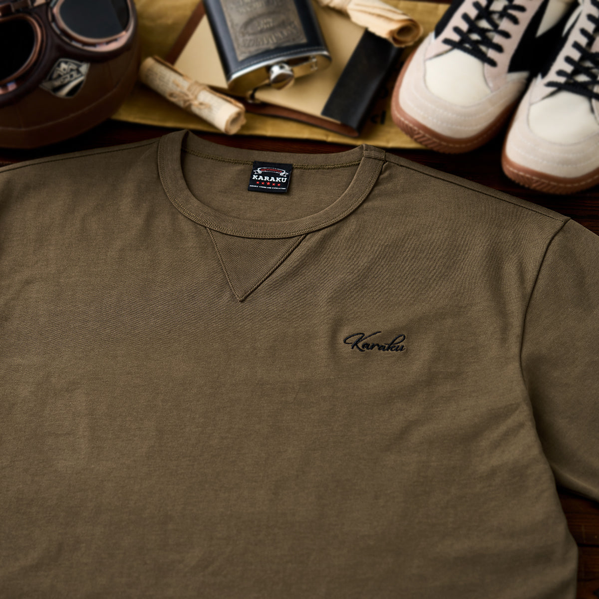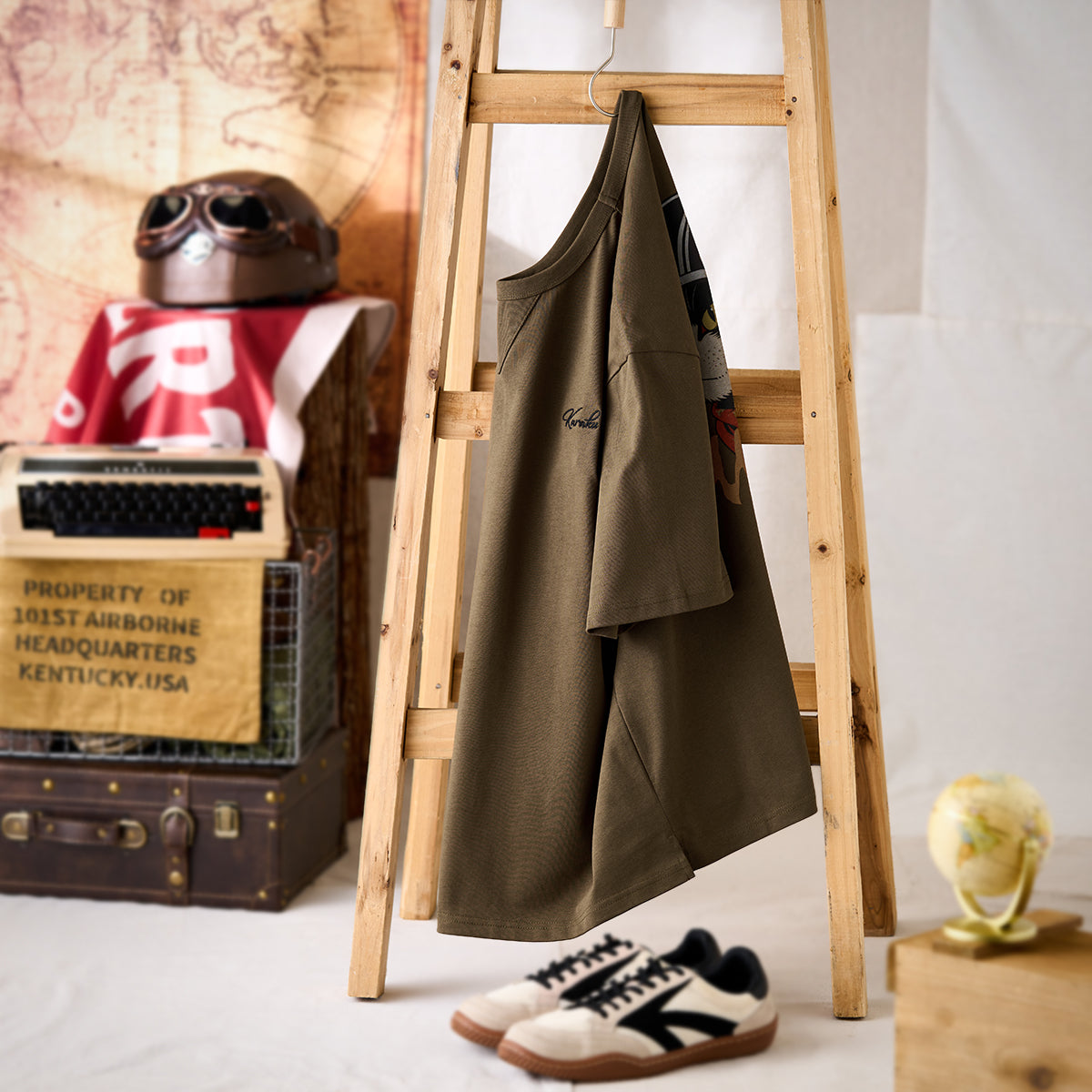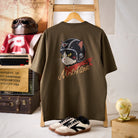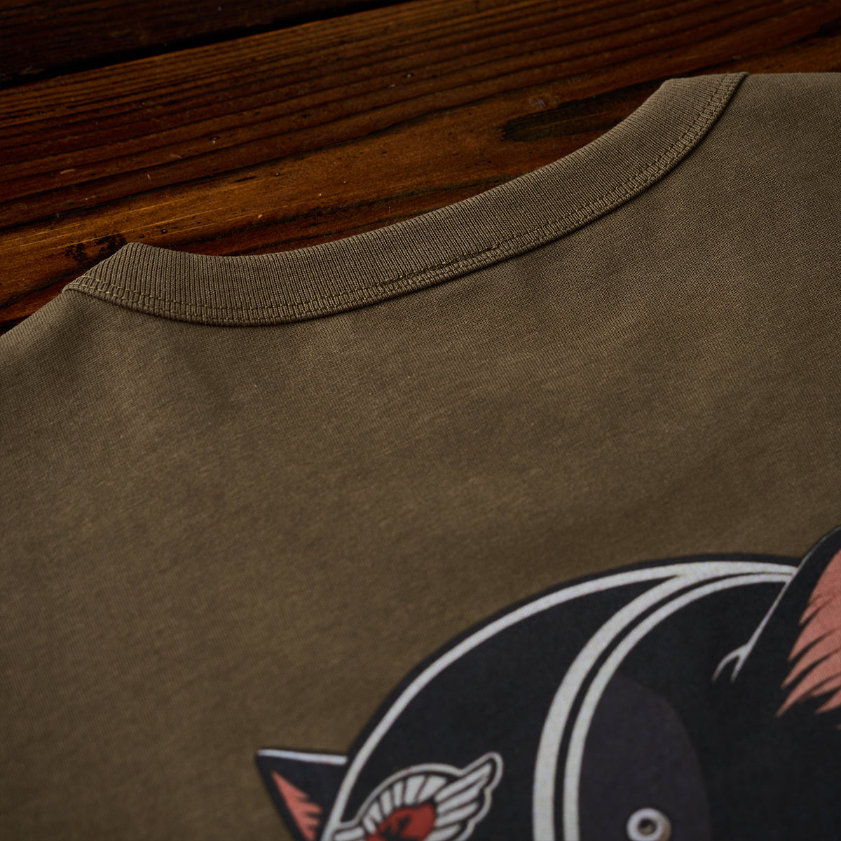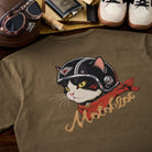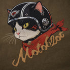 헬멧 쓴 고양이 그래픽에 팝아트와 바이커 무드를 담아 유니크하면서도 친근한 매력을 더한 티셔츠. 아미 그린 바탕에 강렬한 컬러 포인트, 로고 자수와 오토바이 태그로 디테일을 완성했습니다.