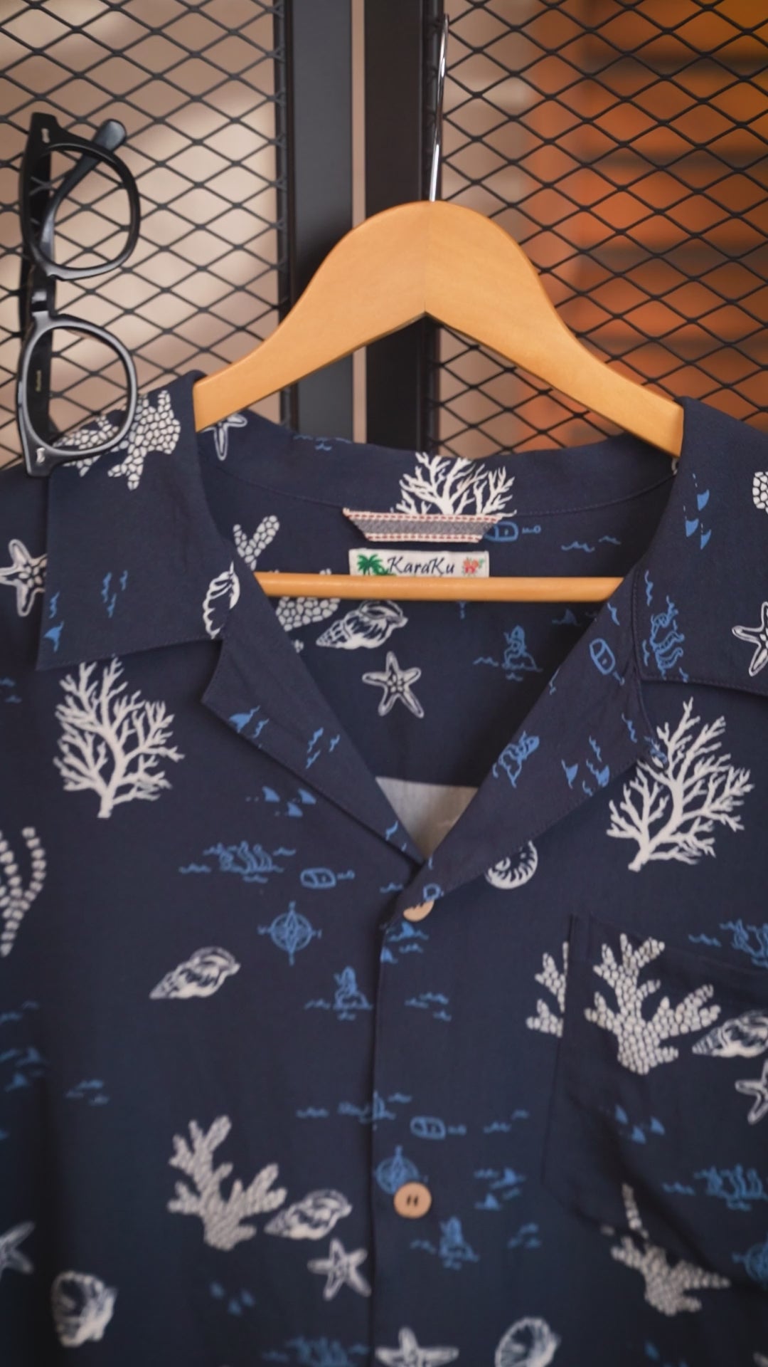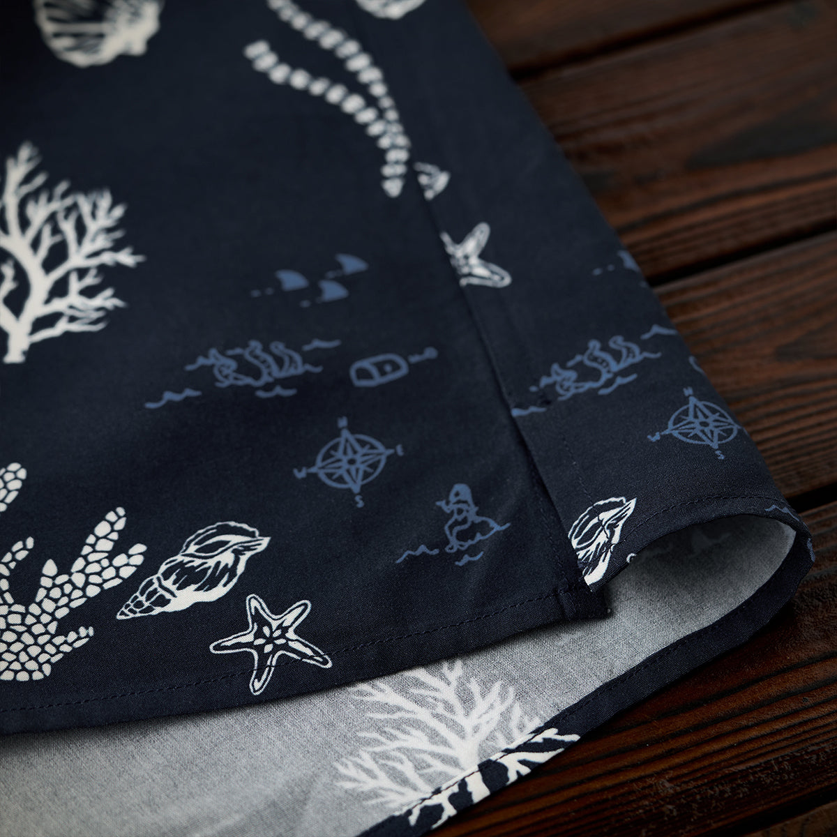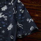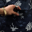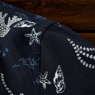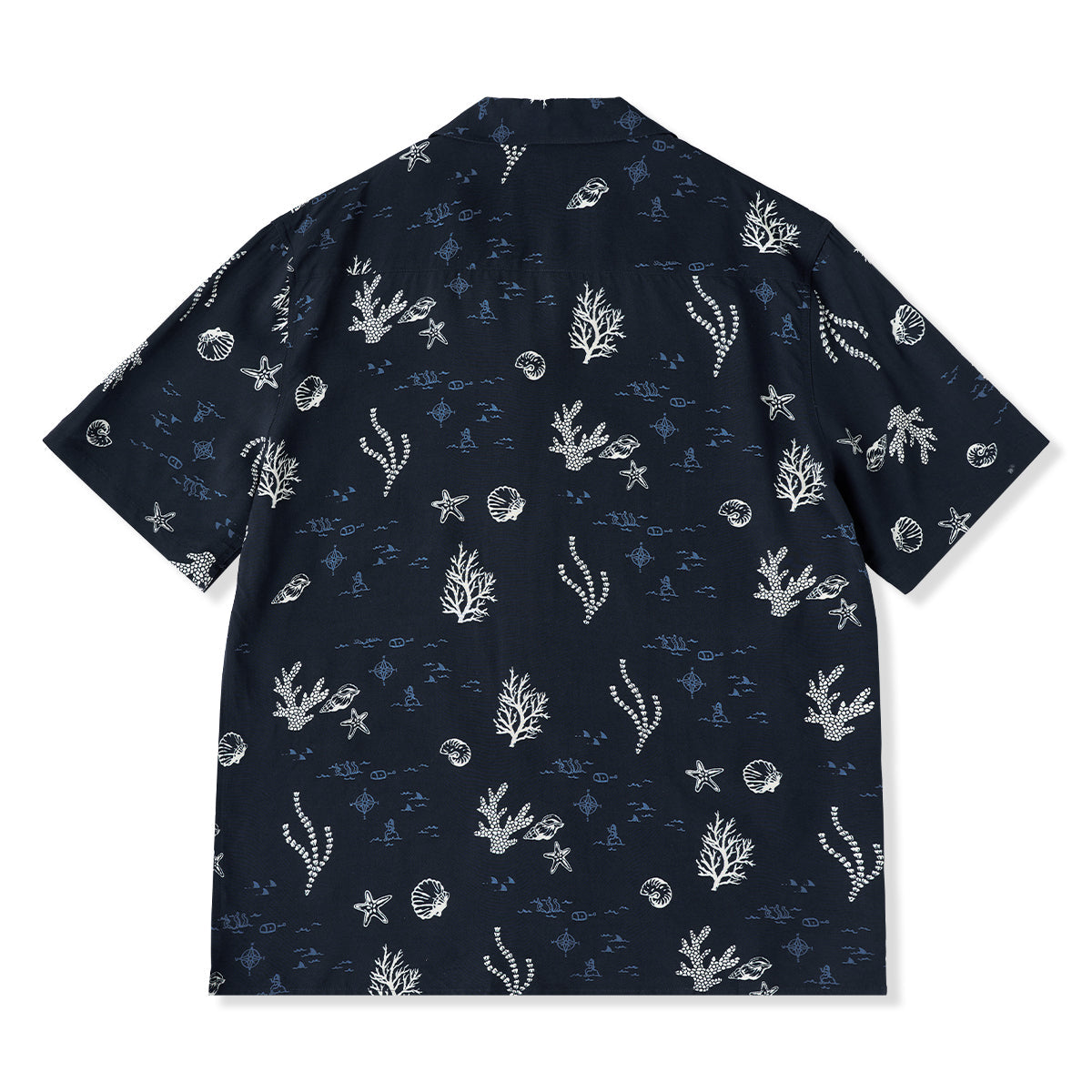 An all-over print aloha shirt themed on the underwater world, featuring a beautiful contrast of white and dark navy.