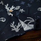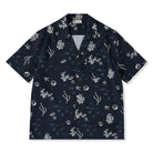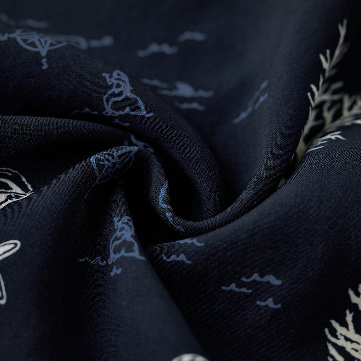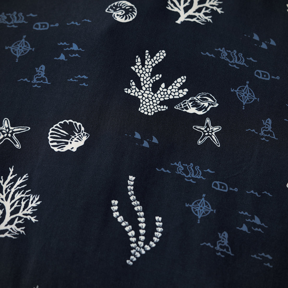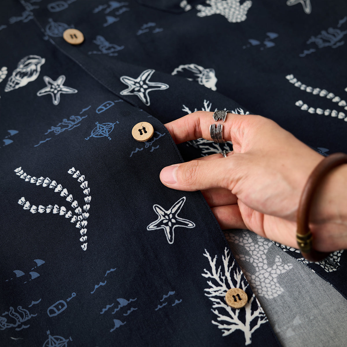 An all-over print aloha shirt themed on the underwater world, featuring a beautiful contrast of white and dark navy.