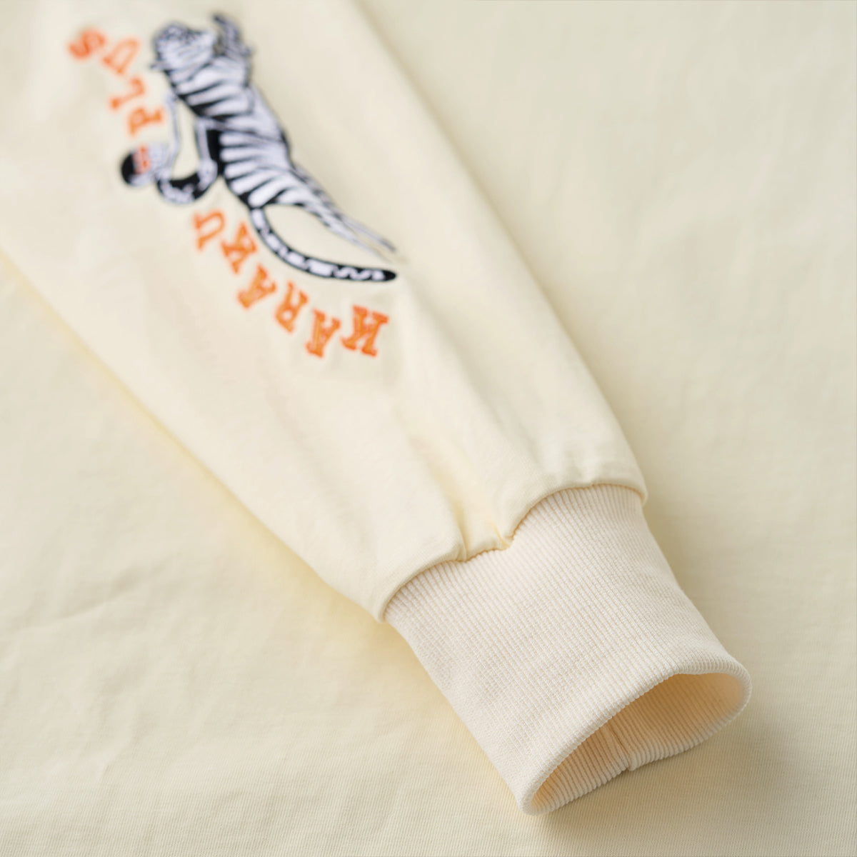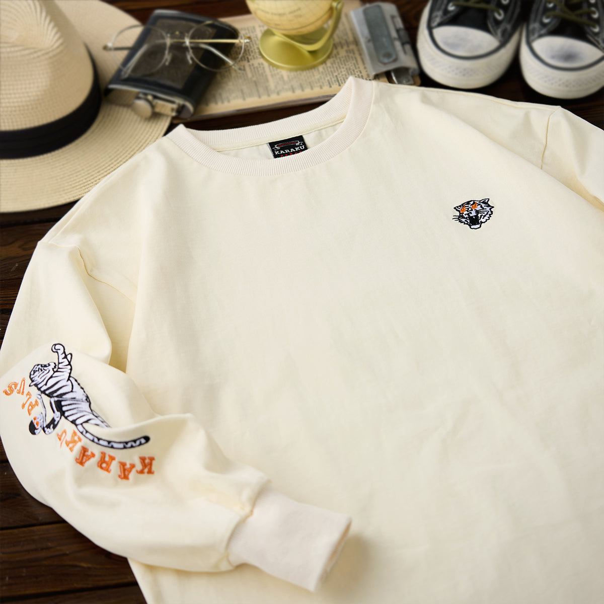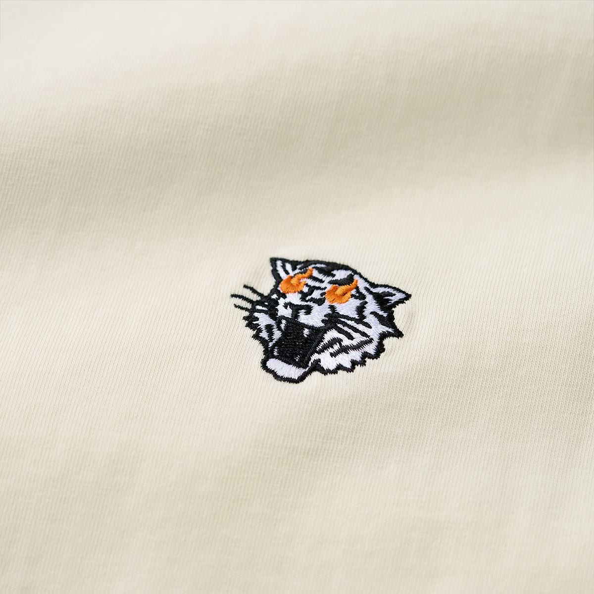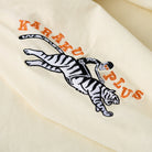 The chest is embroidered with a roaring tiger with sharp eyes, symbolizing strength and majesty. On both sleeves, a dynamic graphic embroidery of a skeleton riding a tiger proudly expresses a free spirit. The tiger represents strength and indomitable spirit, and the skeleton rider represents courage that does not fear death, further highlighting the wearer's individuality.