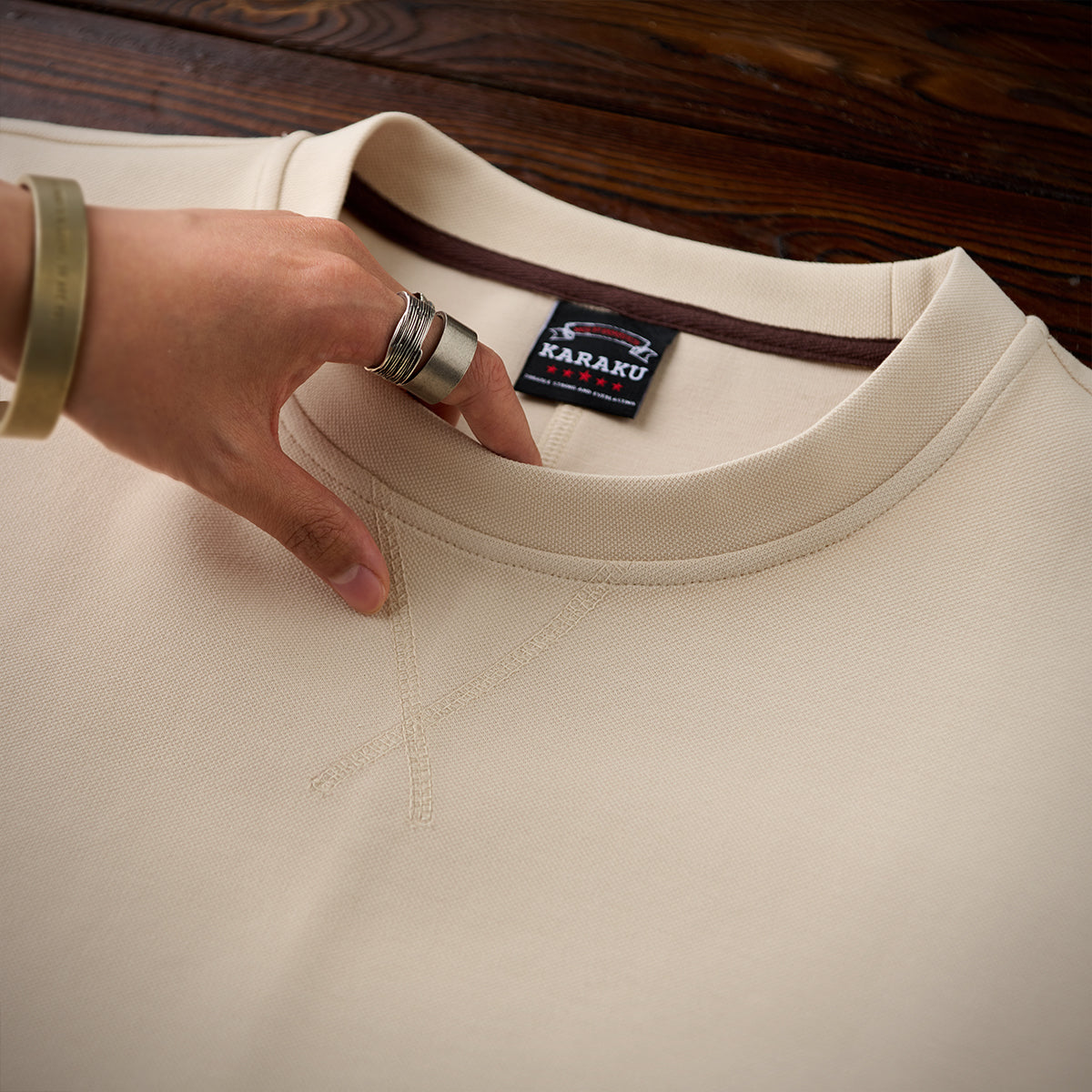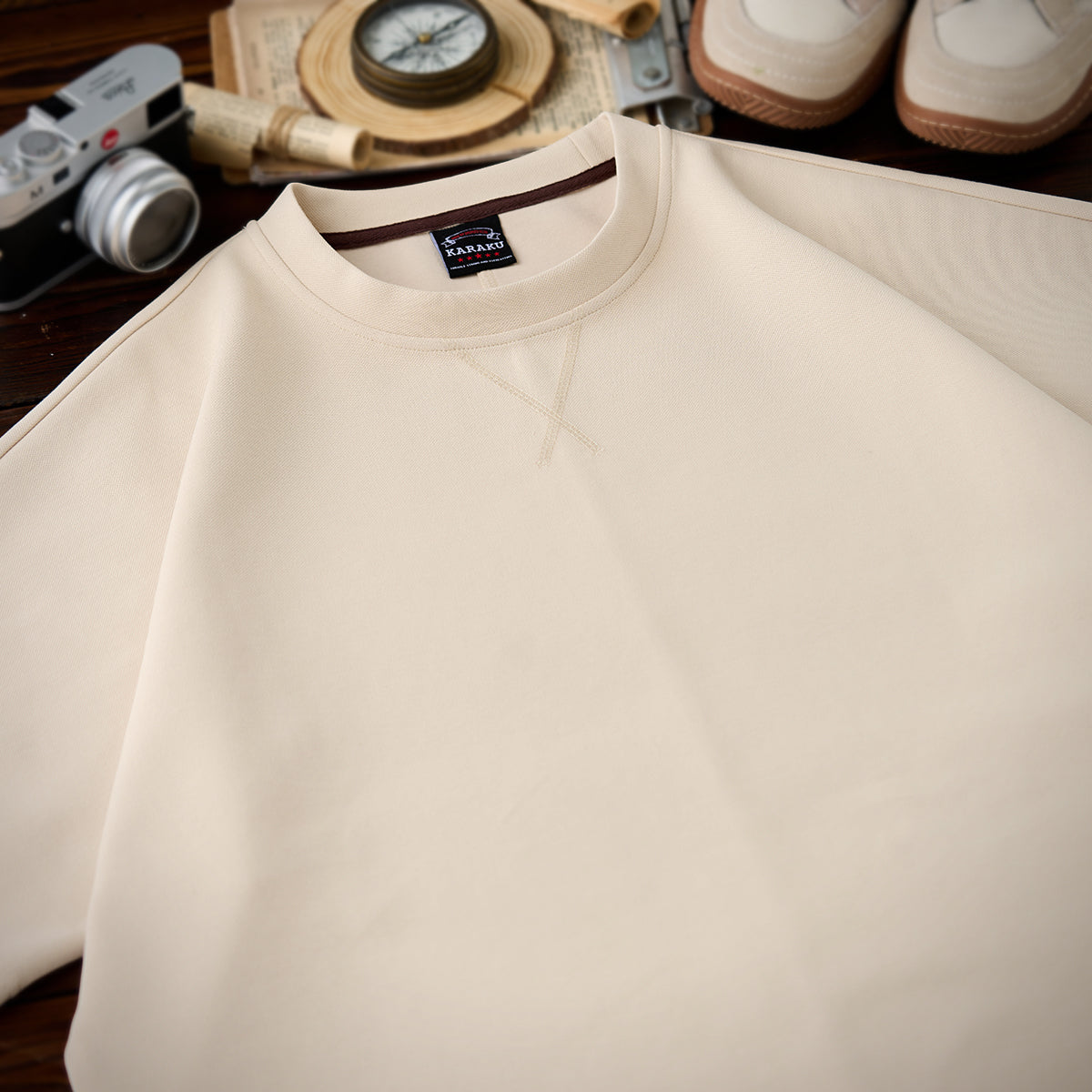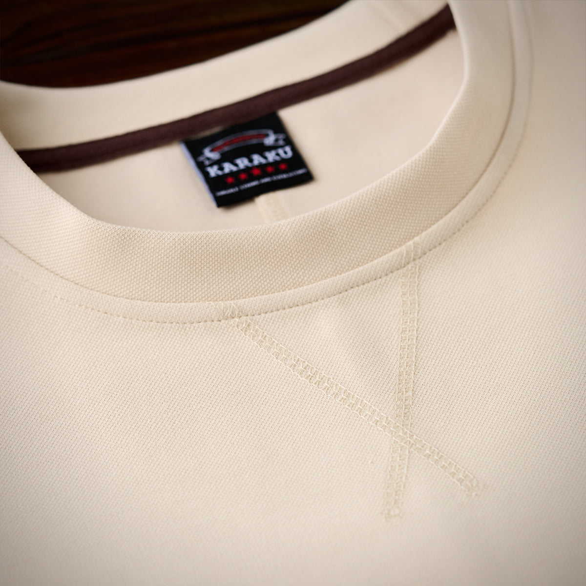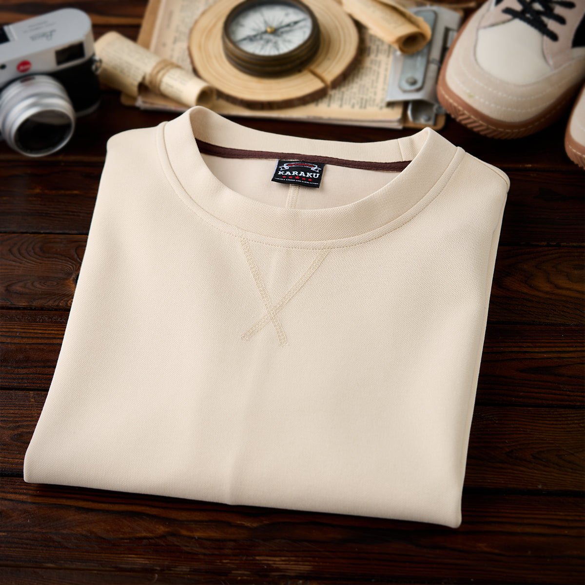 Featuring a front-stitched triangle detail inspired by 1930s US Navy training suits, the crew neck design and double-stitched finish create a simple yet clean look.