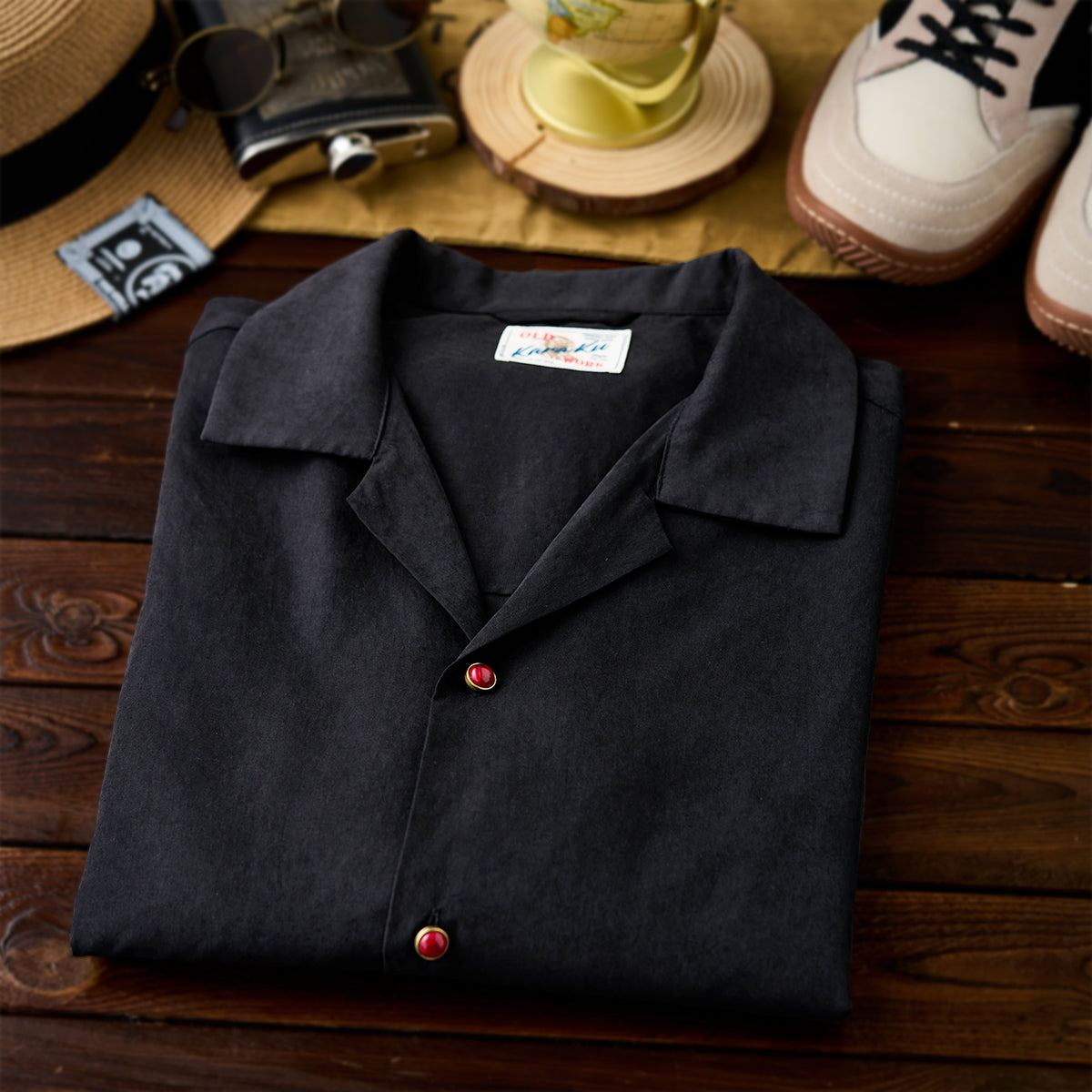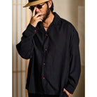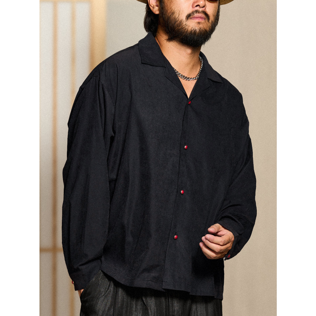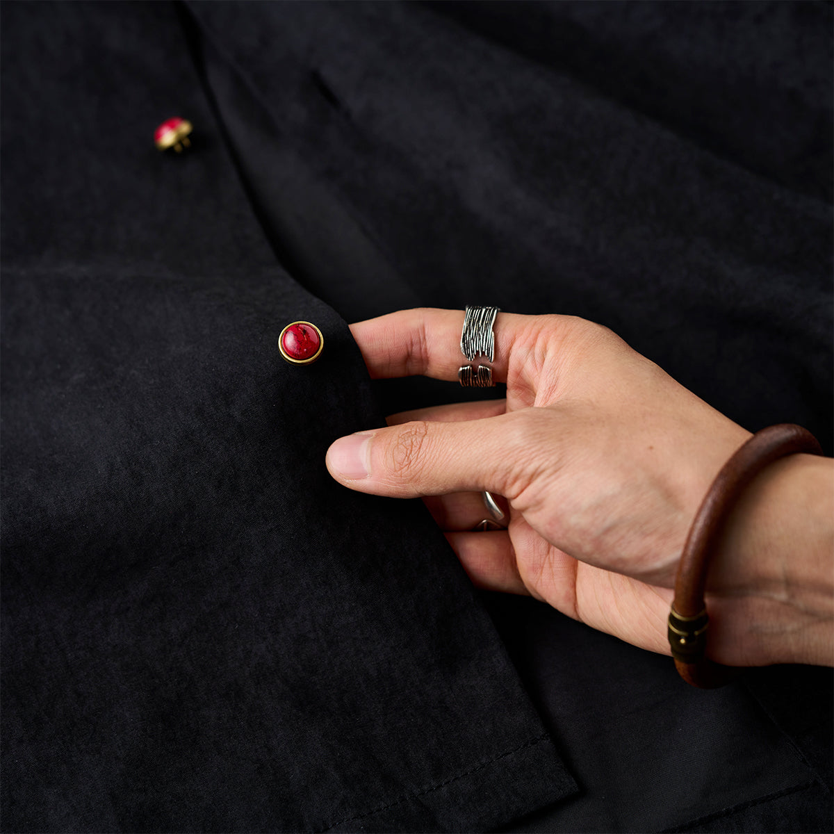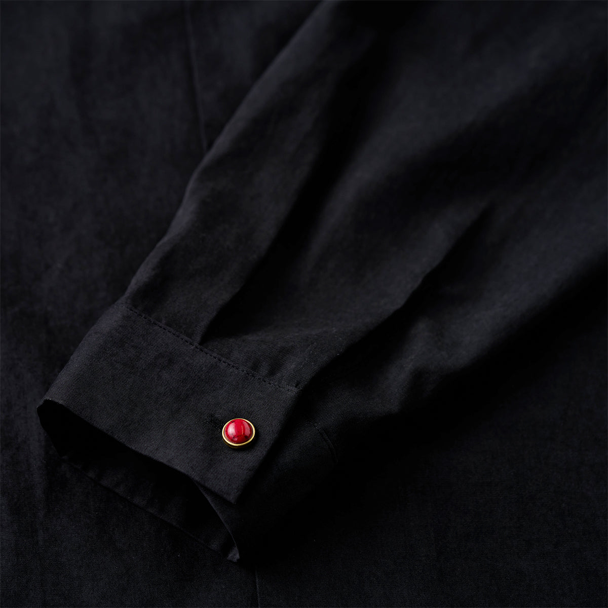 블랙 바탕 셔츠에 따뜻한 톤의 레드 아게이트 버튼을 배치해 은은한 포인트를 더했습니다. 단조로운 컬러 속에서도 시선을 끄는 디테일로, 심플하면서도 세련된 분위기를 완성합니다.