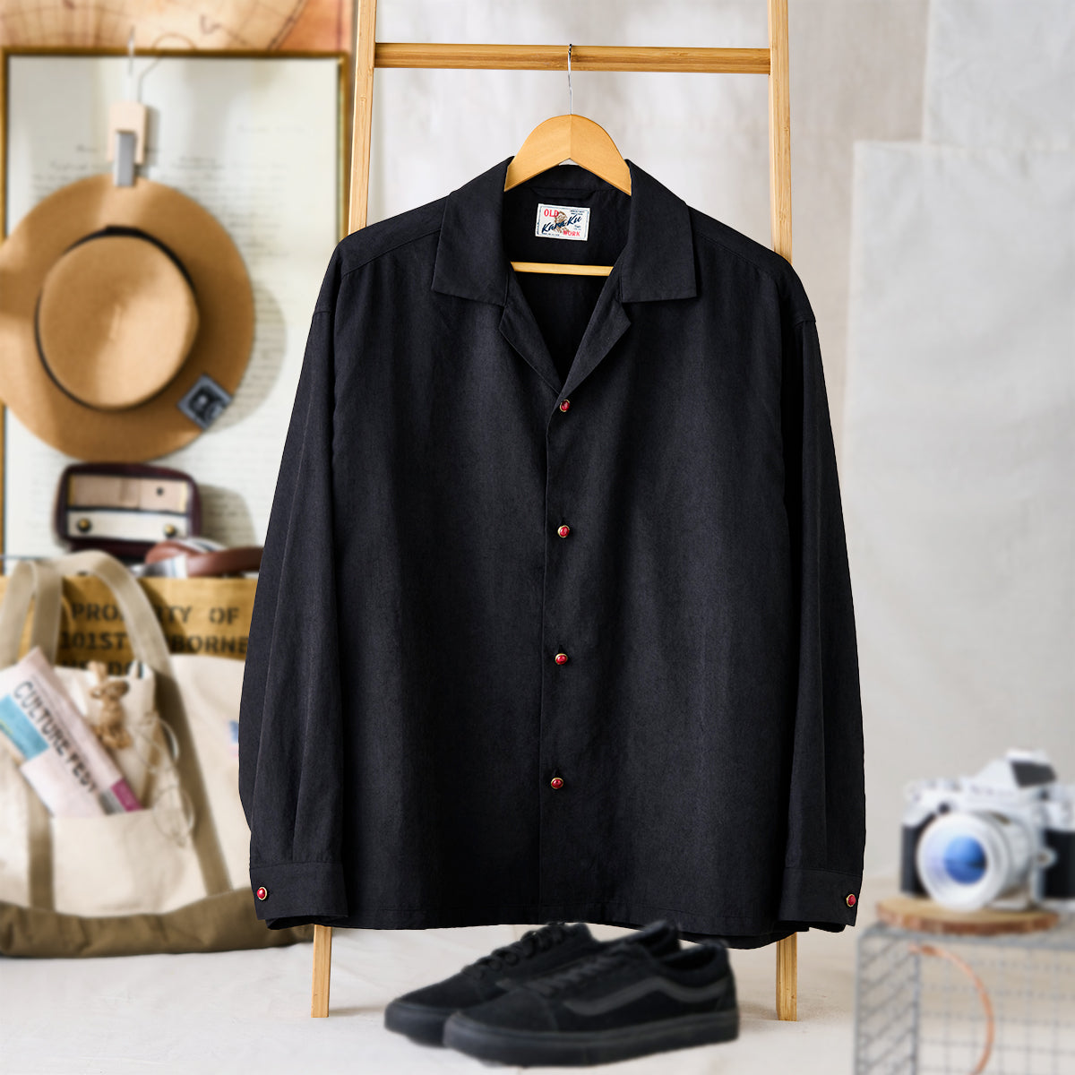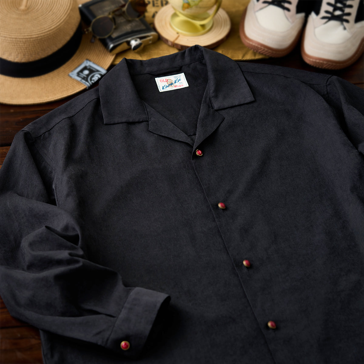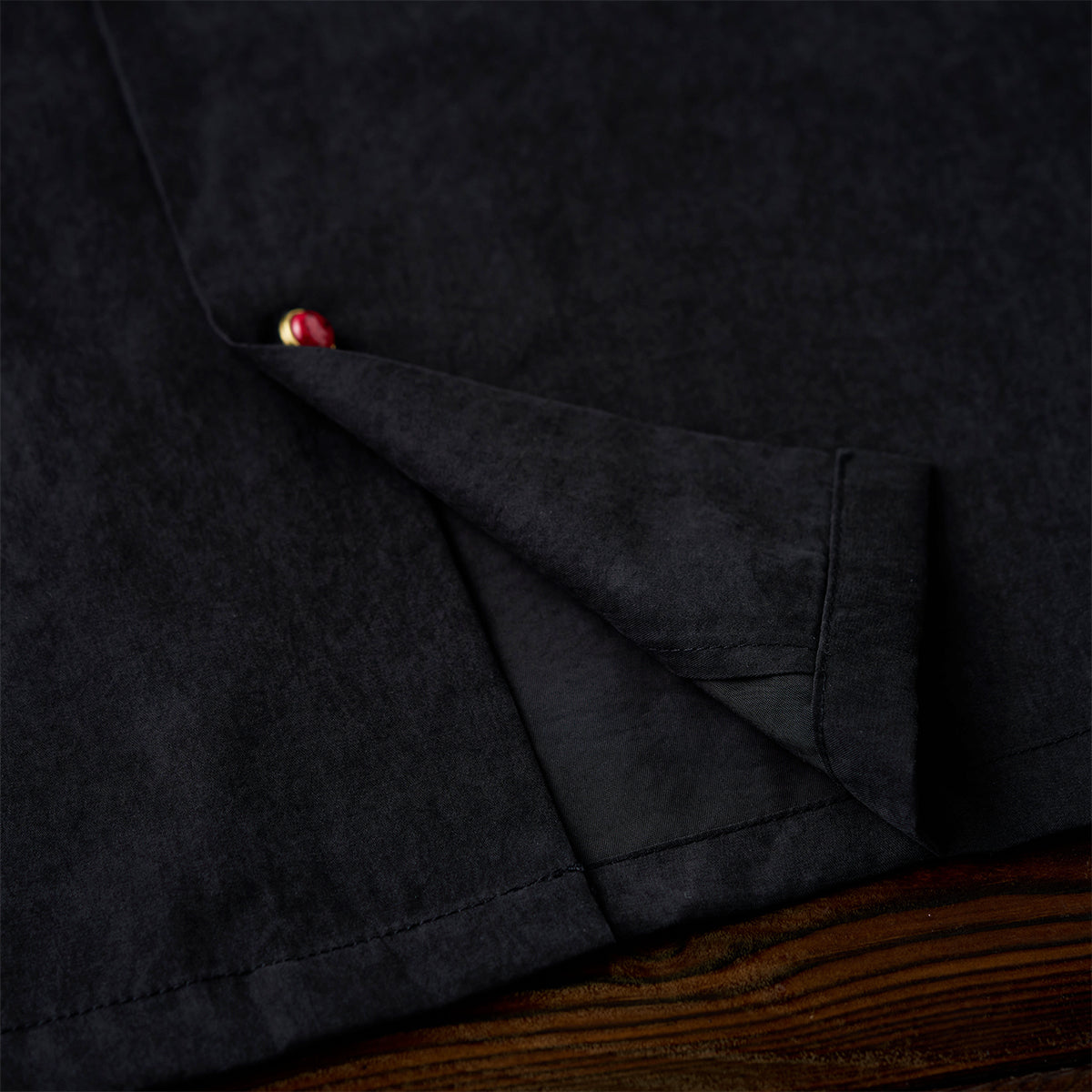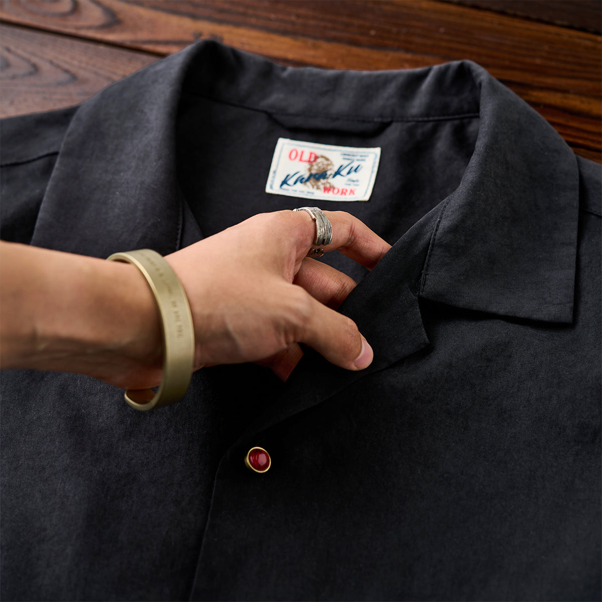 블랙 바탕 셔츠에 따뜻한 톤의 레드 아게이트 버튼을 배치해 은은한 포인트를 더했습니다. 단조로운 컬러 속에서도 시선을 끄는 디테일로, 심플하면서도 세련된 분위기를 완성합니다.