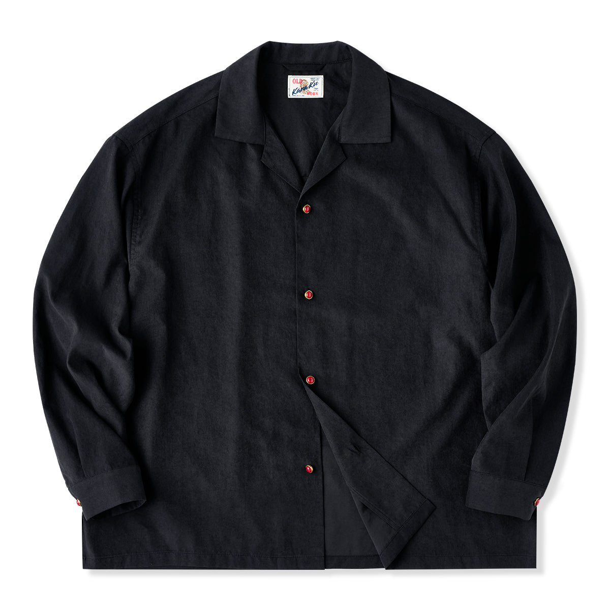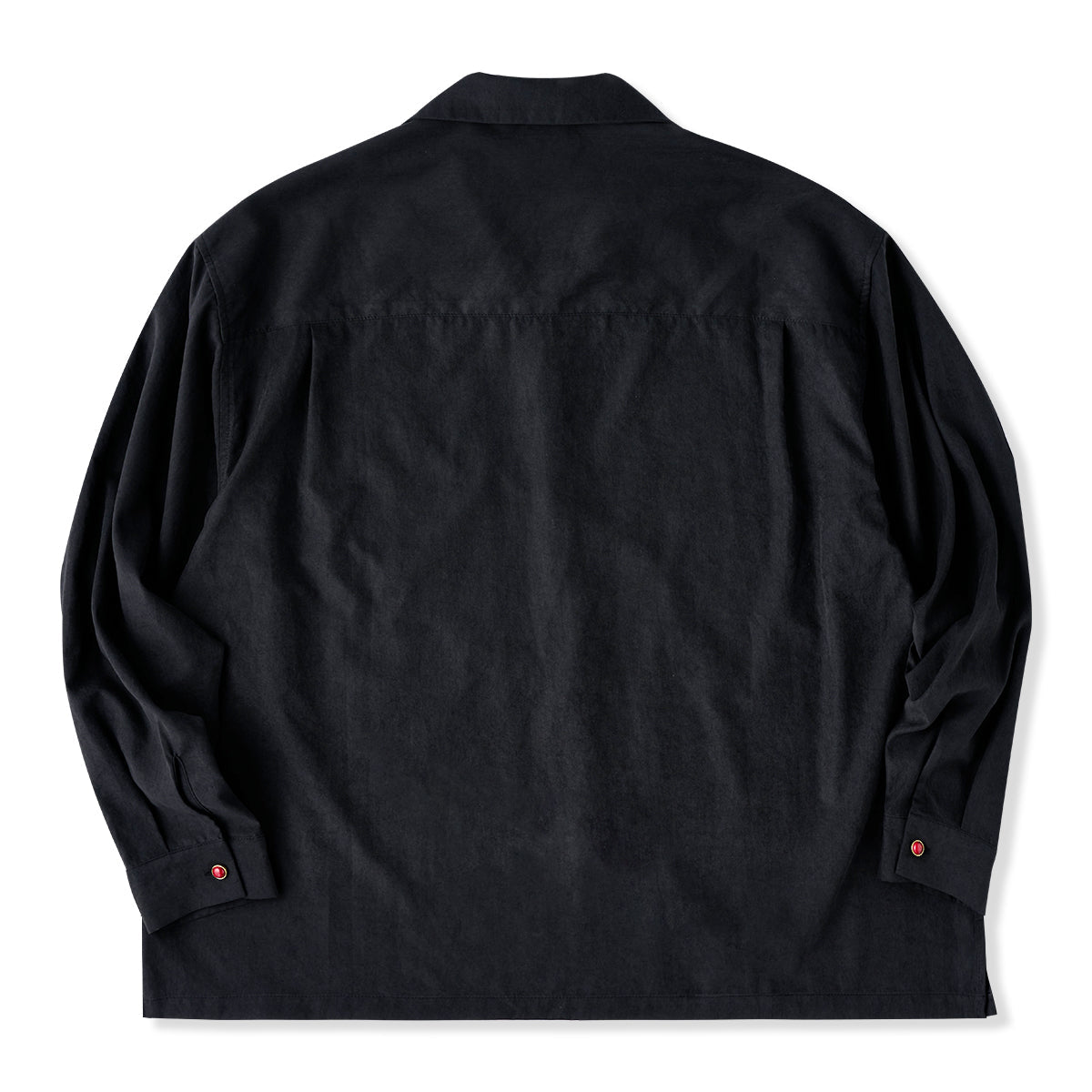 부드러운 피치스킨 오픈칼라 셔츠로, 레드 아게이트 느낌 버튼이 은은한 포인트를 주며, 편안한 실루엣과 드레이프감으로 단독 착용이나 레이어드 모두 가능한 아이템입니다.