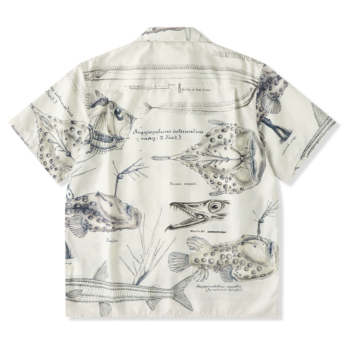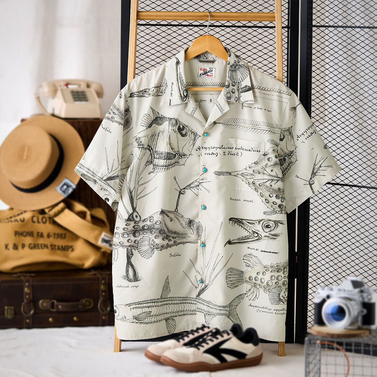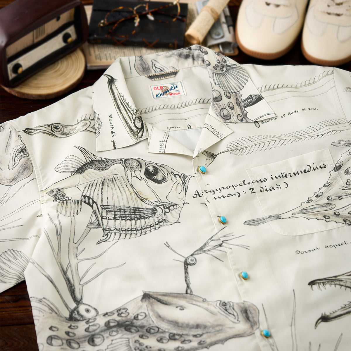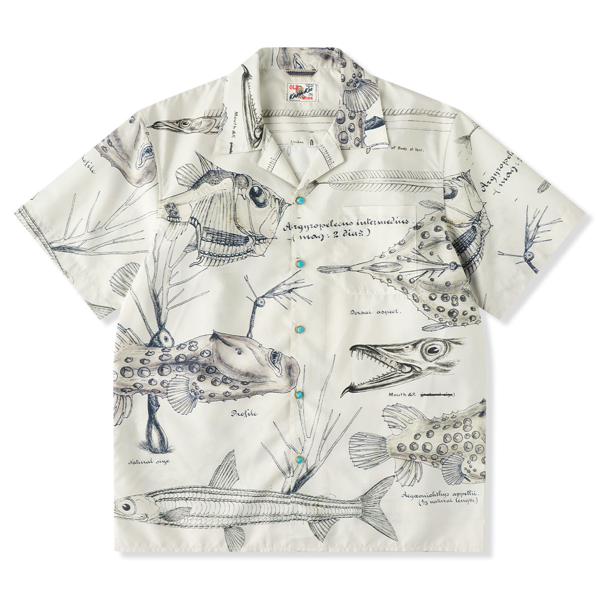 손그림「심해 생물 도감」터키석 단추 오픈칼라 셔츠