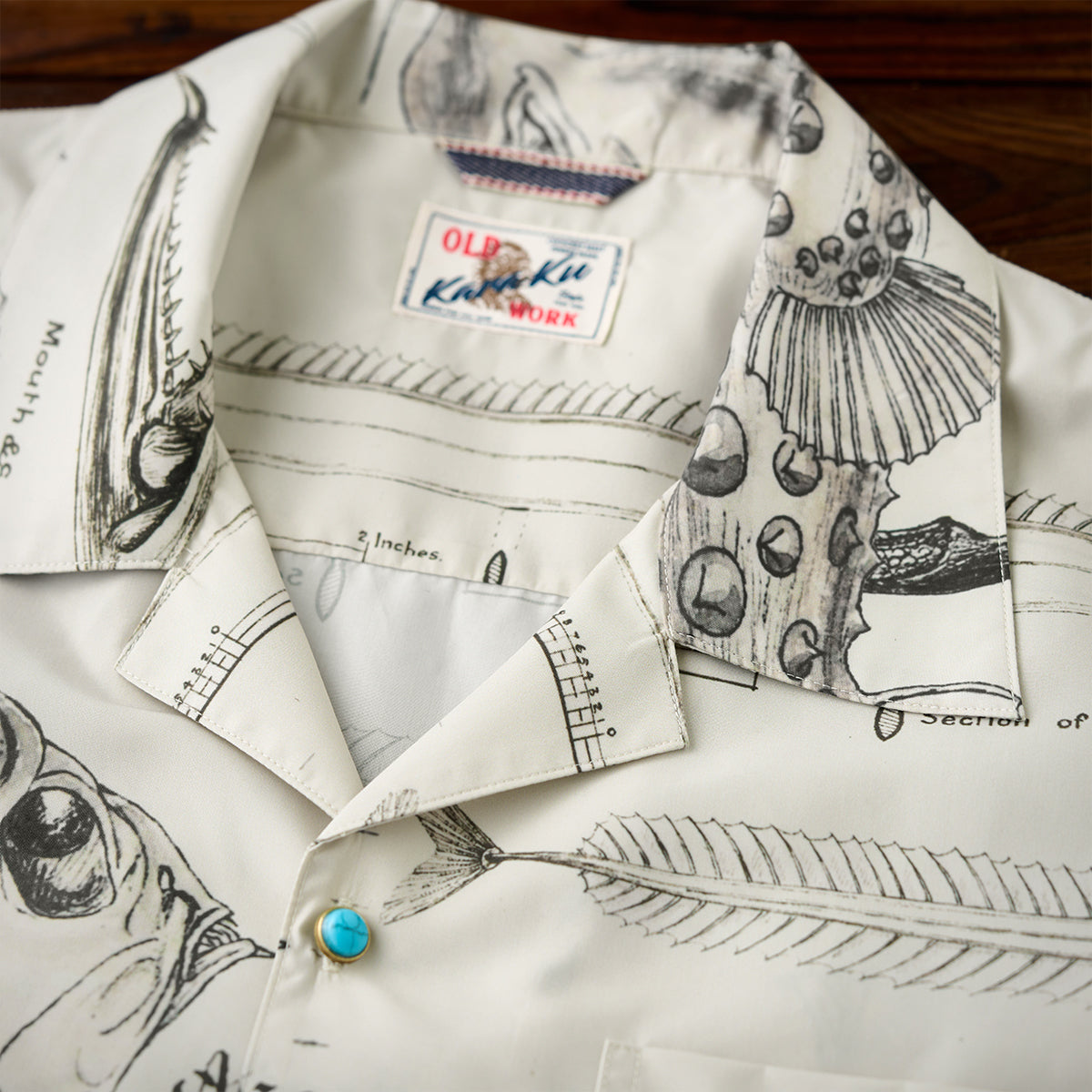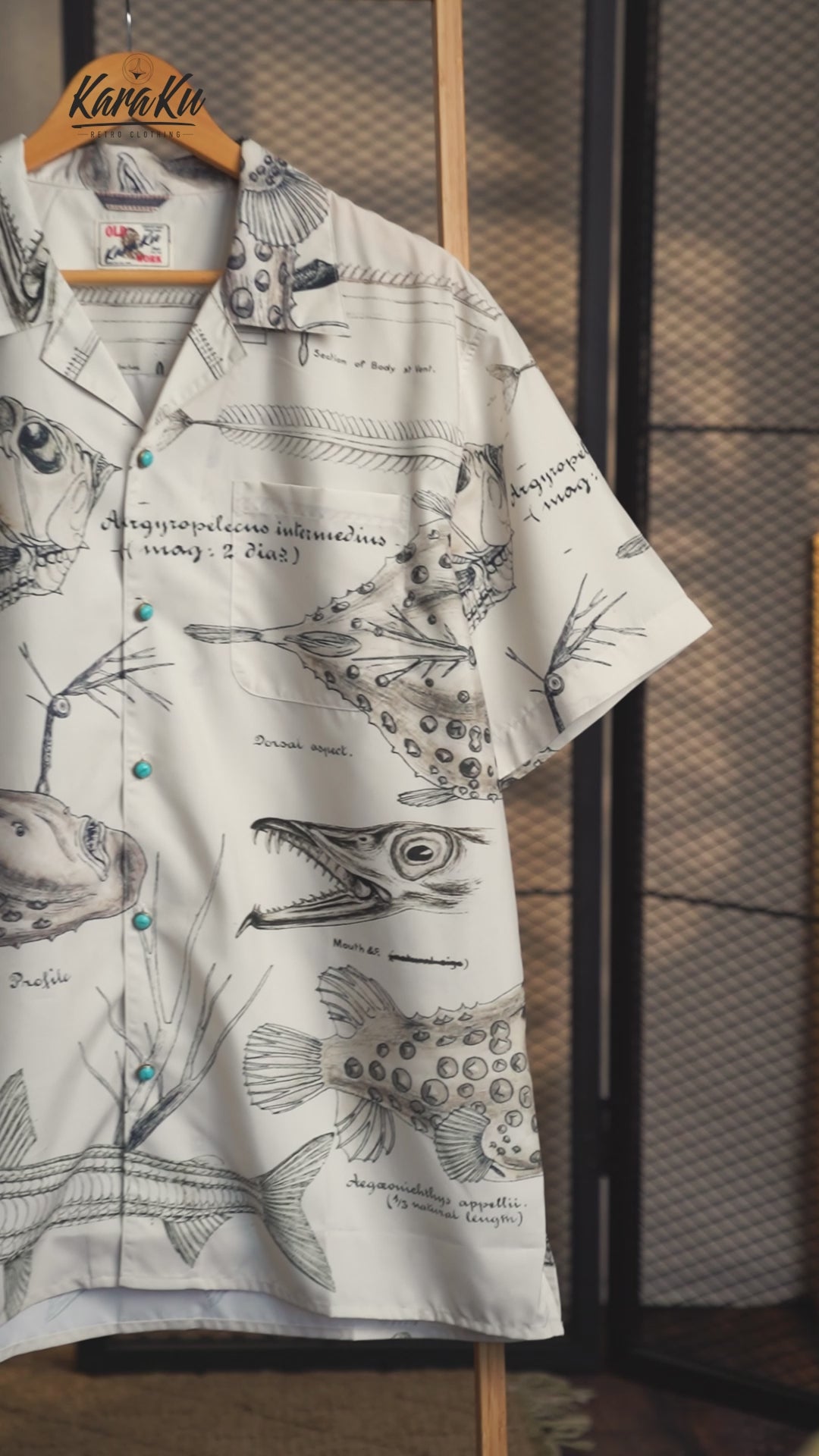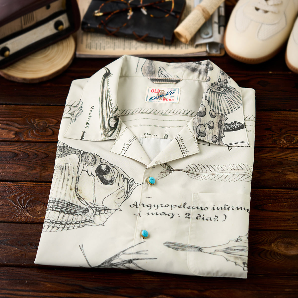 손그림「심해 생물 도감」터키석 단추 오픈칼라 셔츠