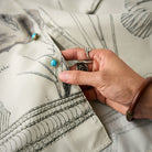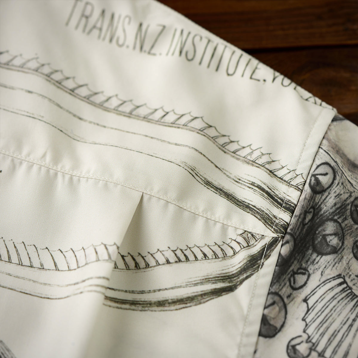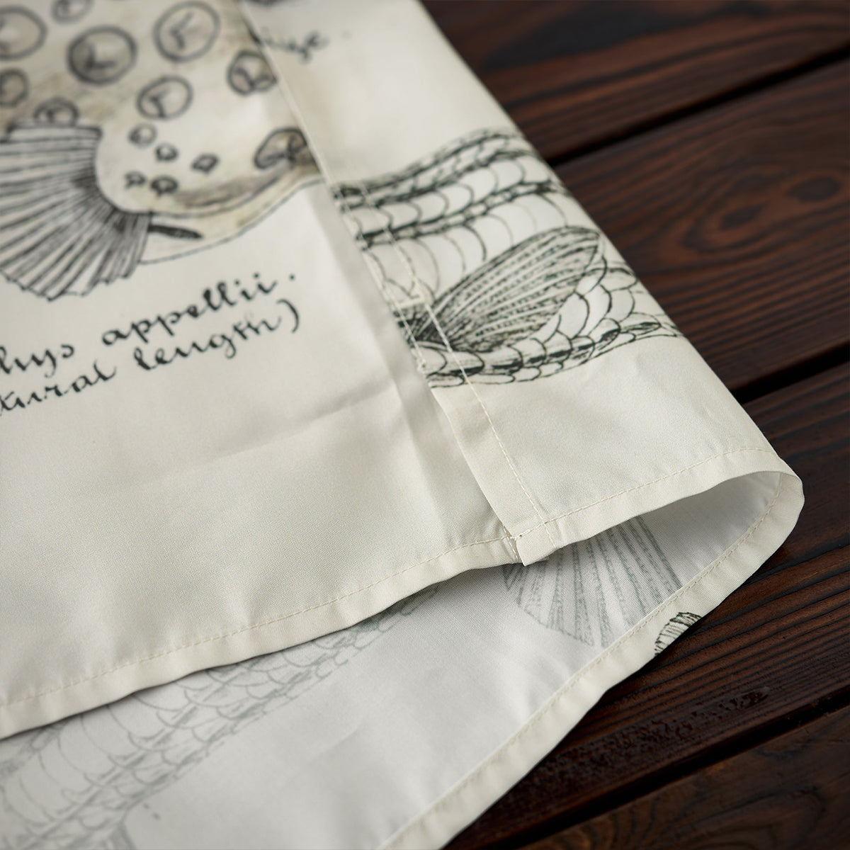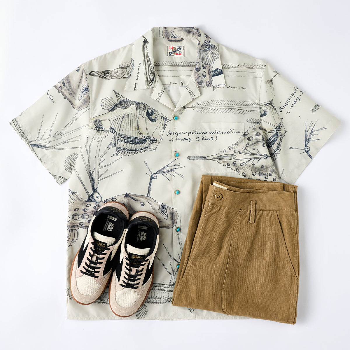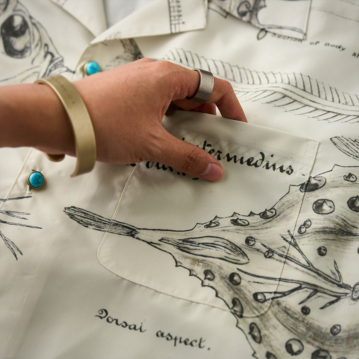 손그림「심해 생물 도감」터키석 단추 오픈칼라 셔츠