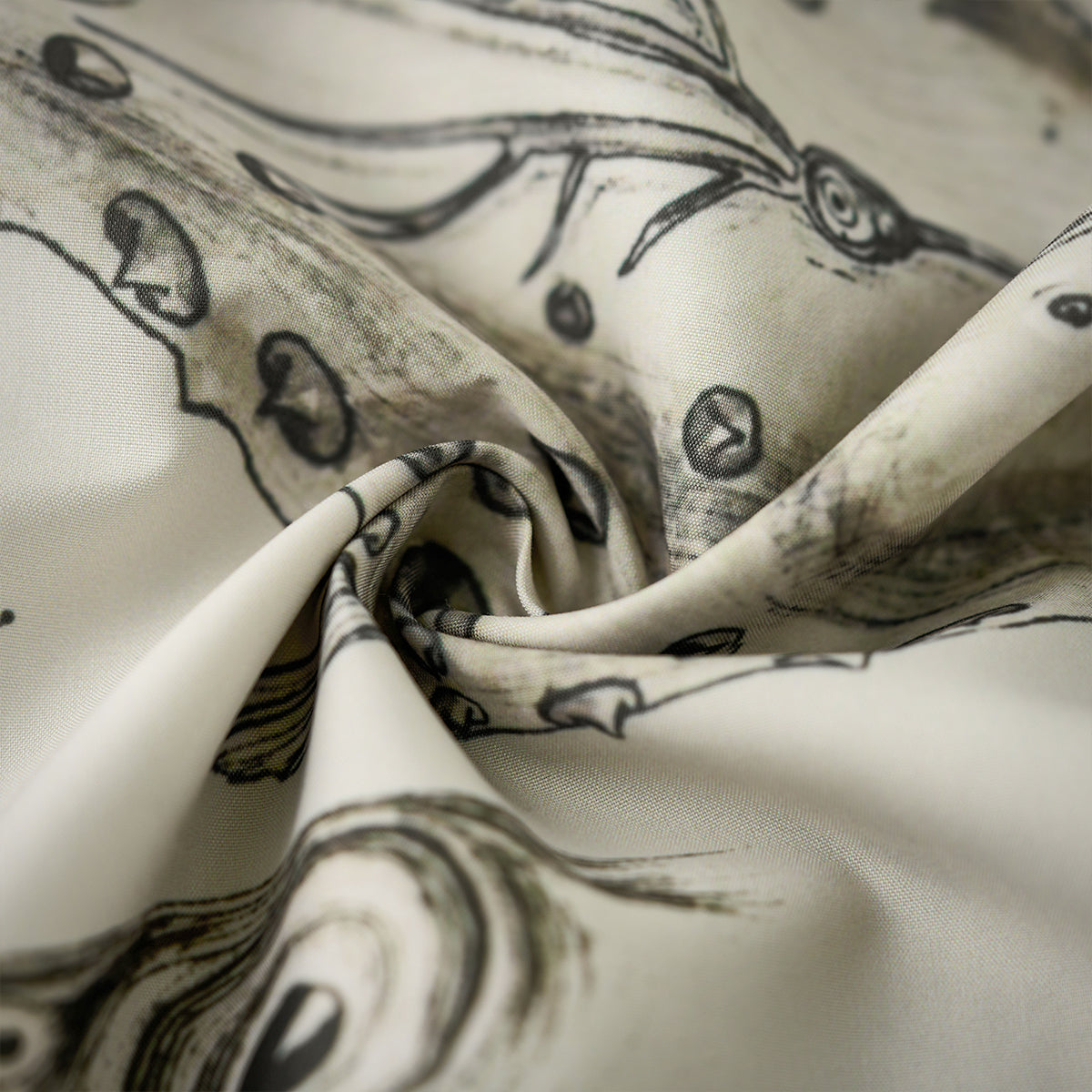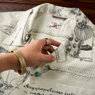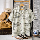 심해 생물 손그림 스타일의 오픈 칼라 셔츠로, 터키석 느낌 단추와 편안한 핏이 여름철 경쾌한 스타일을 완성합니다.