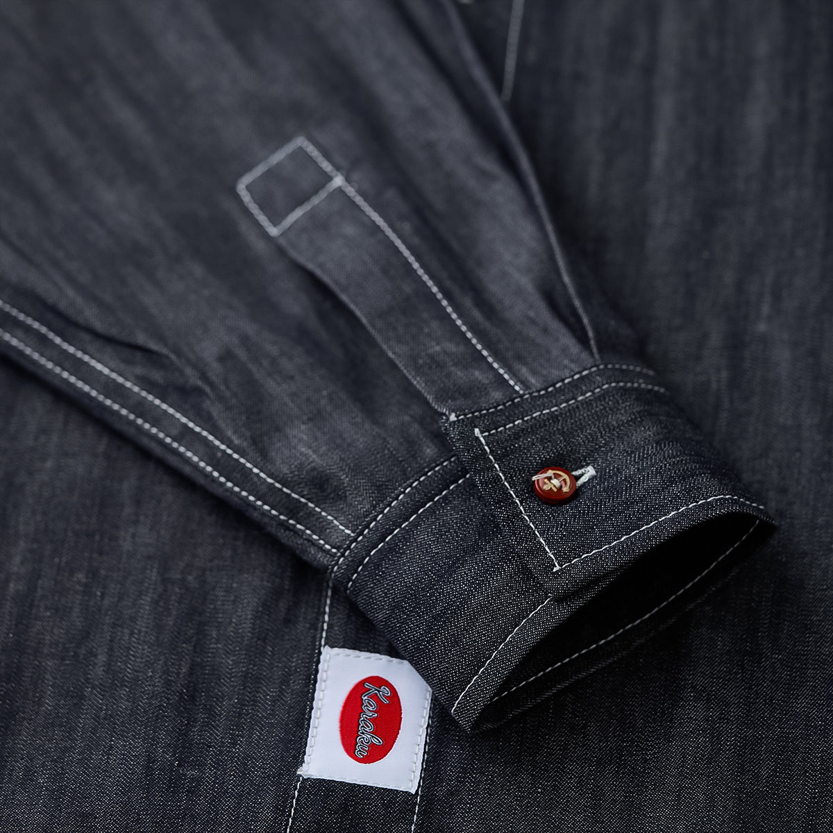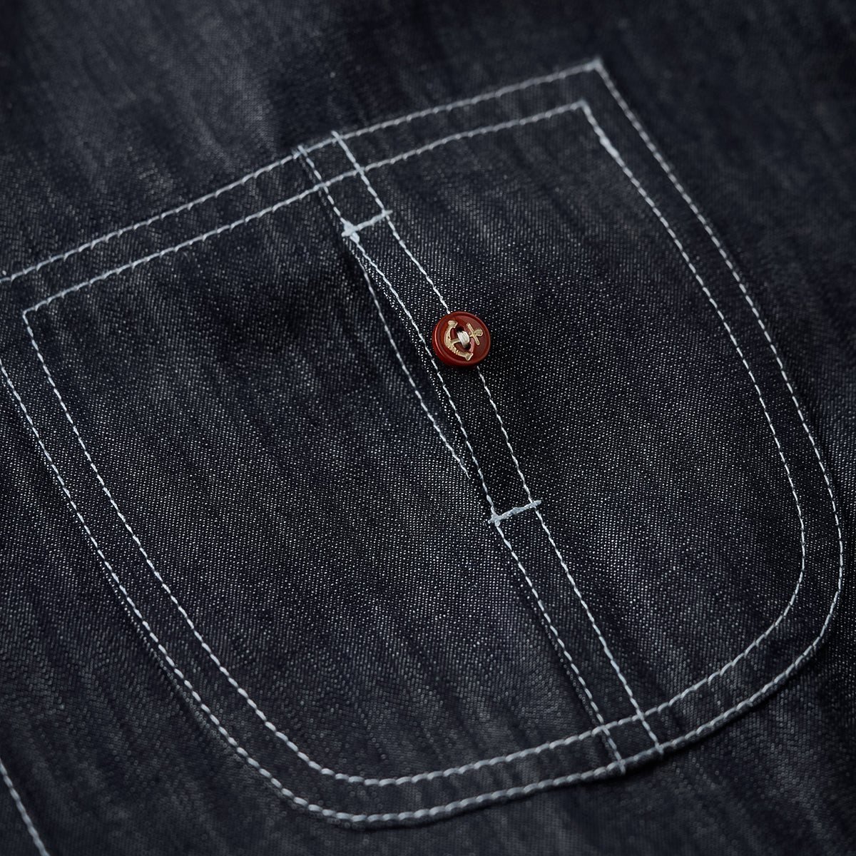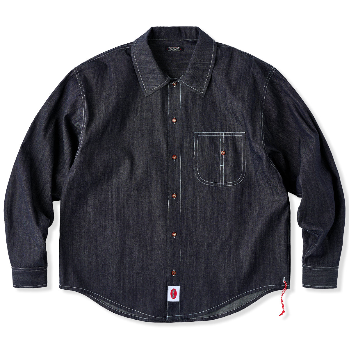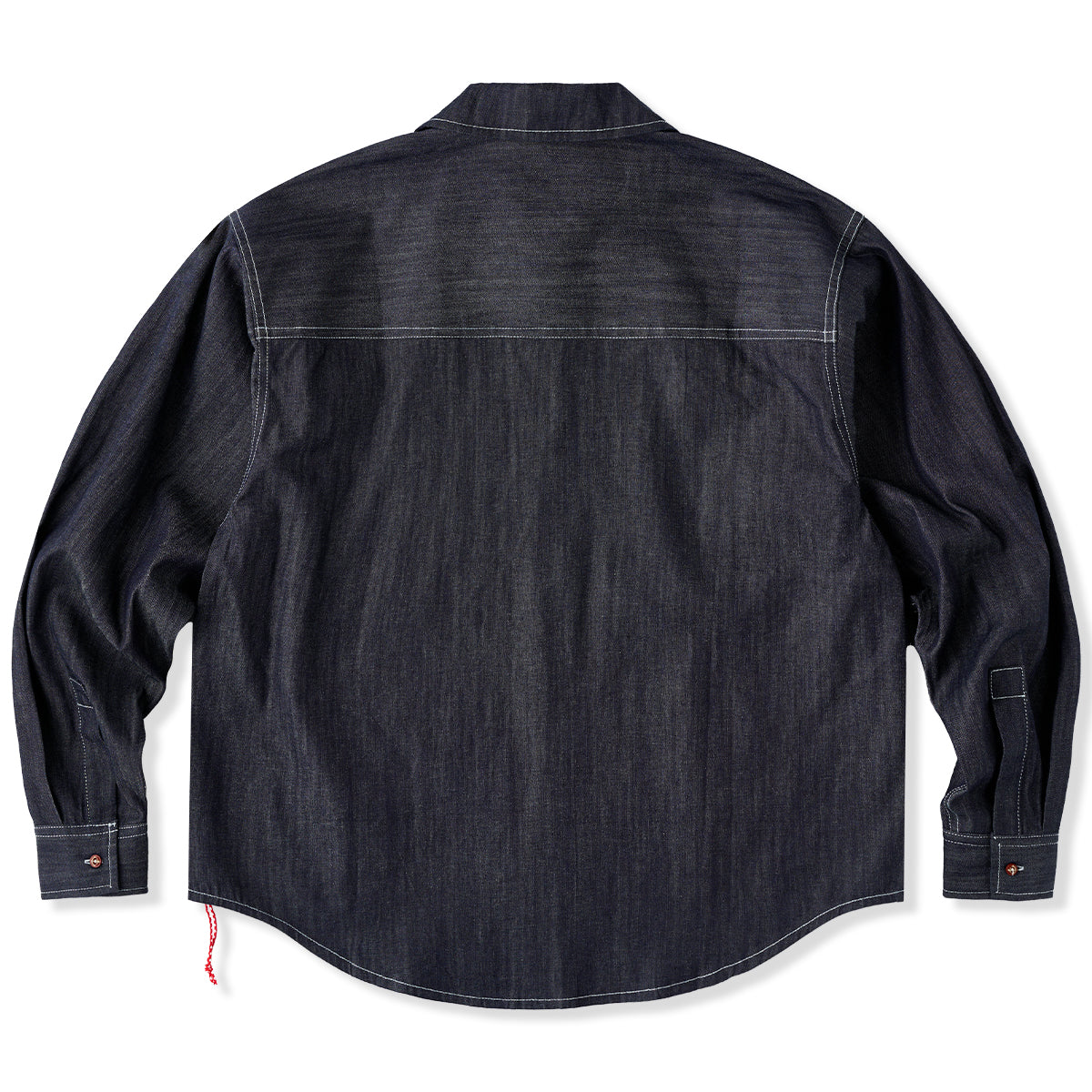 빨간 매듭 끈 포인트와 앵커 버튼, 2WAY 더블 레이어 포켓이 돋보이는 릴렉스핏 데님 셔츠입니다.