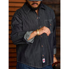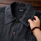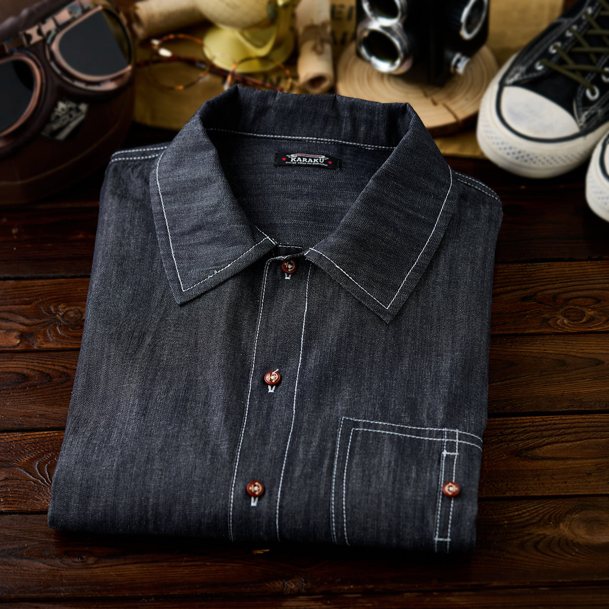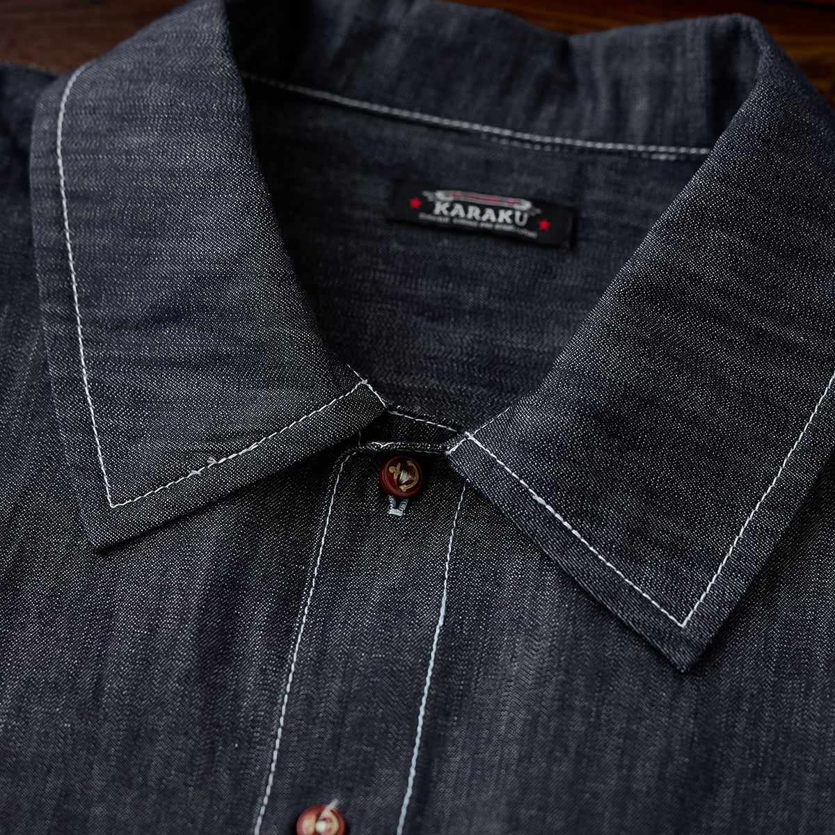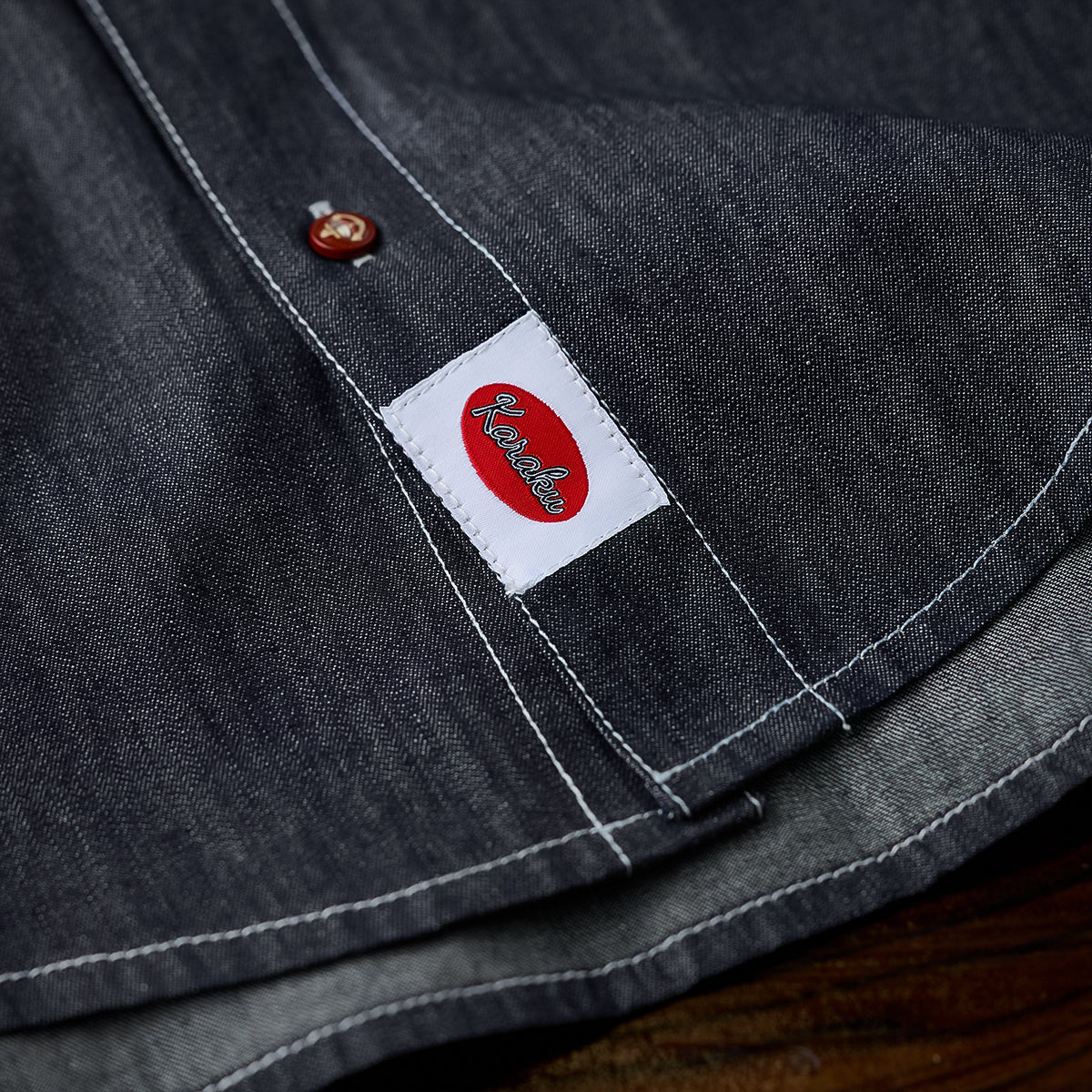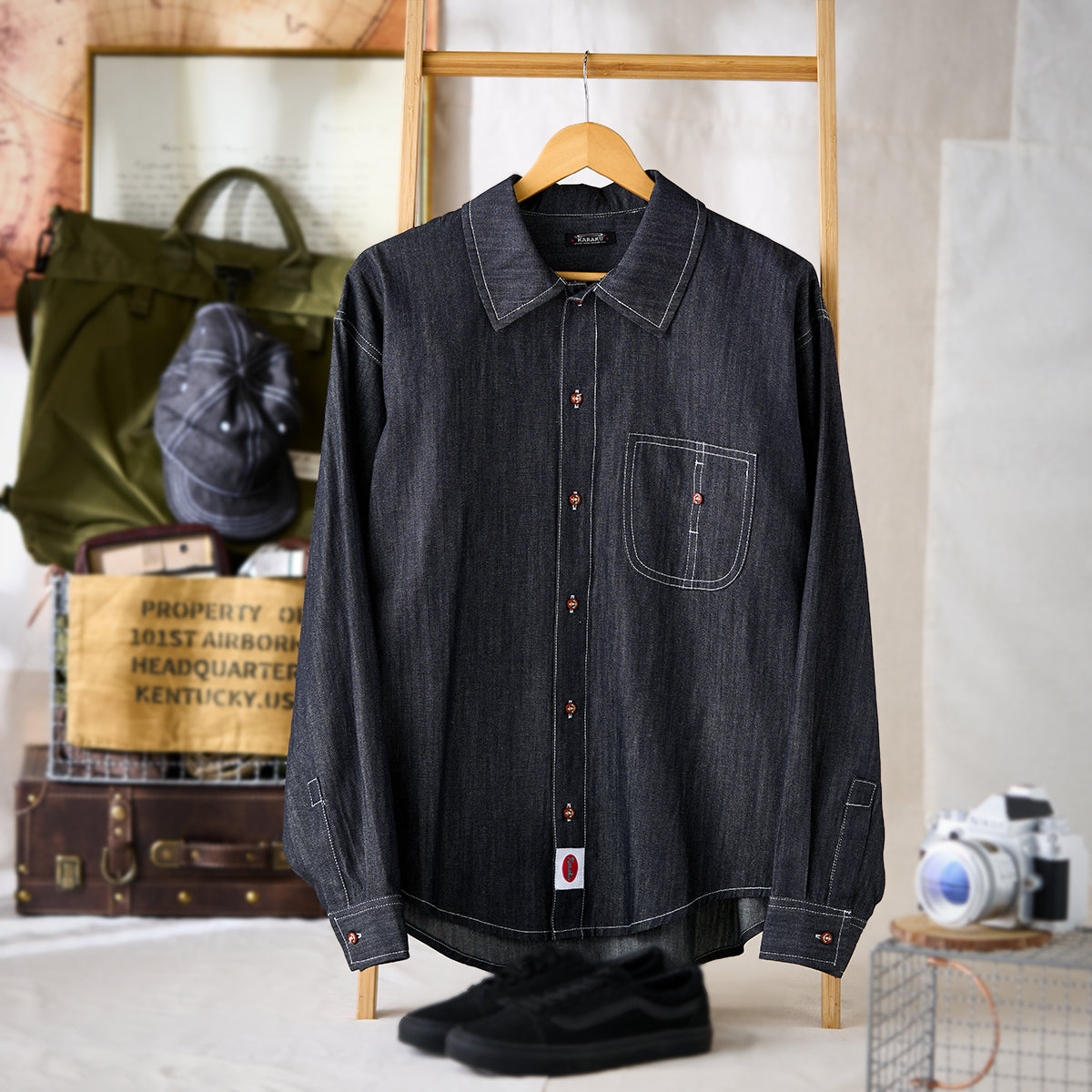 빨간 매듭 끈 포인트와 앵커 버튼, 2WAY 더블 레이어 포켓이 돋보이는 릴렉스핏 데님 셔츠입니다.