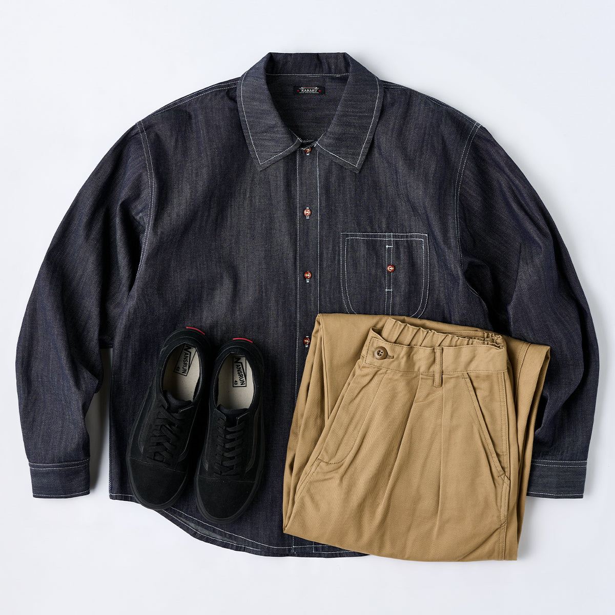 적당한 두께감의 코튼 데님 원단으로 제작되어, 착용할수록 멋스러운 빈티지 감성을 느낄 수 있습니다.
