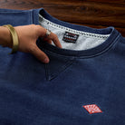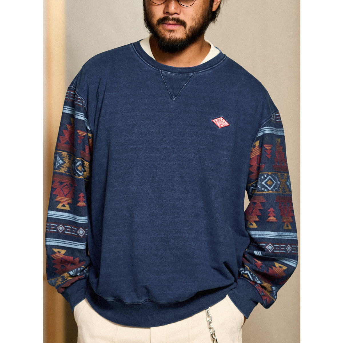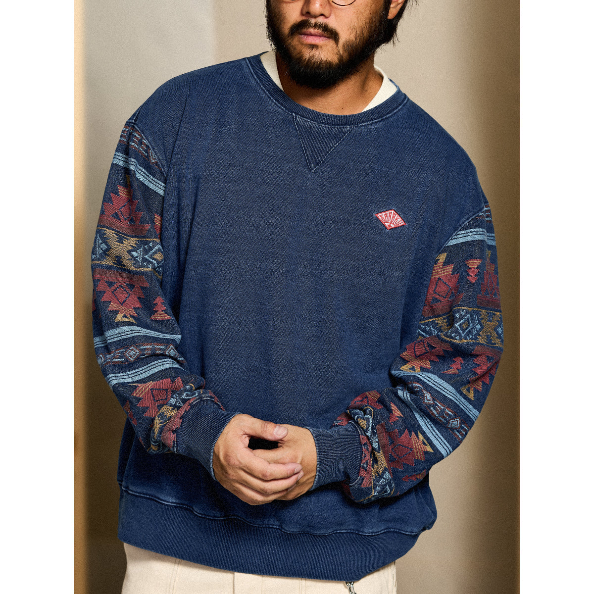 나바호 패턴 소매와 V 거셋, 로고 자수, 리브 디테일이 돋보이는 니트 데님 스웨트셔츠, 빈티지 무드 완성 아이템.