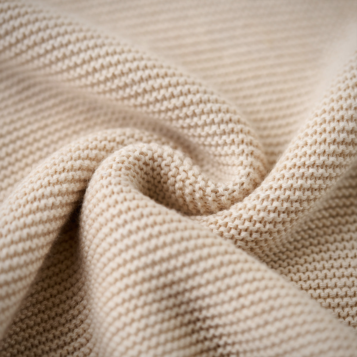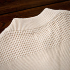 어깨와 밑단, 소매 일부는 허니콤(벌집) 조직, 본체는 촘촘한 편직 플레인 니트 소재로 제작되었습니다.