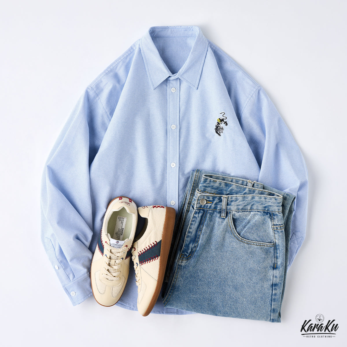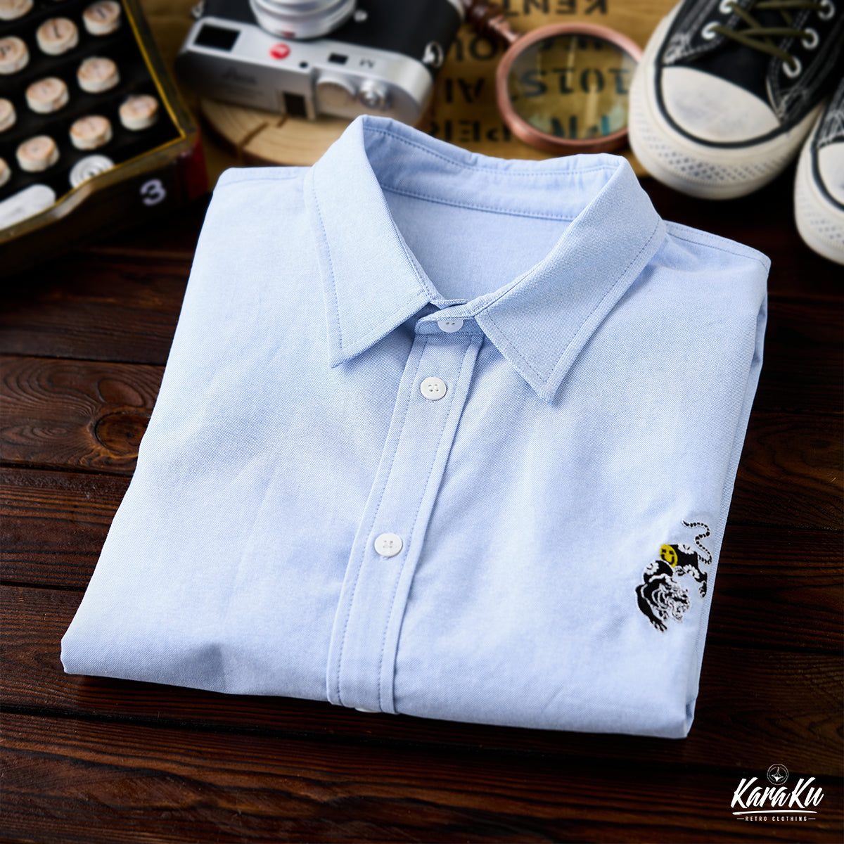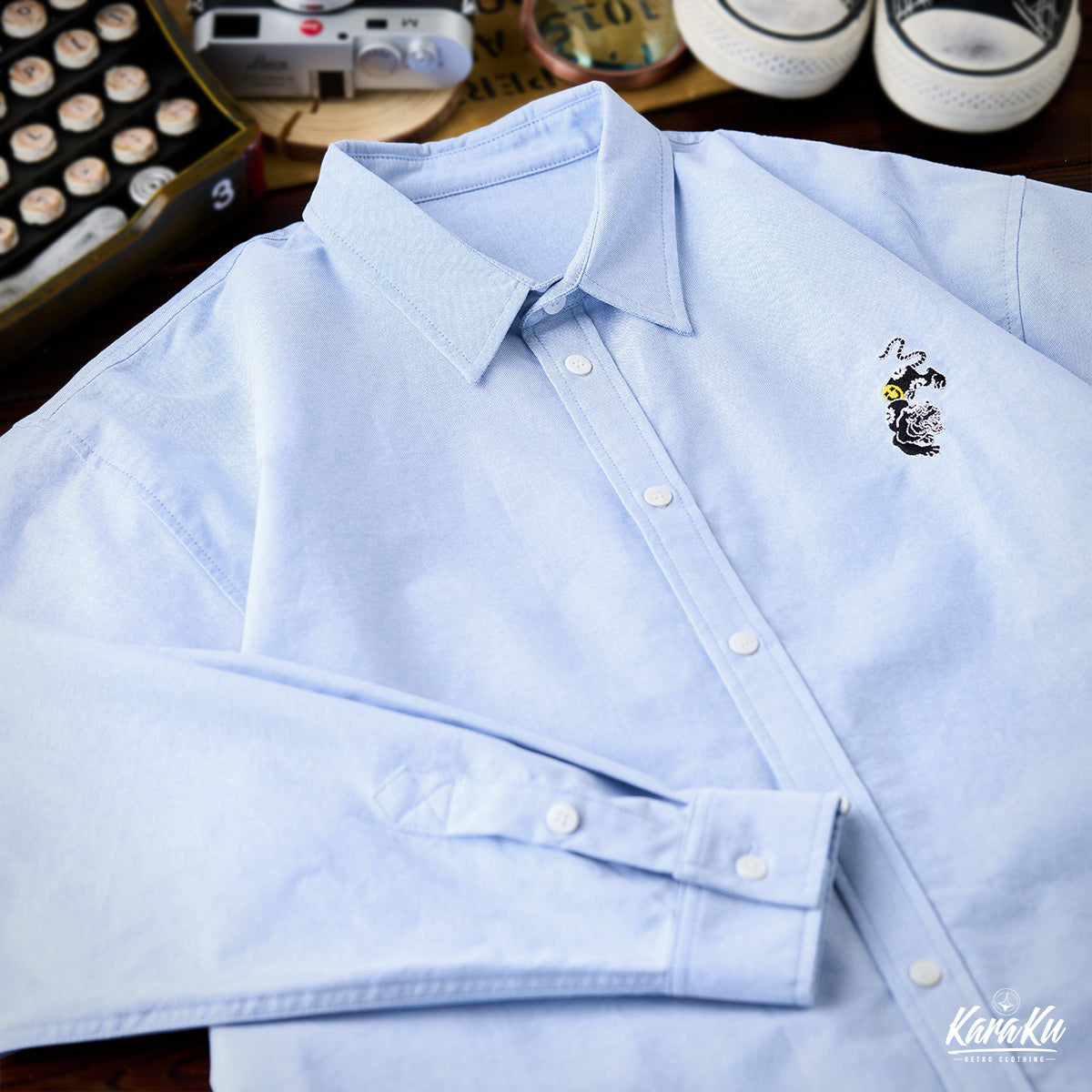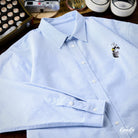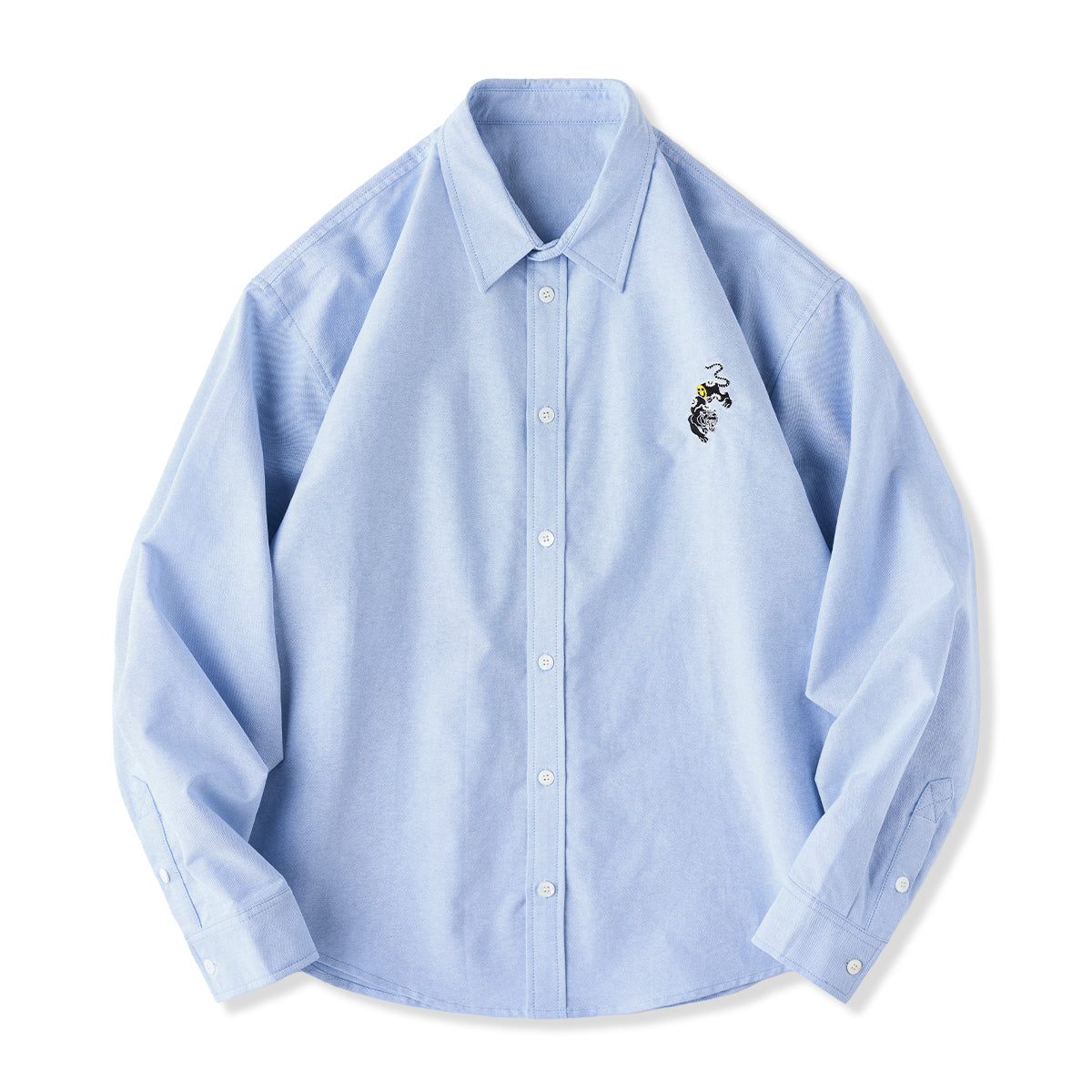 A premium cotton blue shirt with a playful tiger embroidery. An iconic piece that will catch the eye.