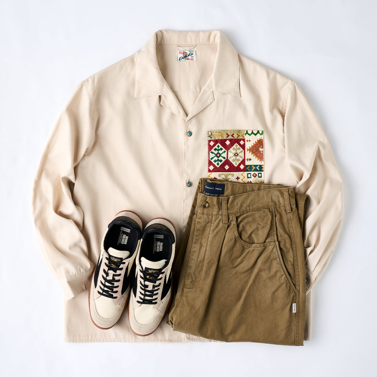 에스닉 무늬와 세련된 색감, 부드러운 피치 스킨 원단이 어우러진 편안하고 경쾌한 캐주얼 스타일입니다.