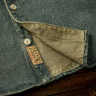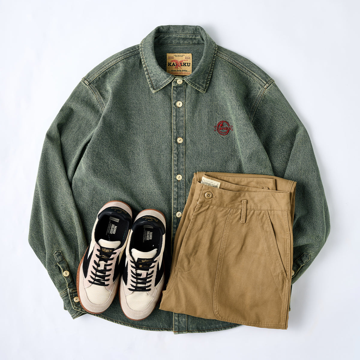 라이트 블루 워시드 데님으로 빈티지하고 캐주얼한 느낌을 살린, 왼쪽 가슴 KARAKU 로고 자수와 원형 로고 마크가 포인트인 긴팔 셔츠.