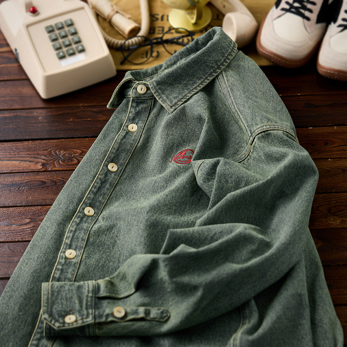 「KARAKU」로고 자수 워시드 데님 긴팔 셔츠