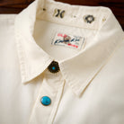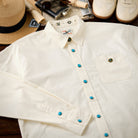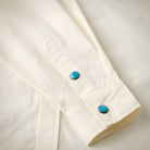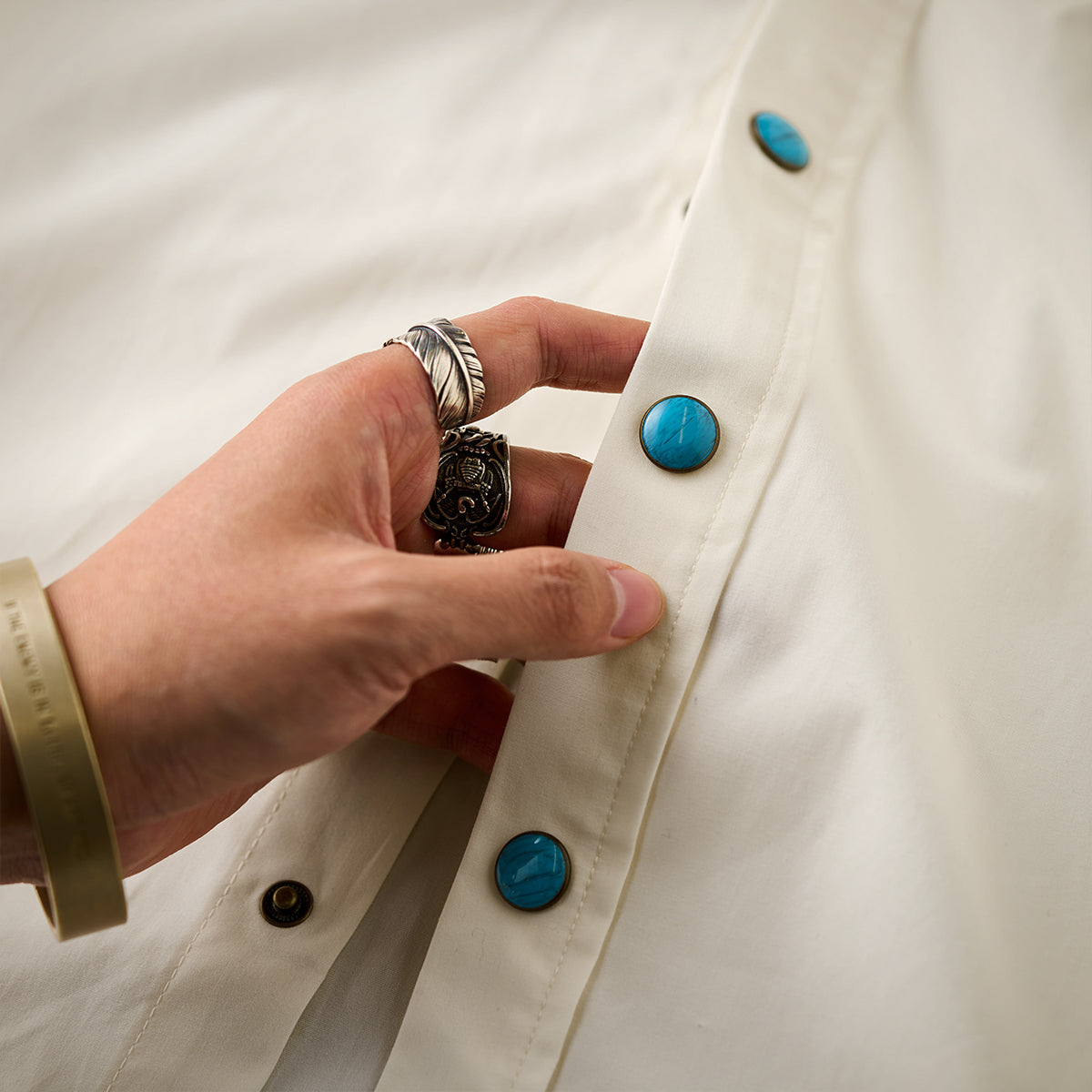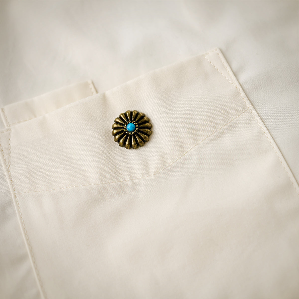 This cotton shirt features a detailed icon print and turquoise-like buttons. It can be styled in a variety of ways, from casual to minimal and western.