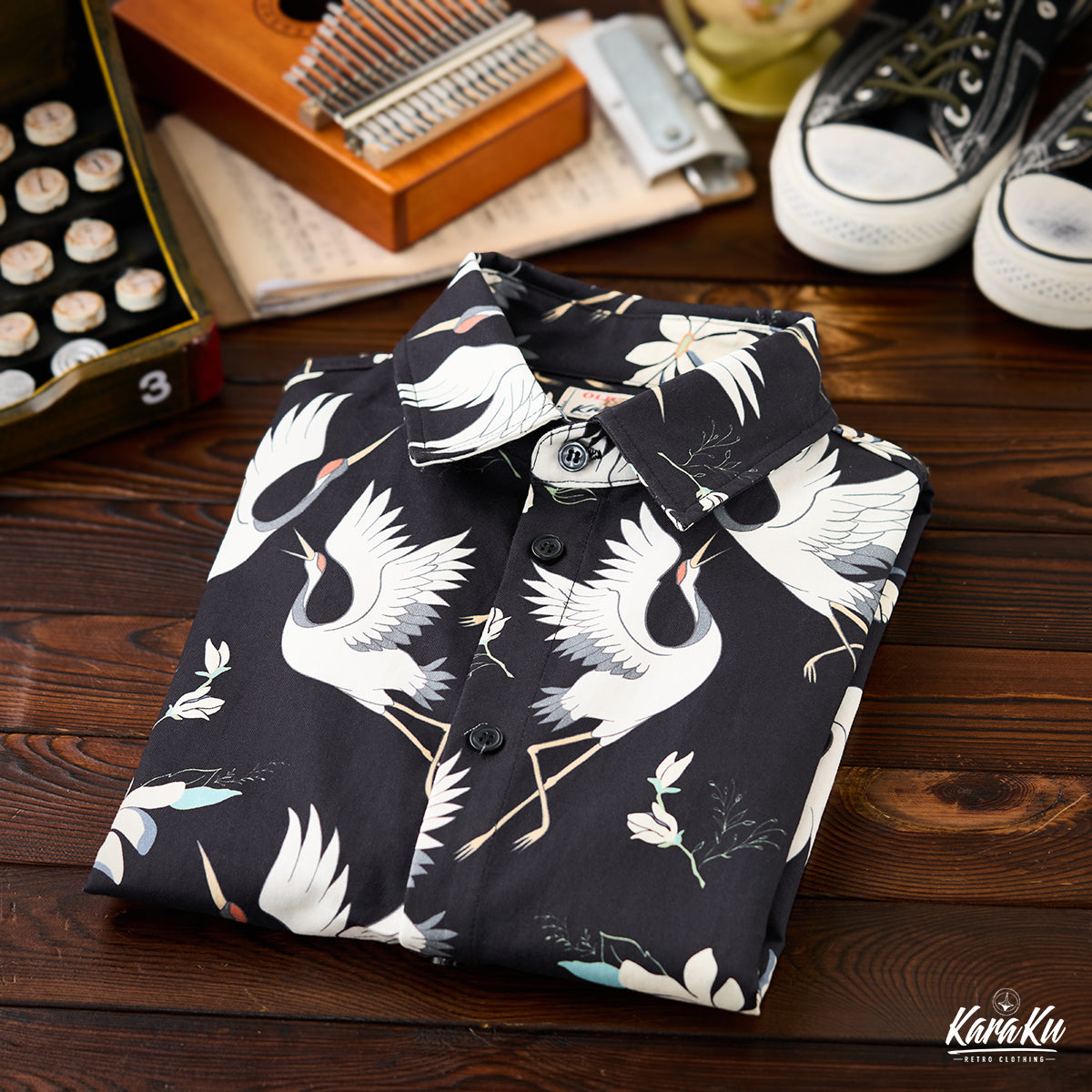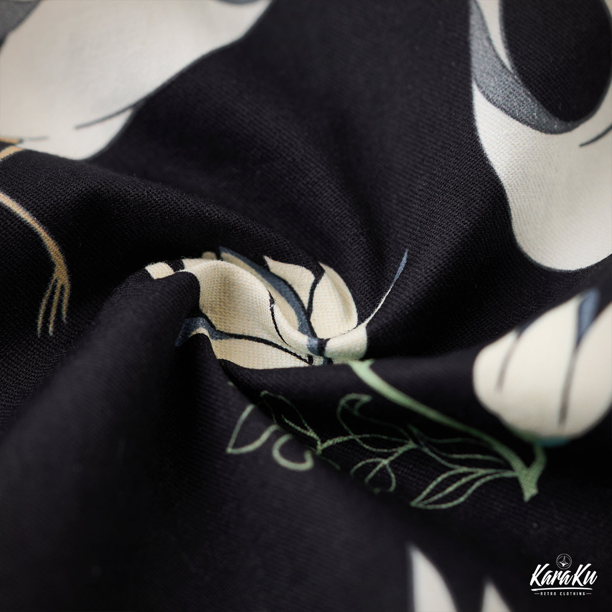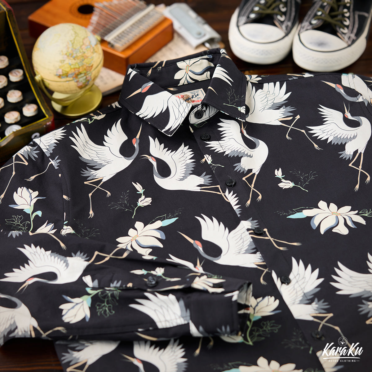 "Flying Cranes and Flowers" Japanese Pattern Cotton Long Sleeve Shirt