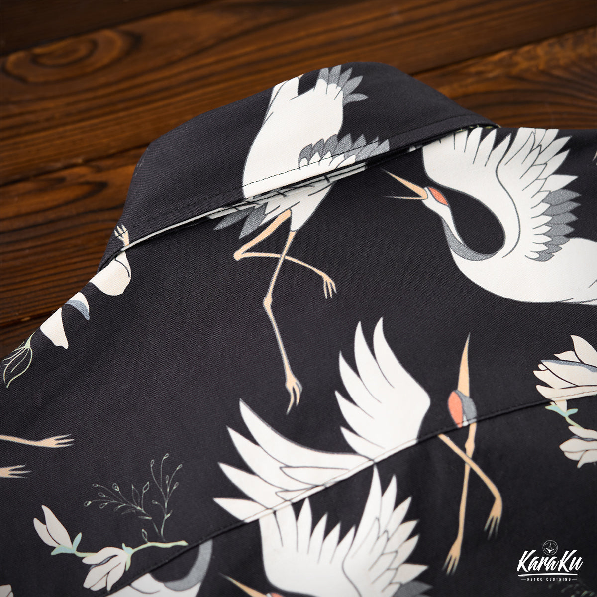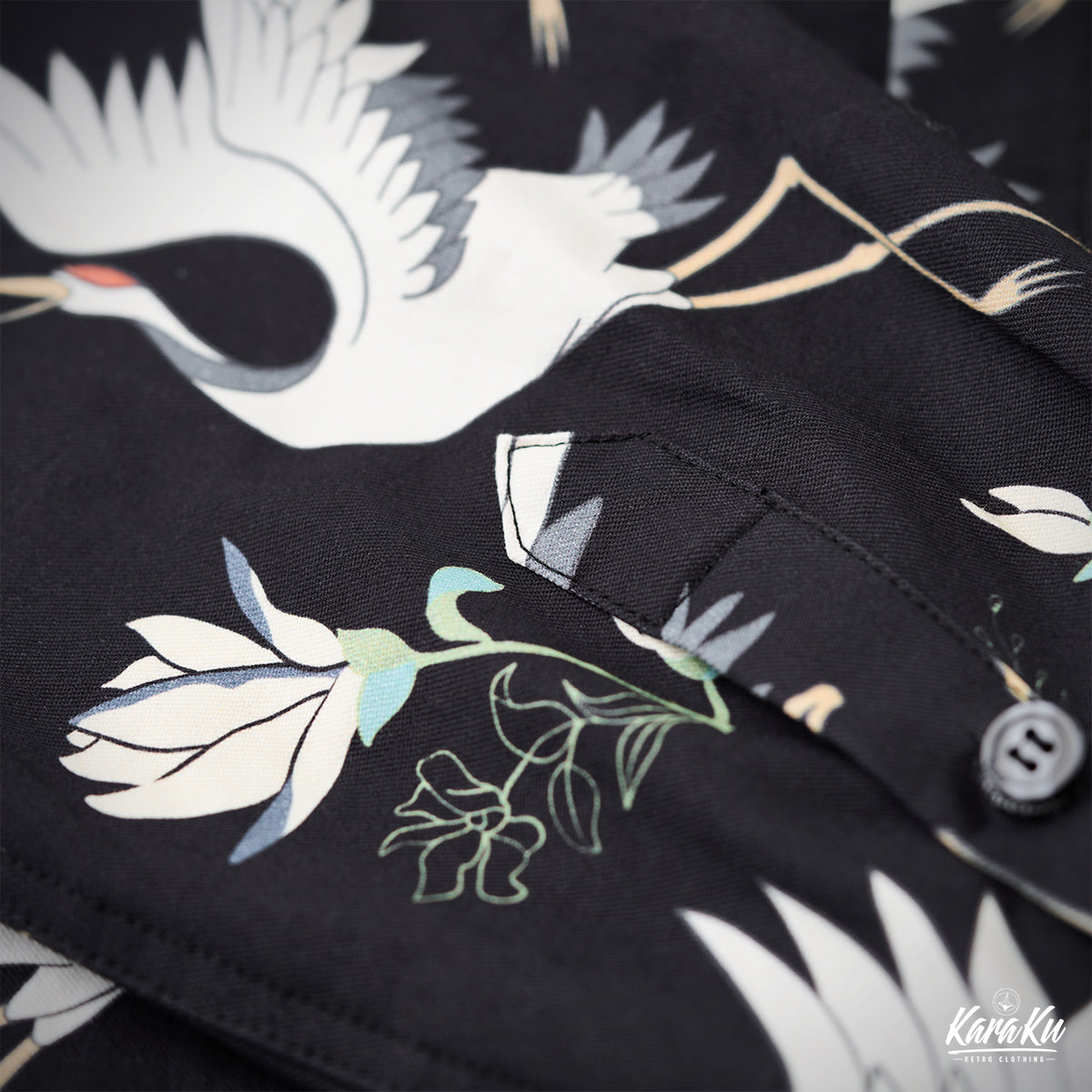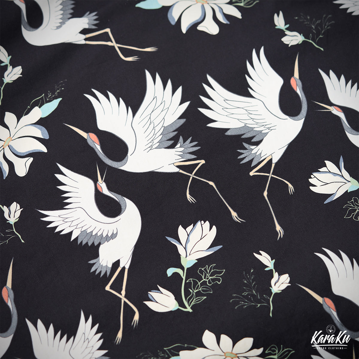 The base color is black, and the white of the crane and flowers stands out clearly, creating a strong contrast to the entire design. The colors of the crane's beak and crown add a point to the design, providing a dynamic and visual impact.