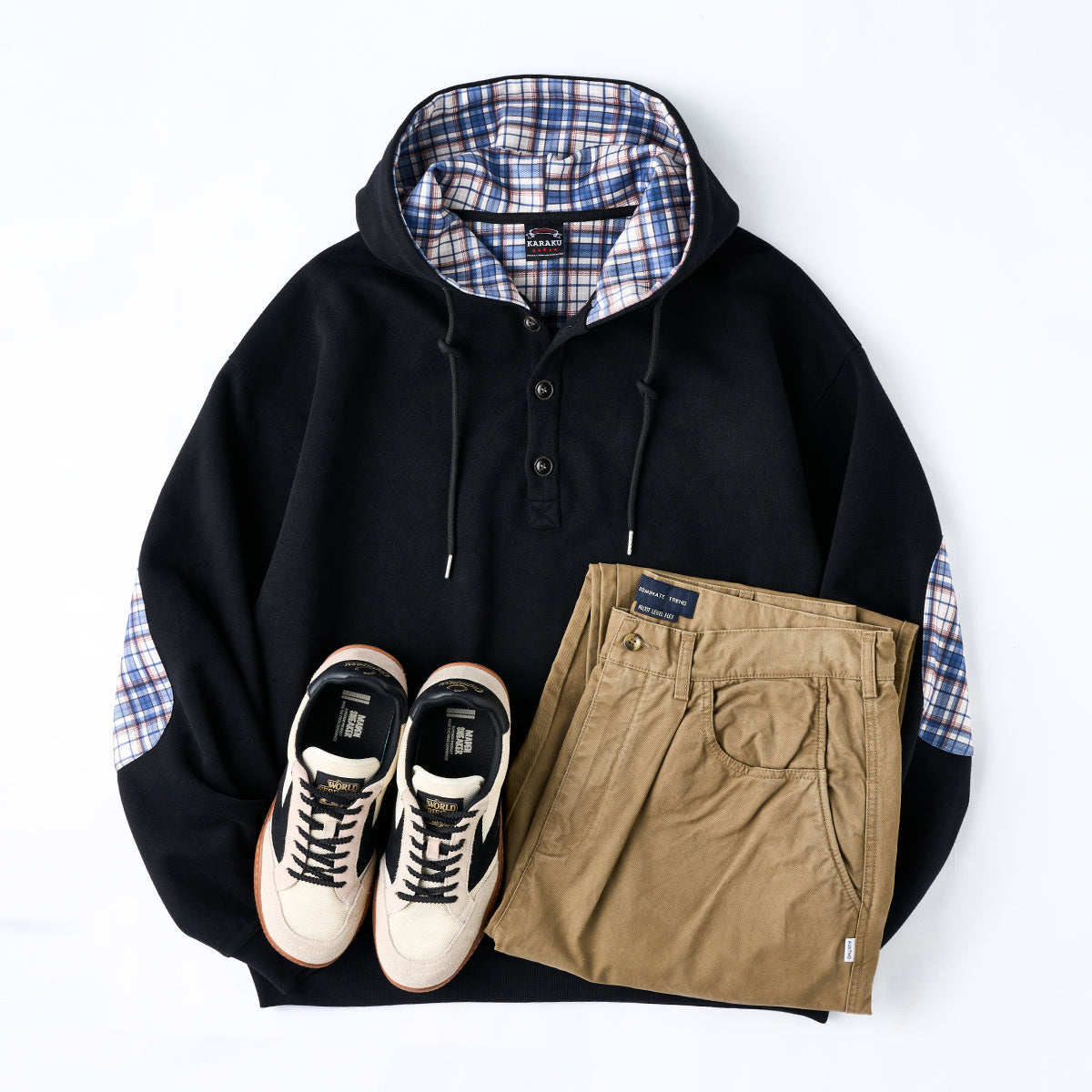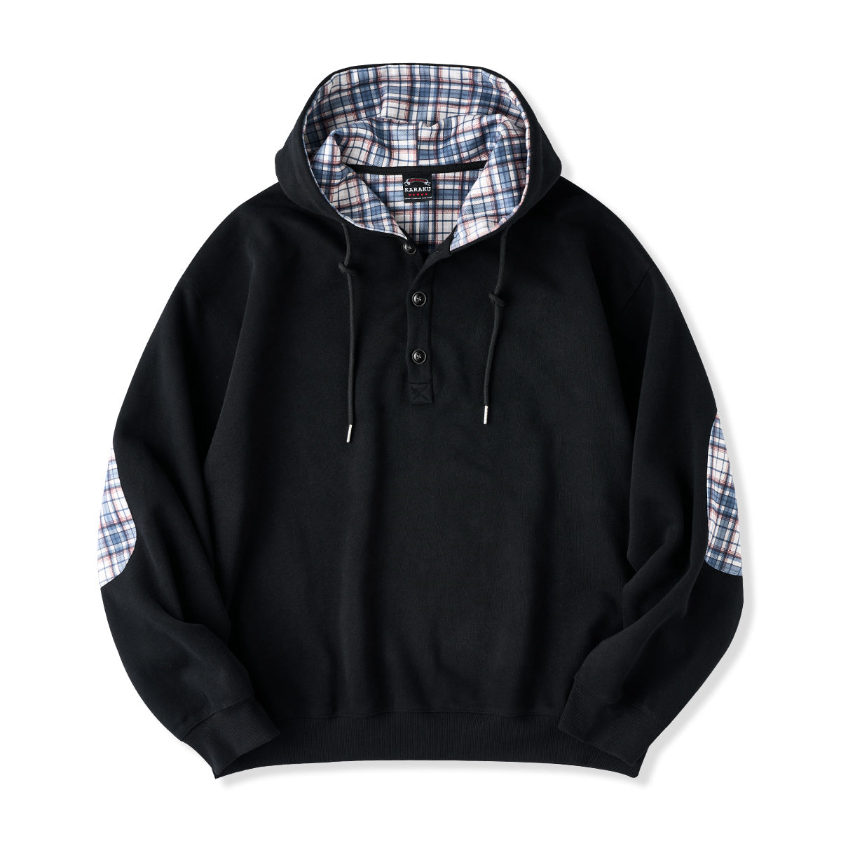 팔꿈치 패치와 안감 체크 패턴, 하프 버튼 디테일이 돋보이는 후드티로, 캐주얼한 일상복은 물론 개성 있는 스타일링에도 잘 어울립니다.