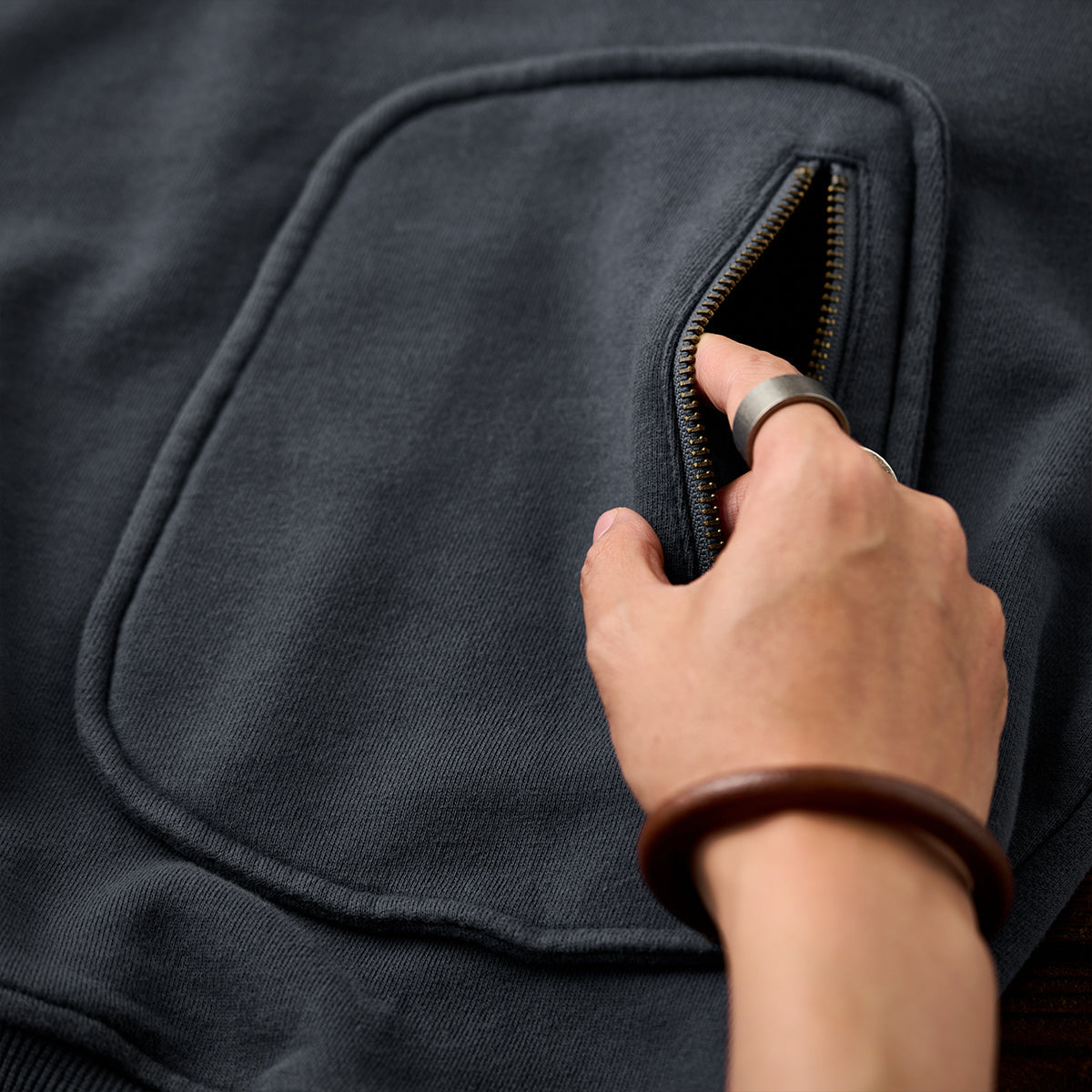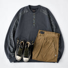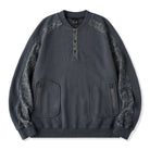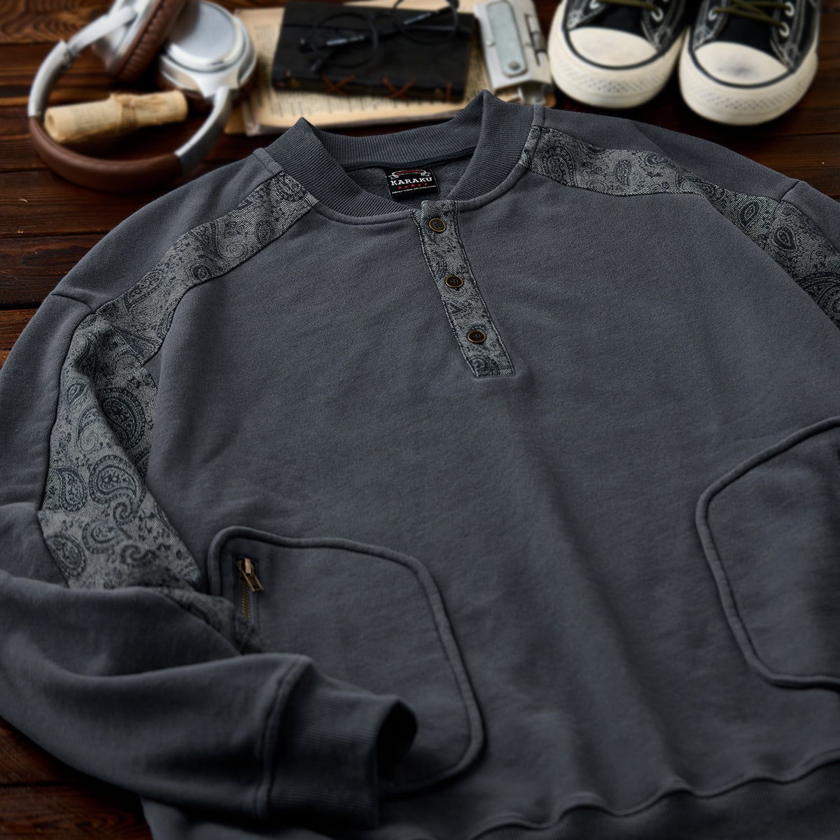 클래식 헨리넥과 페이즐리 데님 패치로 개성을 살린 풀오버 스웨트셔츠. 지퍼 포켓과 립 디테일로 실용성과 안정적인 실루엣을 갖춘 캐주얼 아이템입니다.