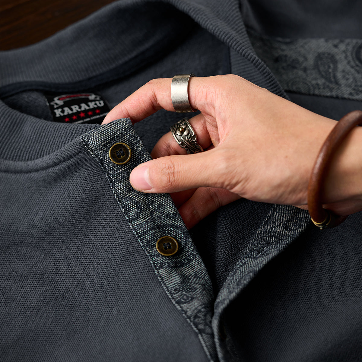 【사전예약】페이즐리 패턴 데님 패치 헨리넥 풀오버 스웨트셔츠