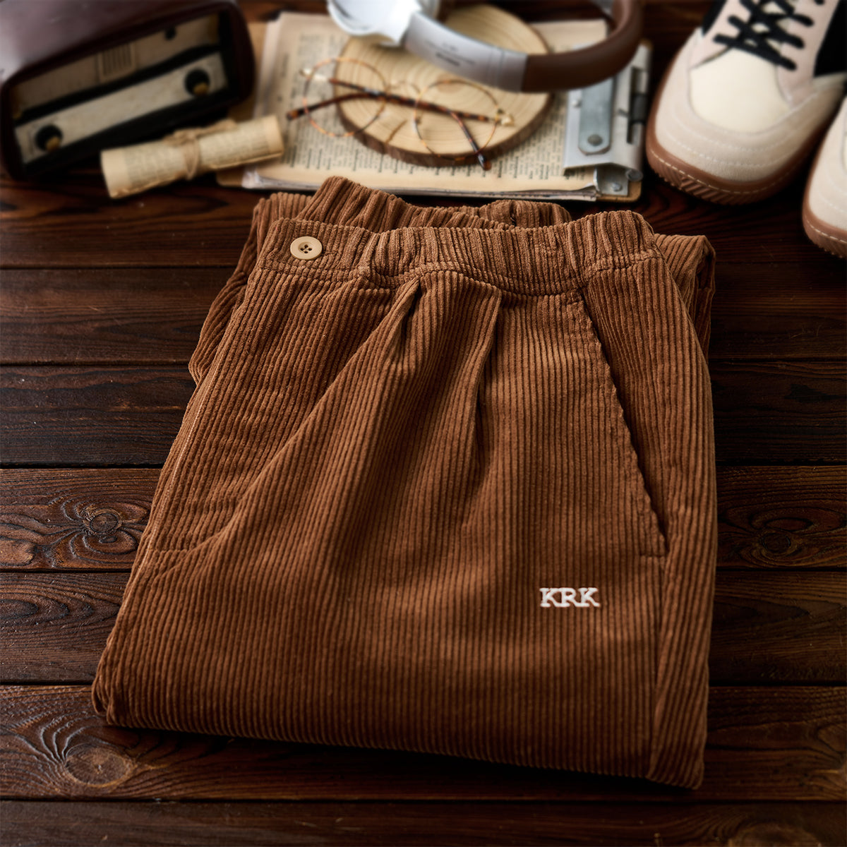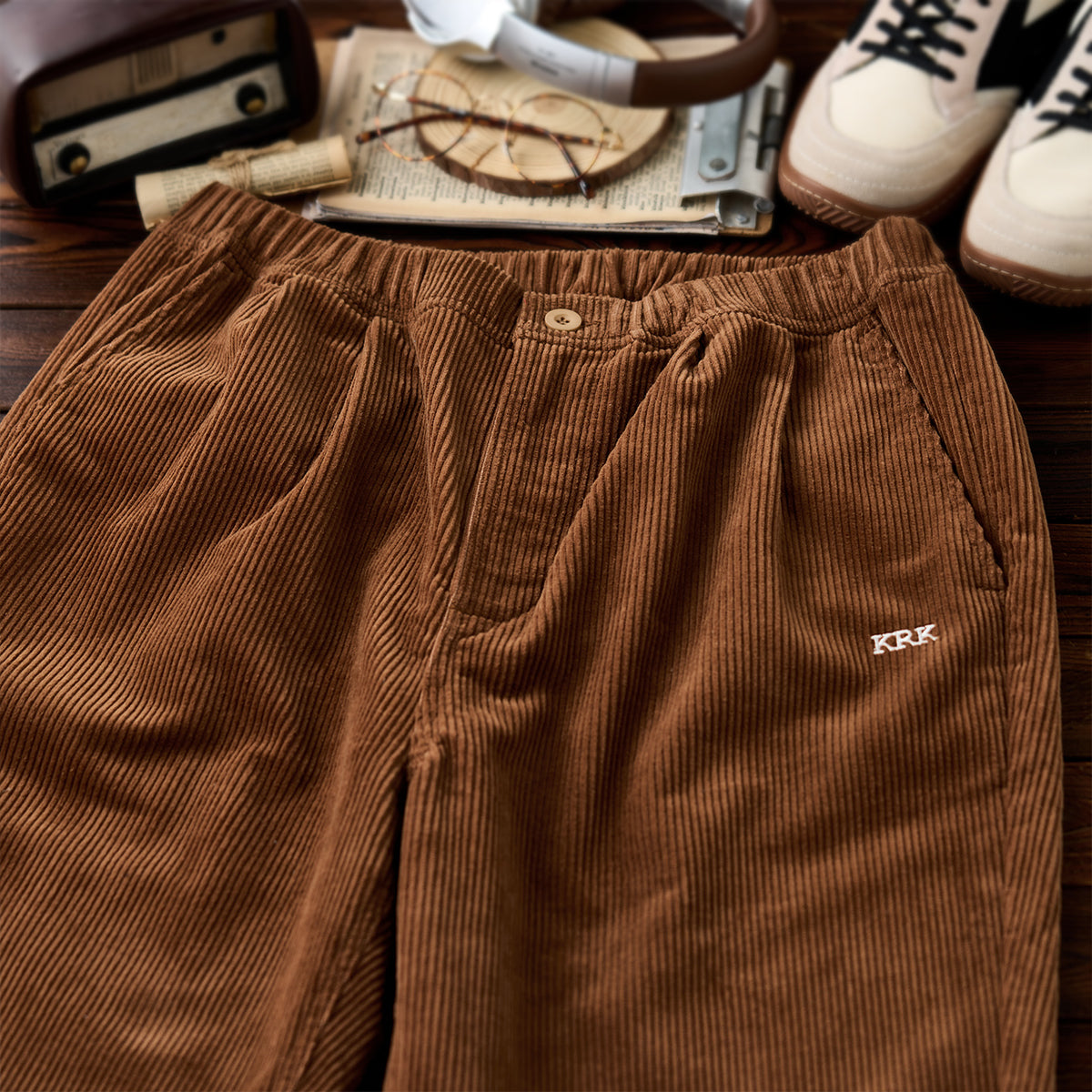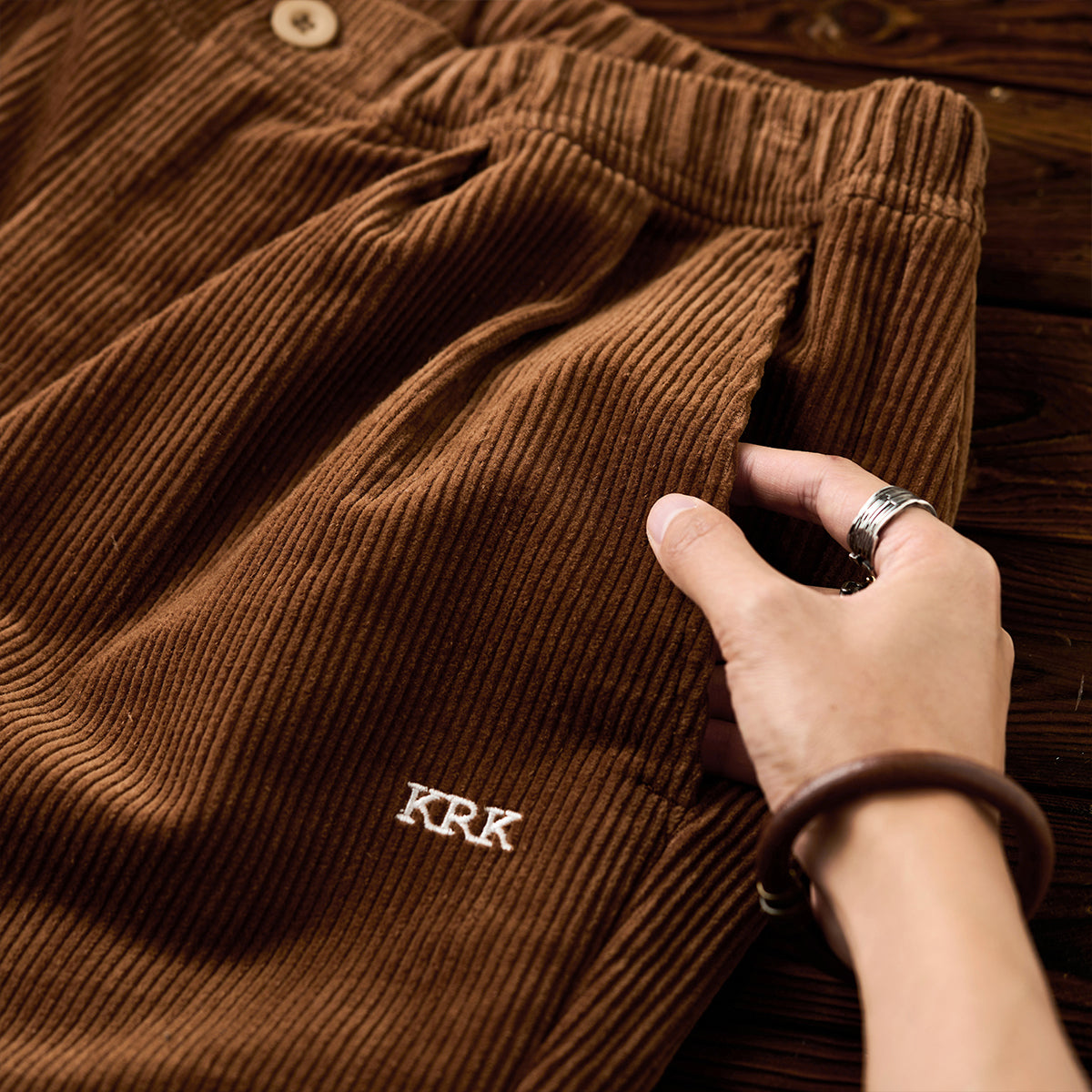 허리 밴딩과 스토퍼 드로스트링으로 편안함과 활동성을 높인 코듀로이 팬츠. 사이드 ‘KRK’ 자수와 버튼 포켓으로 실용성과 포인트를 더한 캐주얼 아이템.