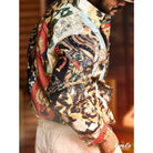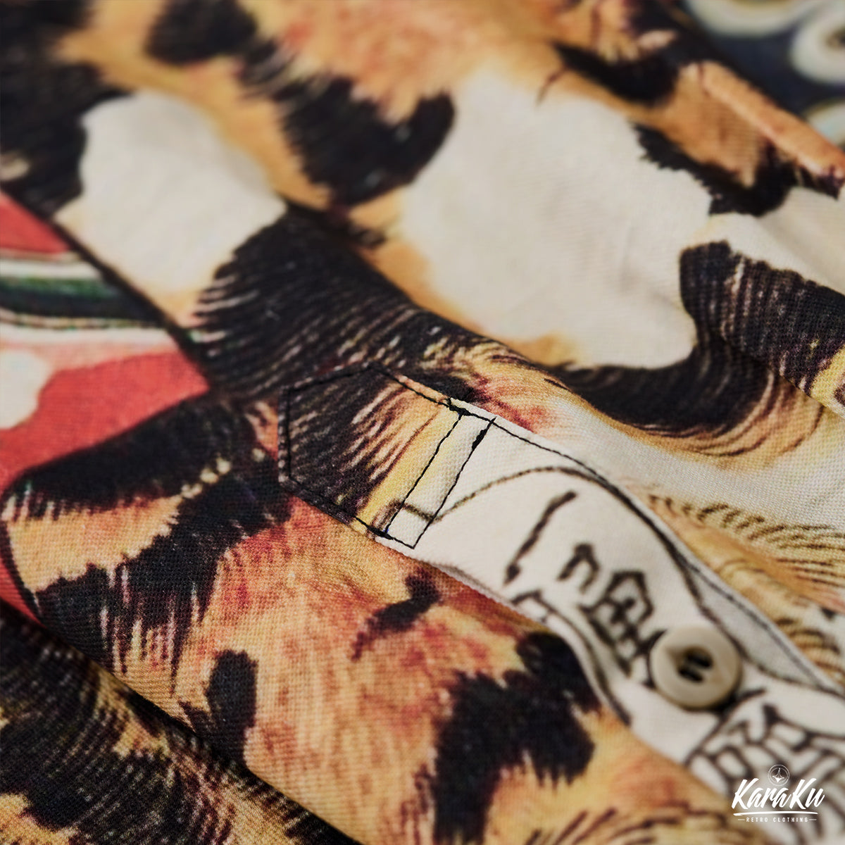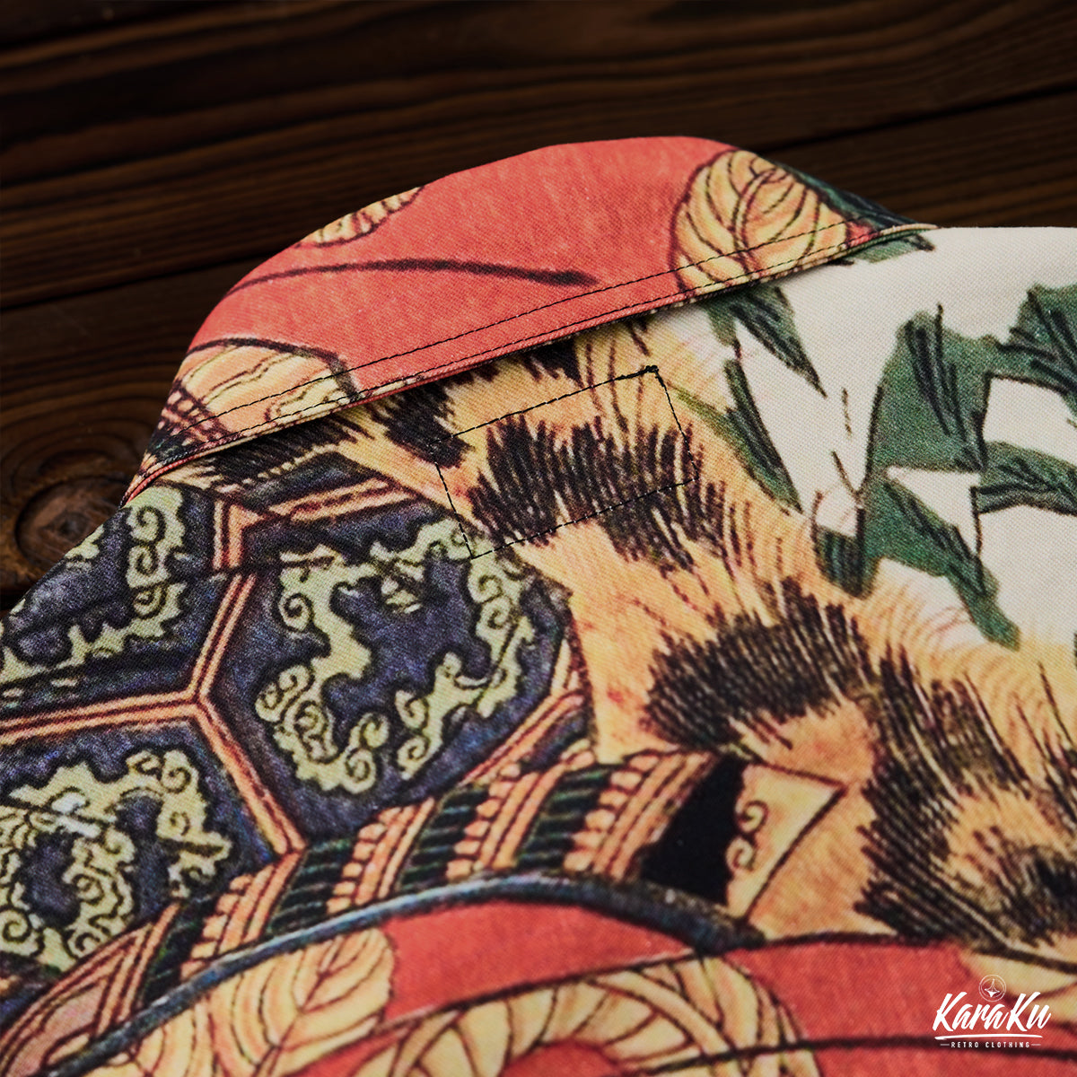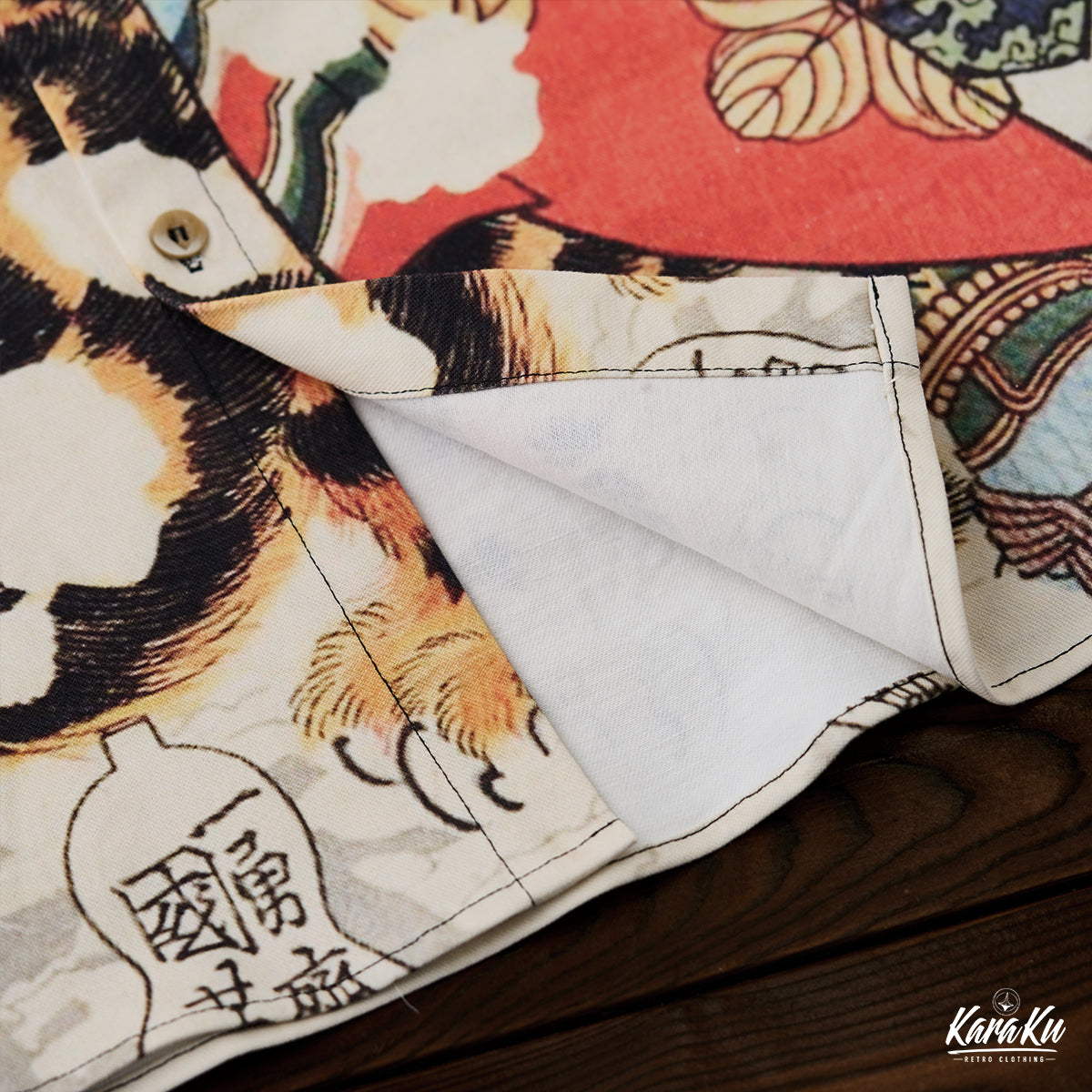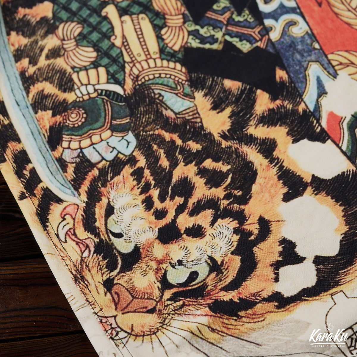 This shirt features Senshinbajesa, one of the 800 righteous thieves (heroes) from the Japanese Suikoden. Senshinbajesa is depicted as a warrior with great martial arts skills, and is characterized by his strong physique and intense expression. His courage and fighting spirit are vividly expressed through his fighting stance, such as swinging a weapon or fighting a tiger.