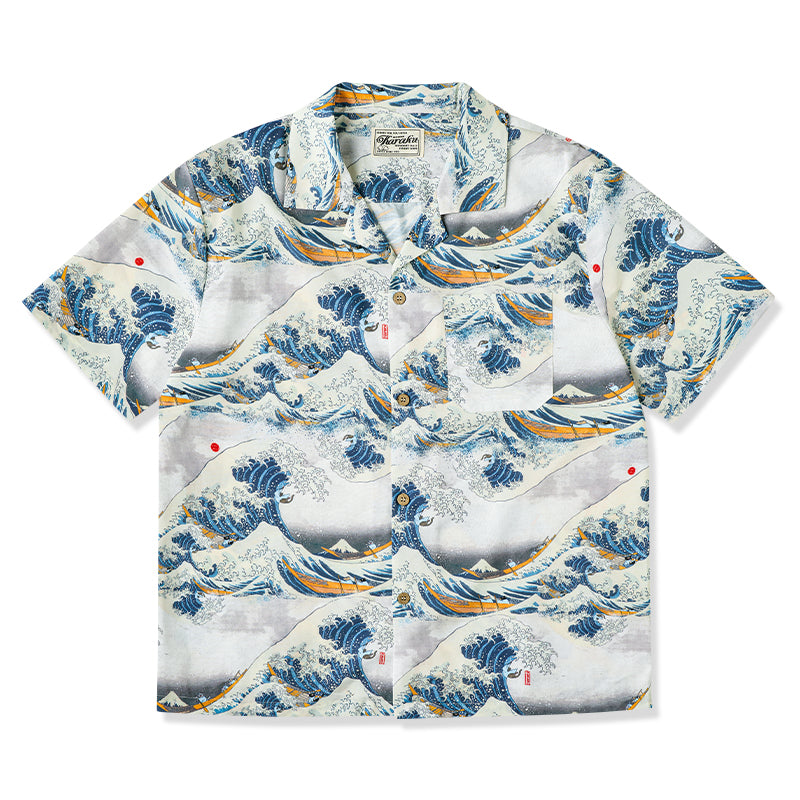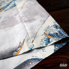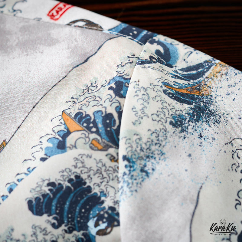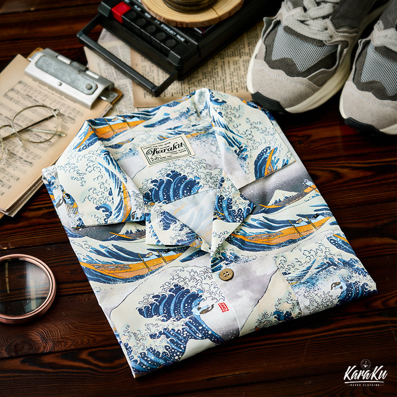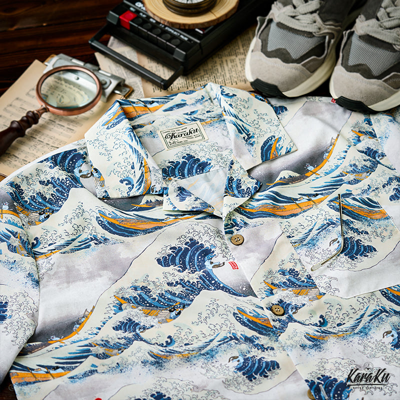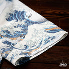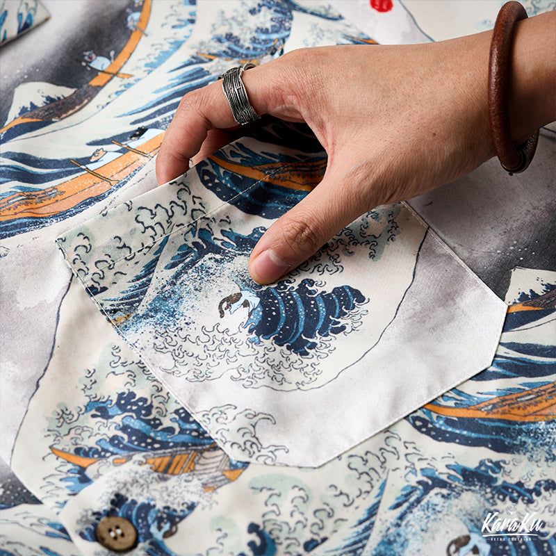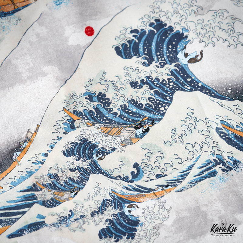 This item is inspired by Hokusai's famous work "Kanagawa Okinawa (神奈川沖浪裏)". It offers a scene of enjoying the sea with lovely animals. In this unique sea world, all sailors have turned into healthy and cute cats or dogs, each with a different expression and helping each other to overcome the waves. Each animal is realistically drawn on the shirt, making you feel as if you are immersed in Hokusai's sea painting. The artist's unique technique and awe for nature are expressed, such as the edge of the wave and the spray. The sophisticated Cuban collar adds a three-dimensional feel to the coordination, and the loose sleeves make it easier to move. There is a pocket on the left chest, so great care is taken to prevent small items from falling.