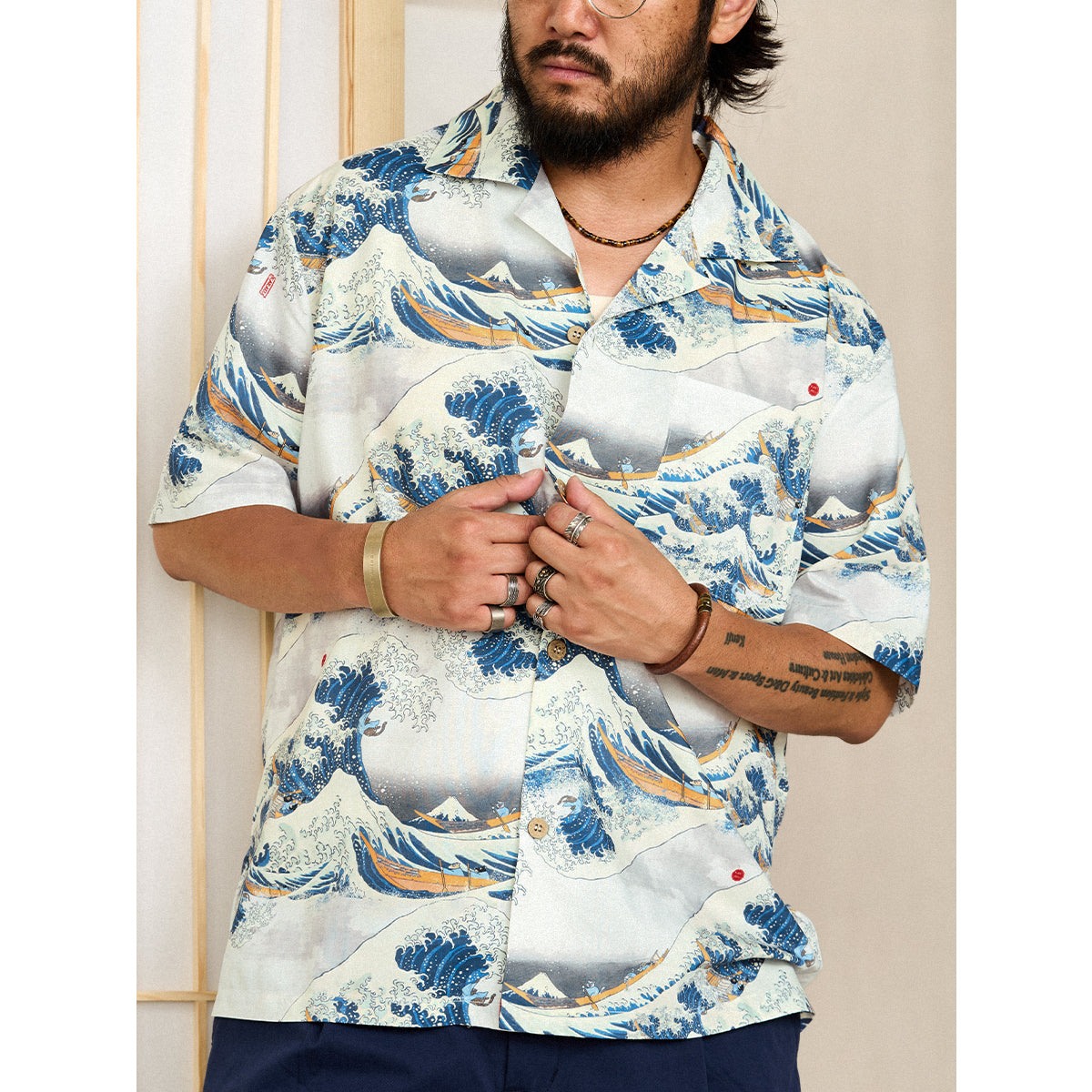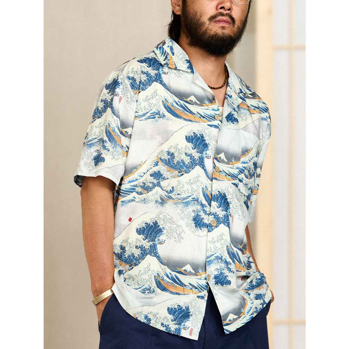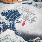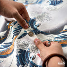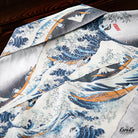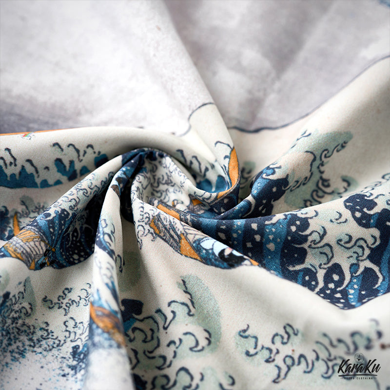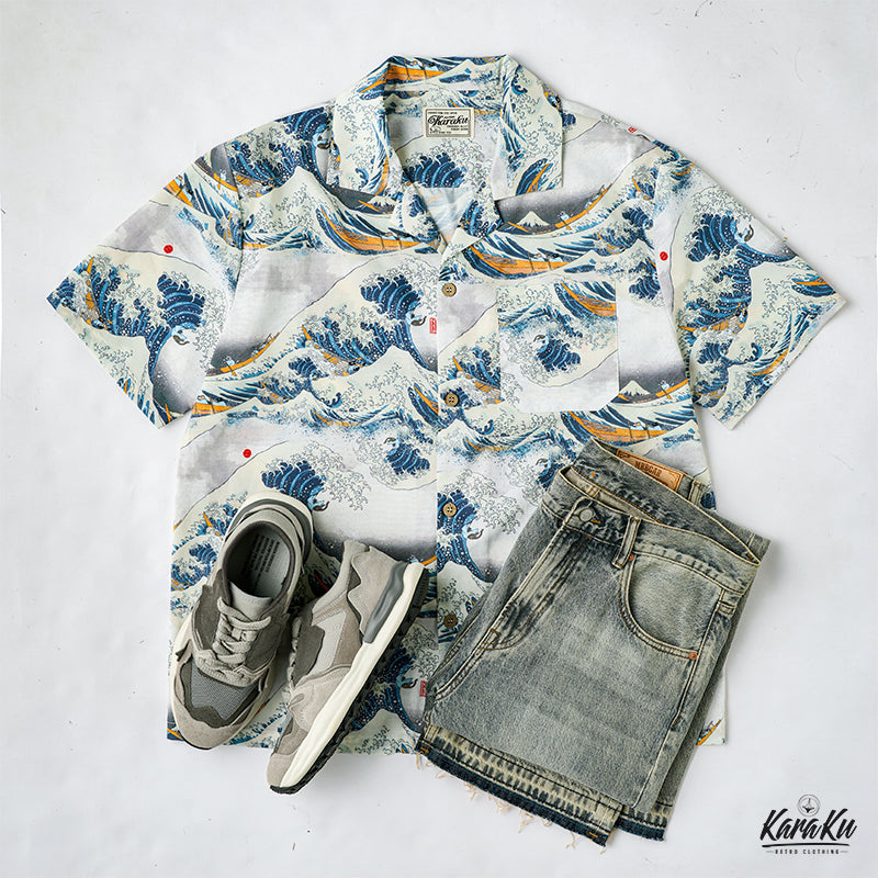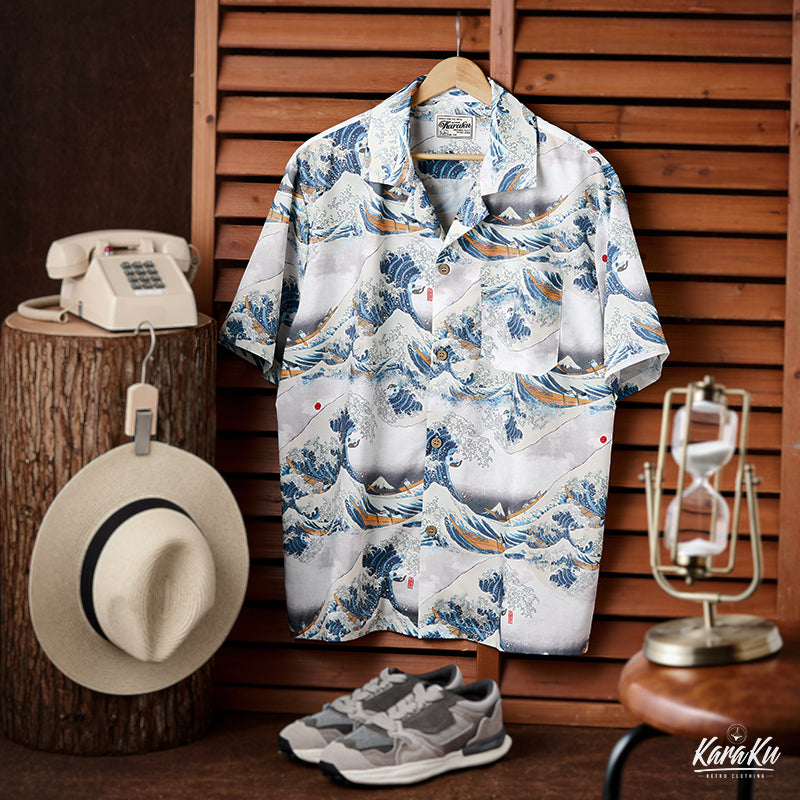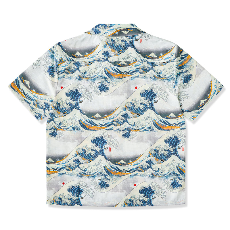 This item is inspired by Hokusai's famous work "Kanagawa Okinawa (神奈川沖浪裏)". It offers a scene of enjoying the sea with lovely animals. In this unique sea world, all sailors have turned into healthy and cute cats or dogs, each with a different expression and helping each other to overcome the waves. Each animal is realistically drawn on the shirt, making you feel as if you are immersed in Hokusai's sea painting. The artist's unique technique and awe for nature are expressed, such as the edge of the wave and the spray. The sophisticated Cuban collar adds a three-dimensional feel to the coordination, and the loose sleeves make it easier to move. There is a pocket on the left chest, so great care is taken to prevent small items from falling.