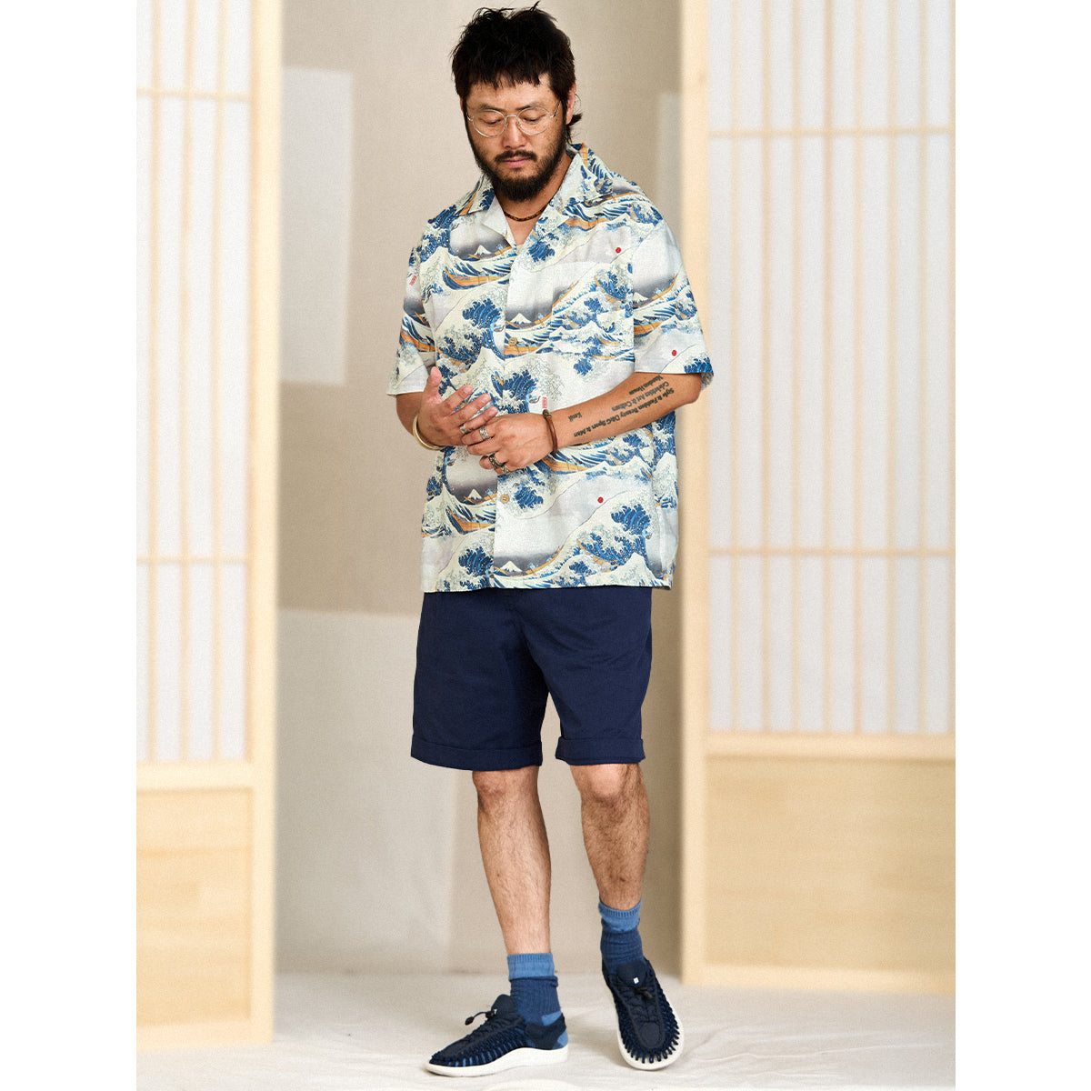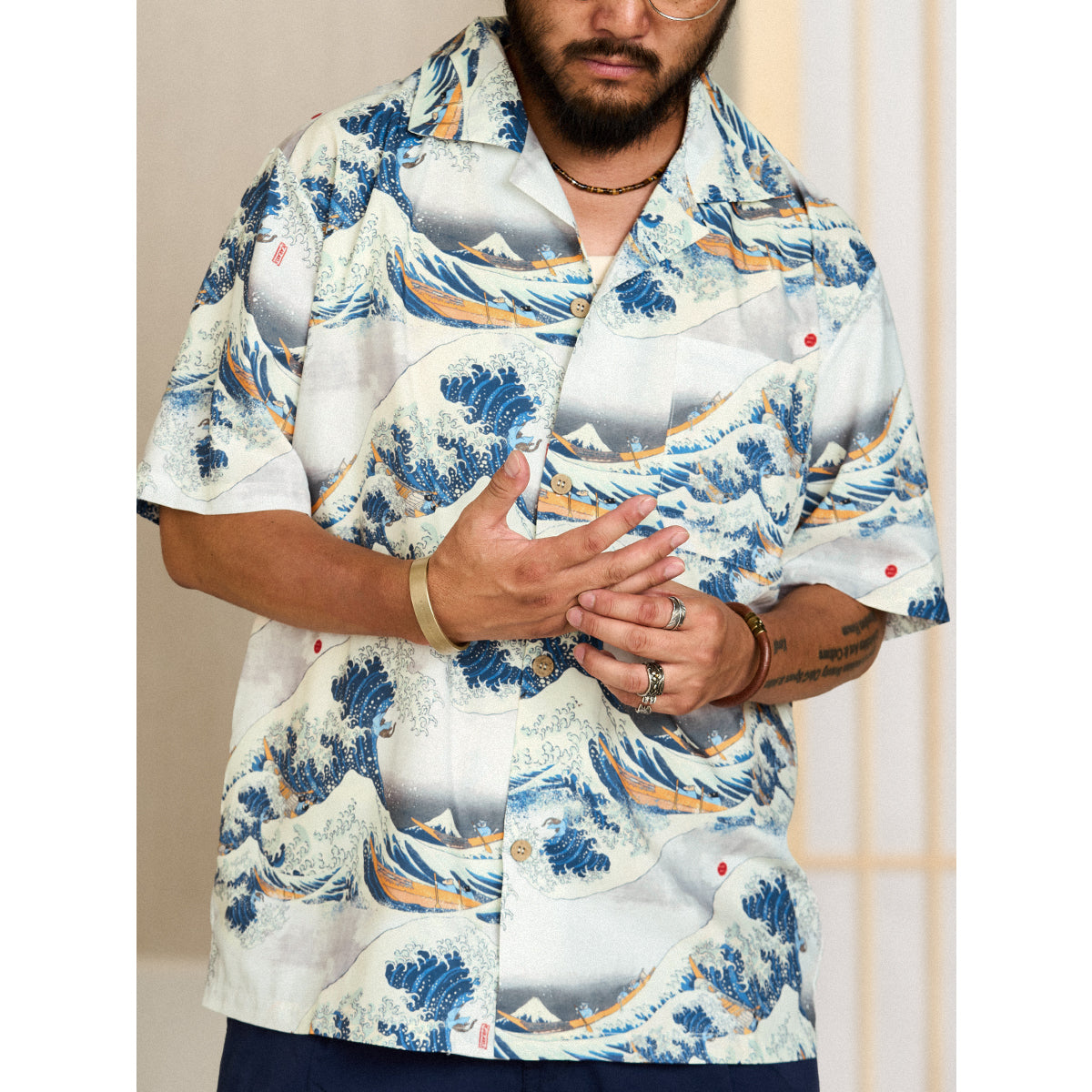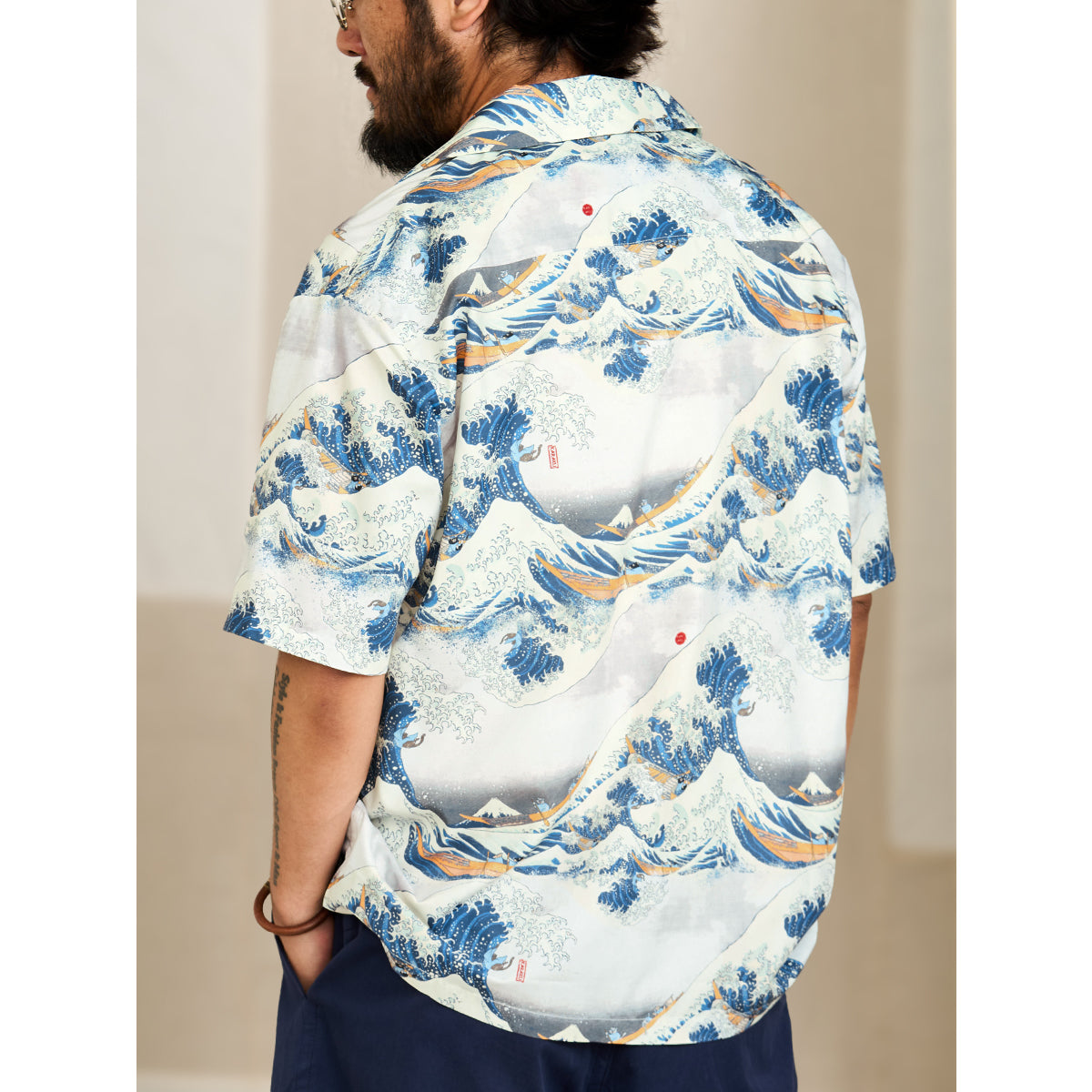 This item is inspired by Hokusai's famous work "Kanagawa Okinawa (神奈川沖浪裏)". It offers a scene of enjoying the sea with lovely animals. In this unique sea world, all sailors have turned into healthy and cute cats or dogs, each with a different expression and helping each other to overcome the waves. Each animal is realistically drawn on the shirt, making you feel as if you are immersed in Hokusai's sea painting. The artist's unique technique and awe for nature are expressed, such as the edge of the wave and the spray. The sophisticated Cuban collar adds a three-dimensional feel to the coordination, and the loose sleeves make it easier to move. There is a pocket on the left chest, so great care is taken to prevent small items from falling.