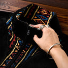 블랙 컬러를 베이스로 에스닉 패턴을 더해 심플하면서도 개성 있는 포인트를 살린 디자인으로, 모던한 분위기와 전통적인 감성이 조화를 이루는 아이템입니다.