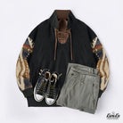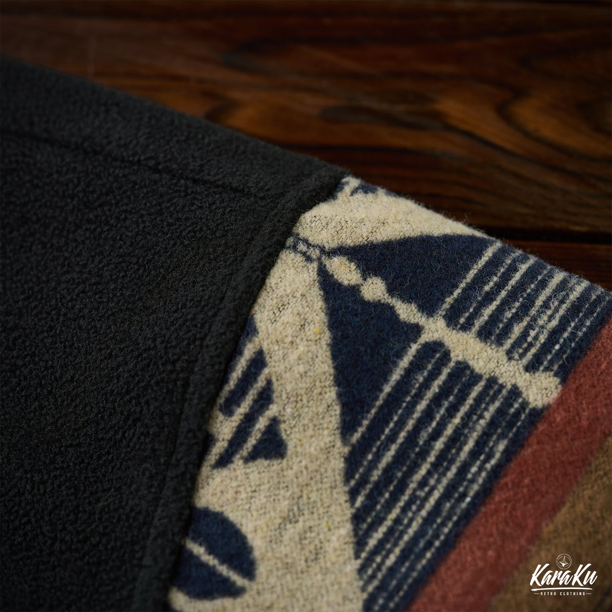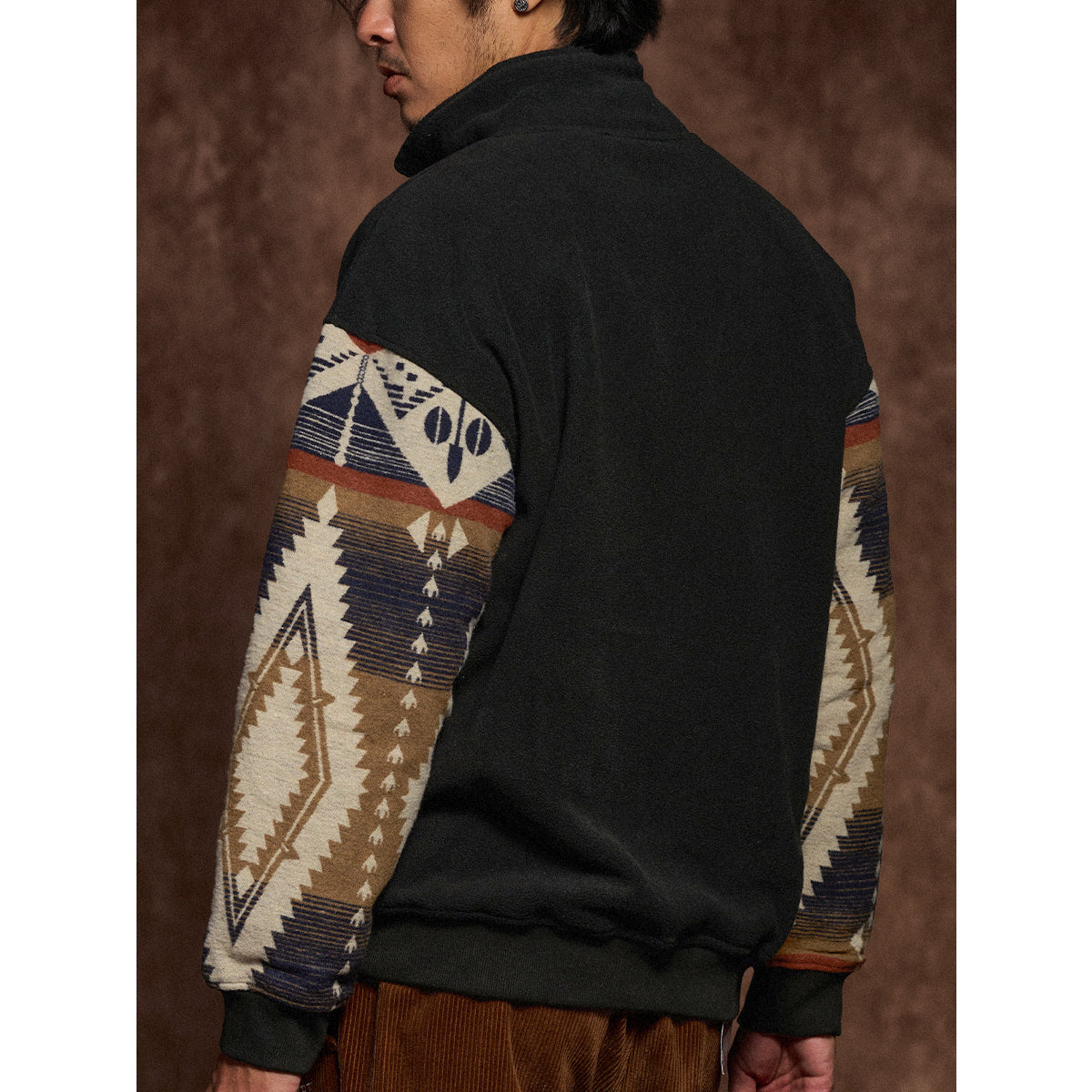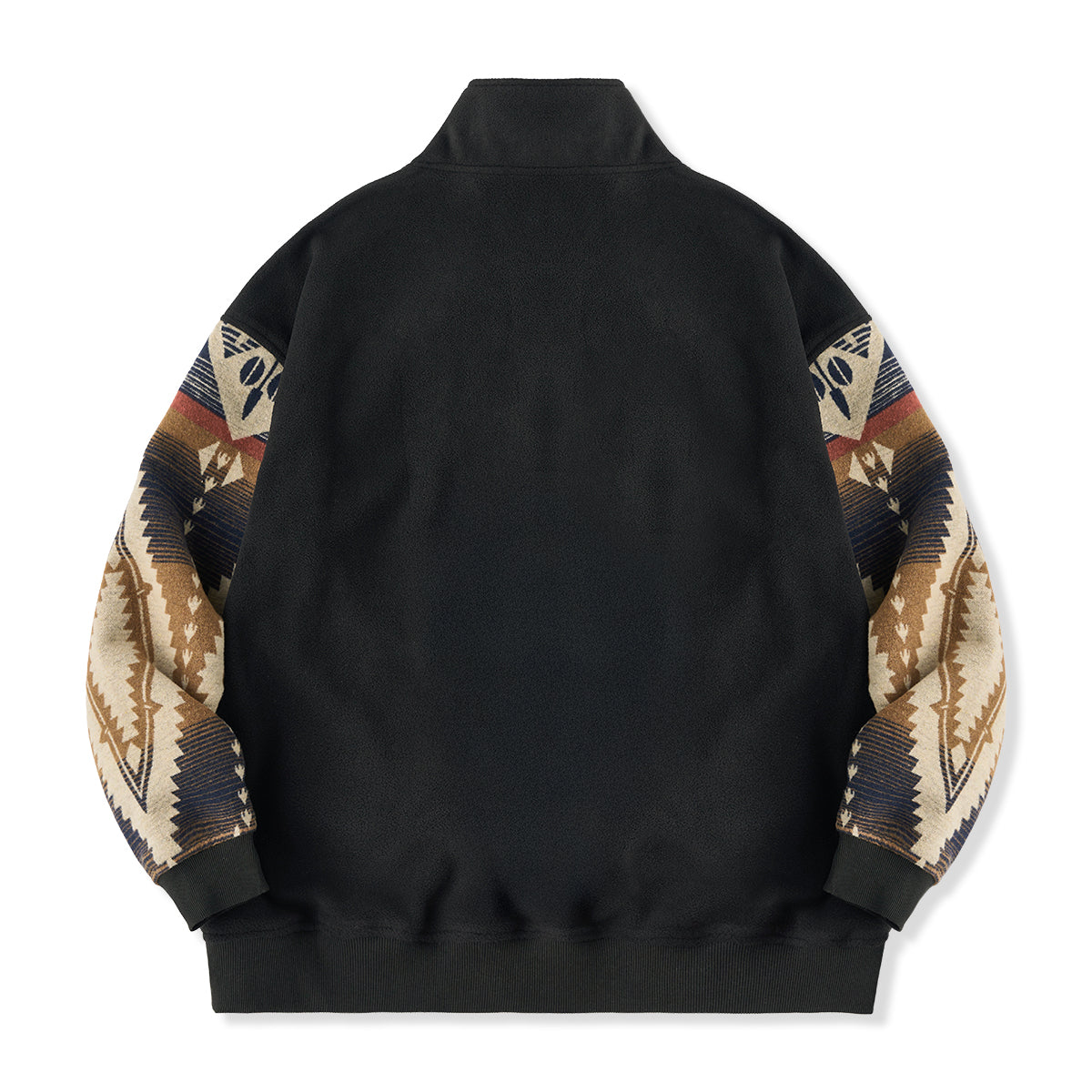 The simple black body and sleeves are decorated with a Navajo pattern, and the colors beige, brown, navy, white, and red are harmoniously combined.