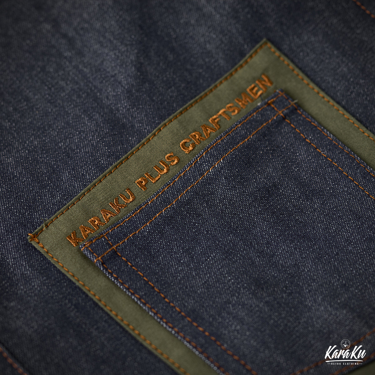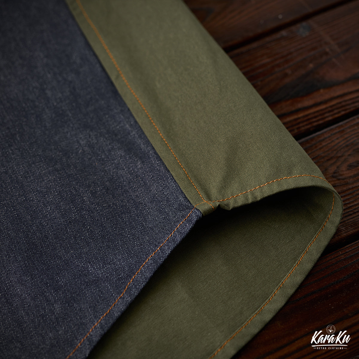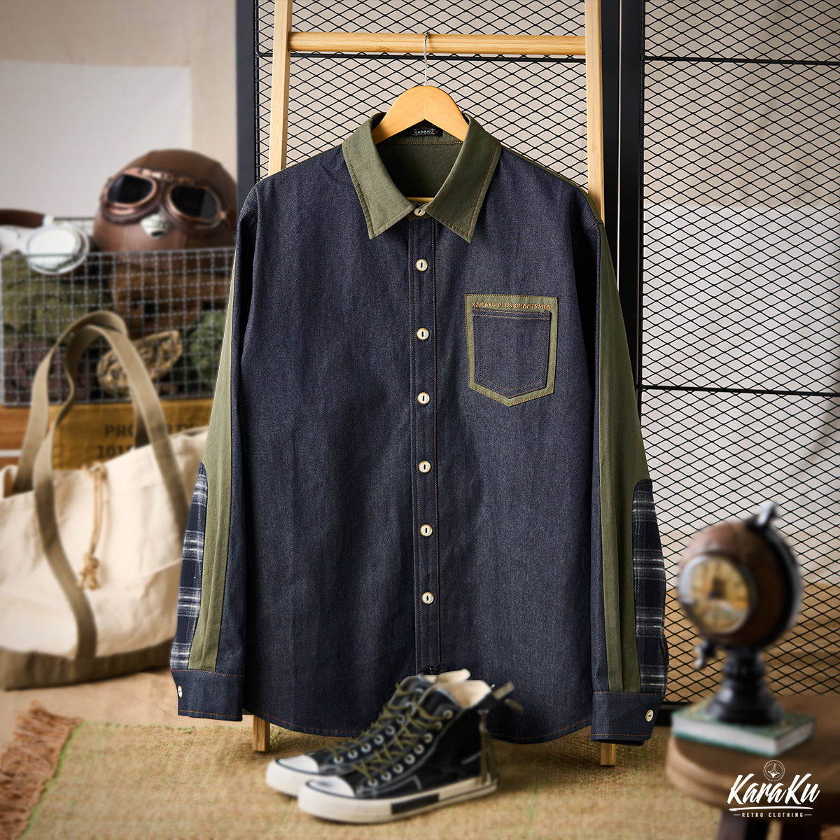 Based on a work shirt, denim and plain fabric are combined, and elbow patches and embroidery add a unique personality. The brand logo embroidery on the chest pocket is in olive green for a focal point.