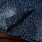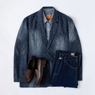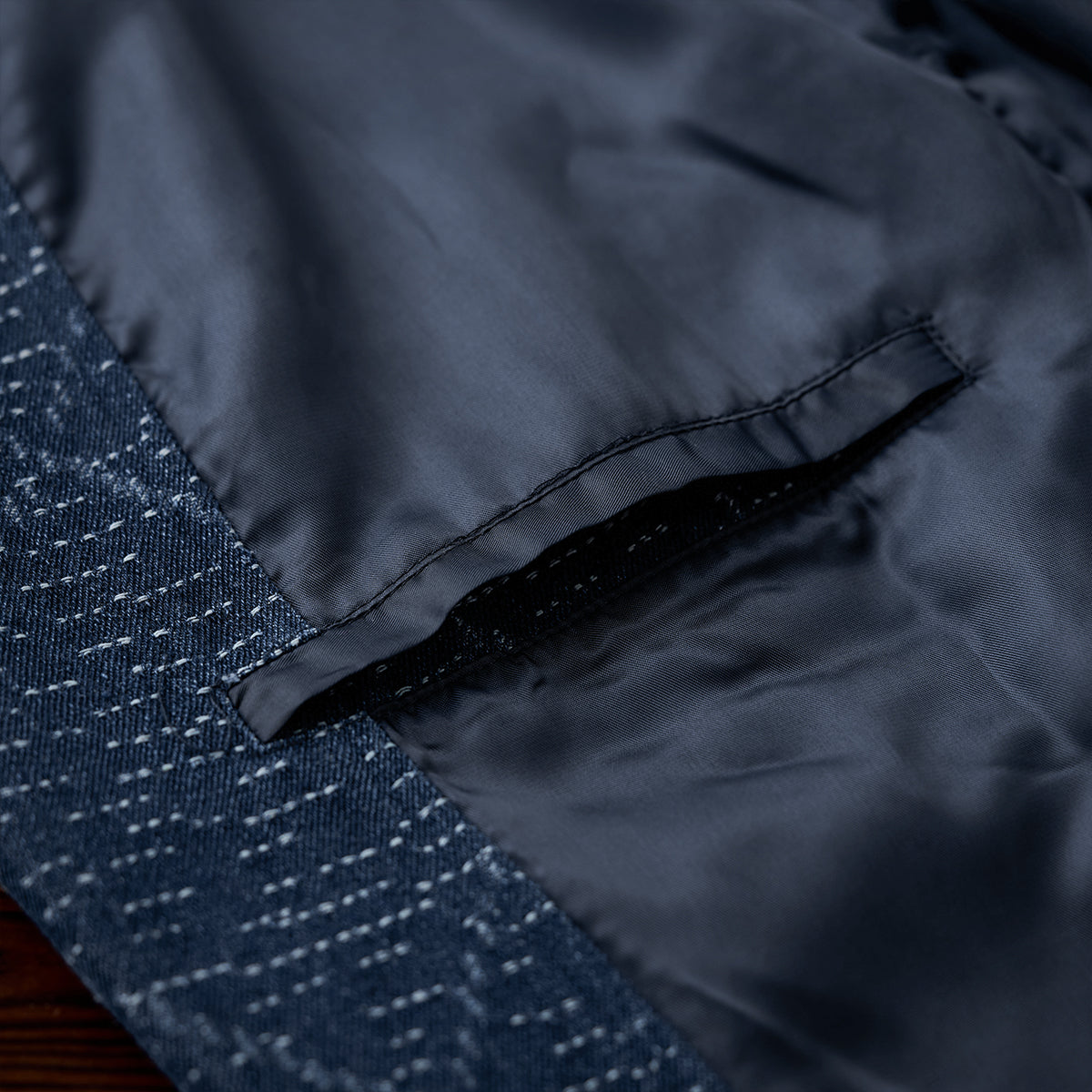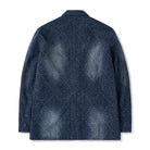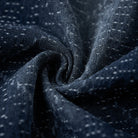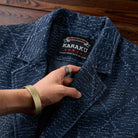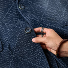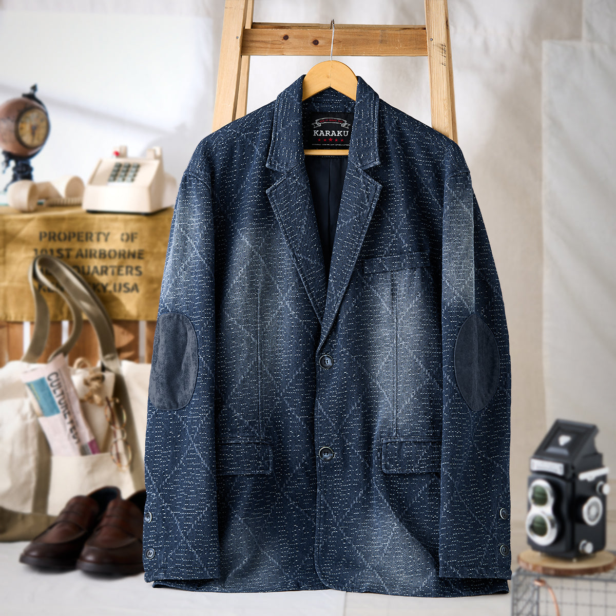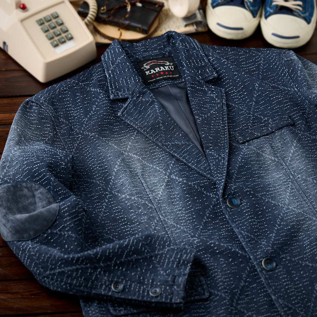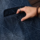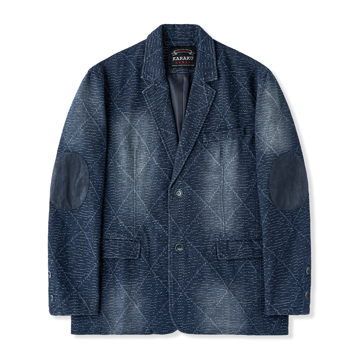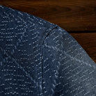 자카드 짜임의 데님 원단에 전통 사시코나 일본 문양을 연상시키는 기하학 패턴이 더해져 시각적·촉감적 풍부함을 제공합니다.