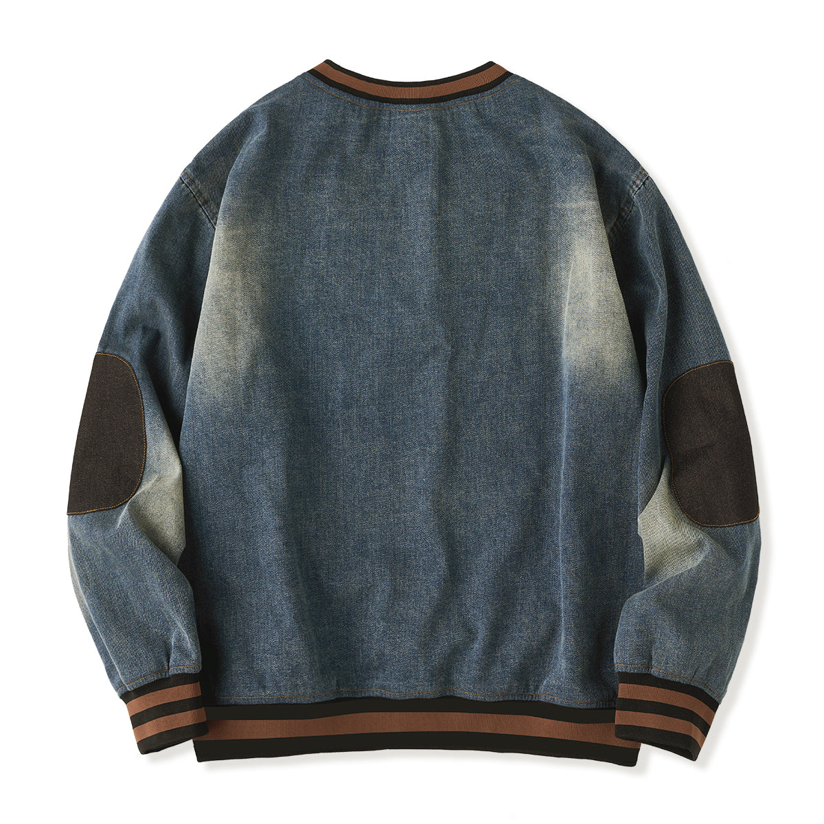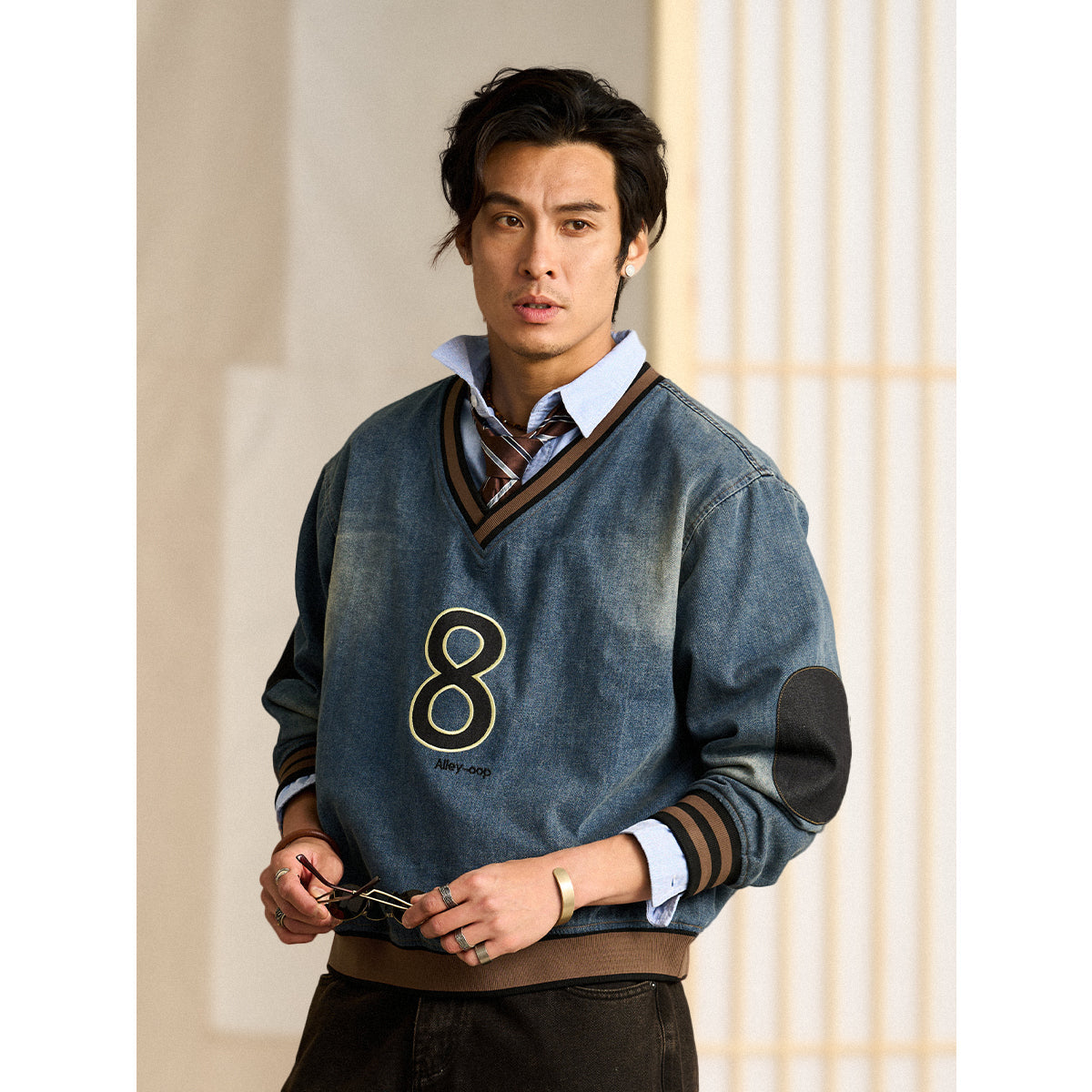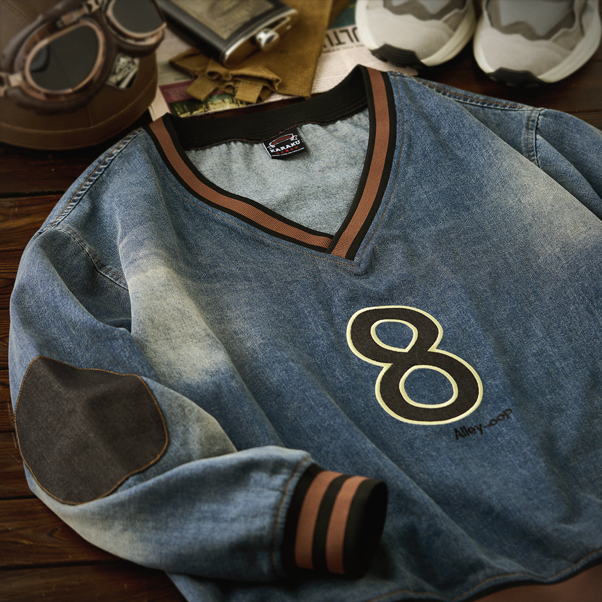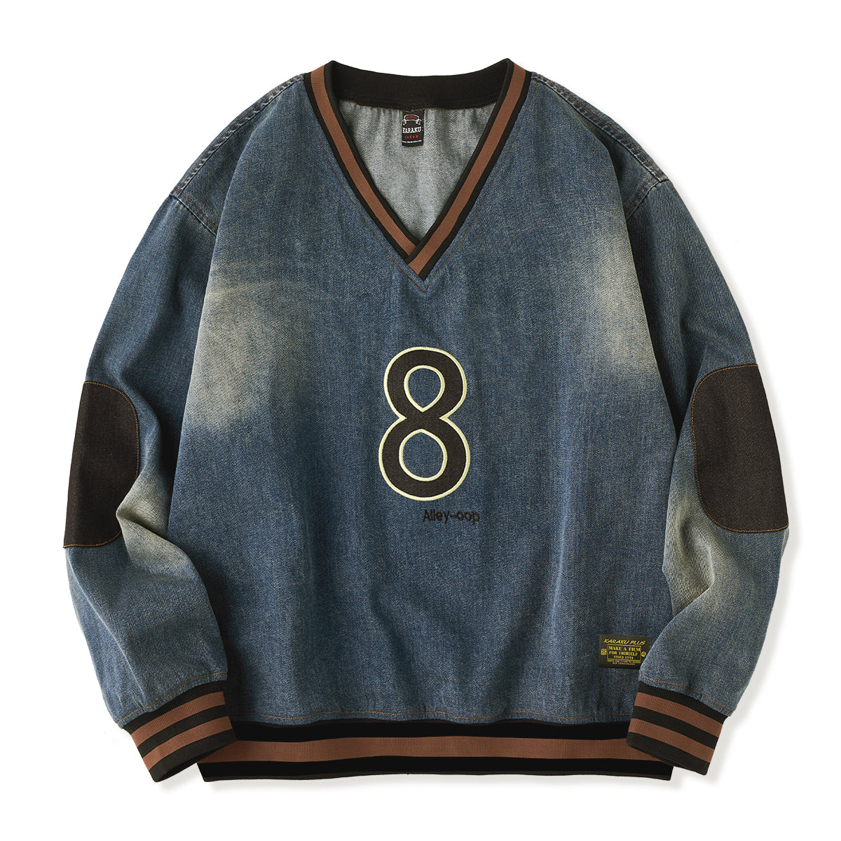 The black '8' wappen on the chest adds a strong presence, and the contrasting denim patches on the elbows provide both design and practicality.