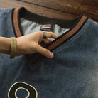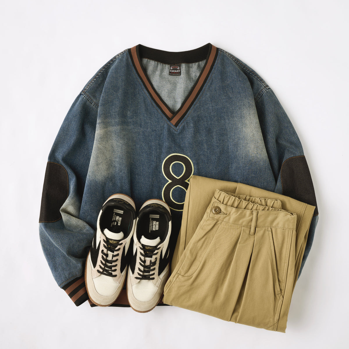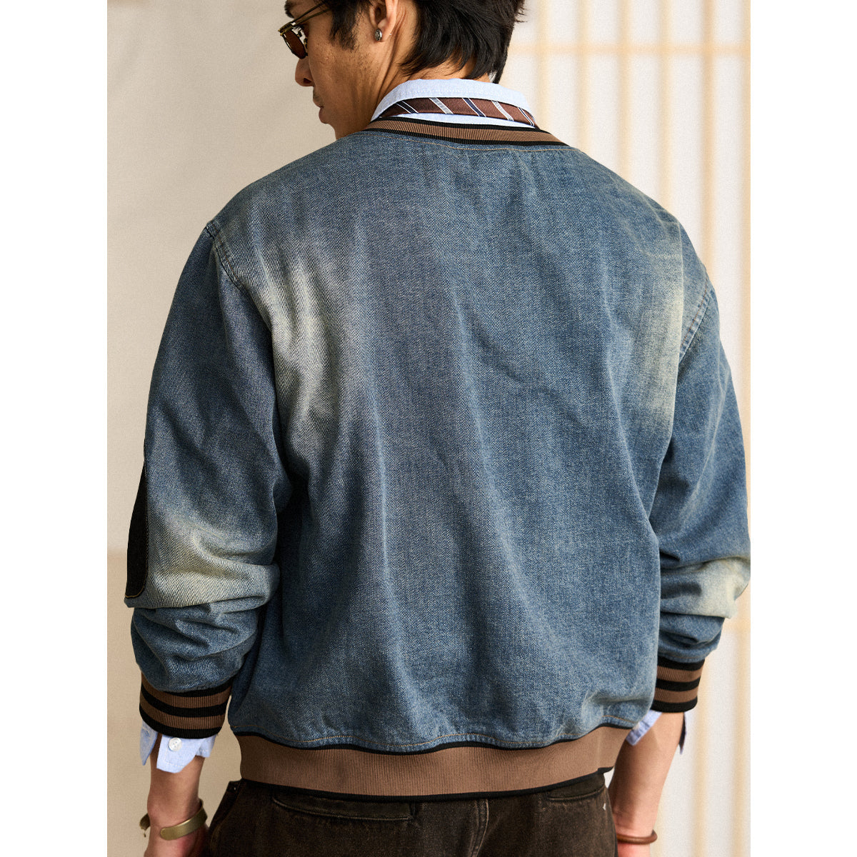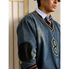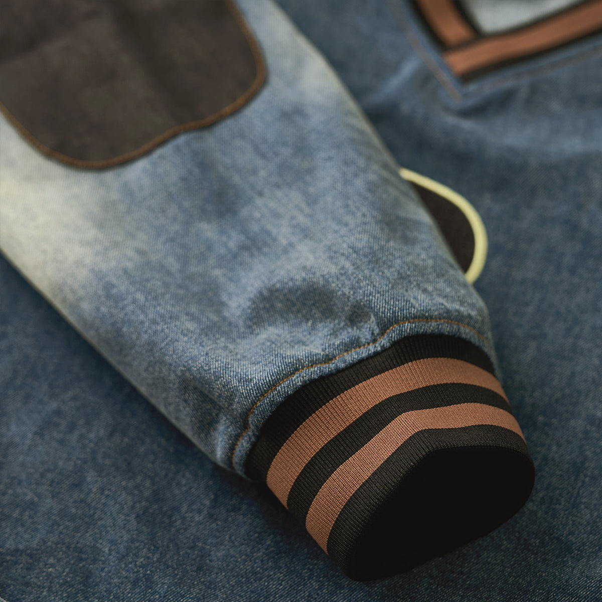 The black '8' wappen on the chest adds a strong presence, and the contrasting denim patches on the elbows provide both design and practicality.