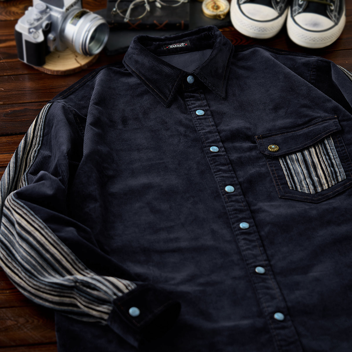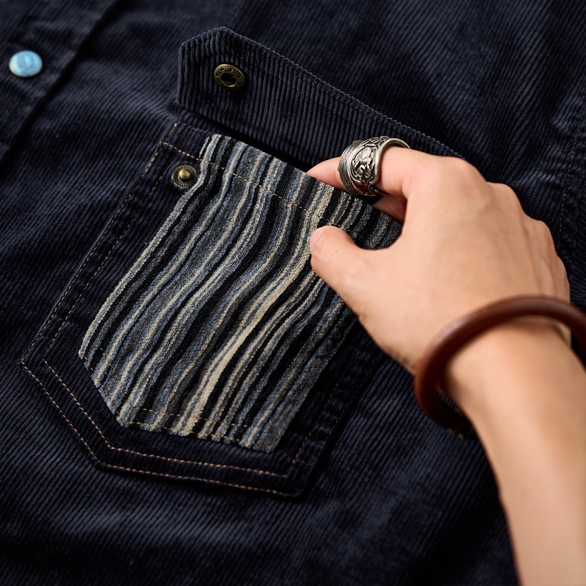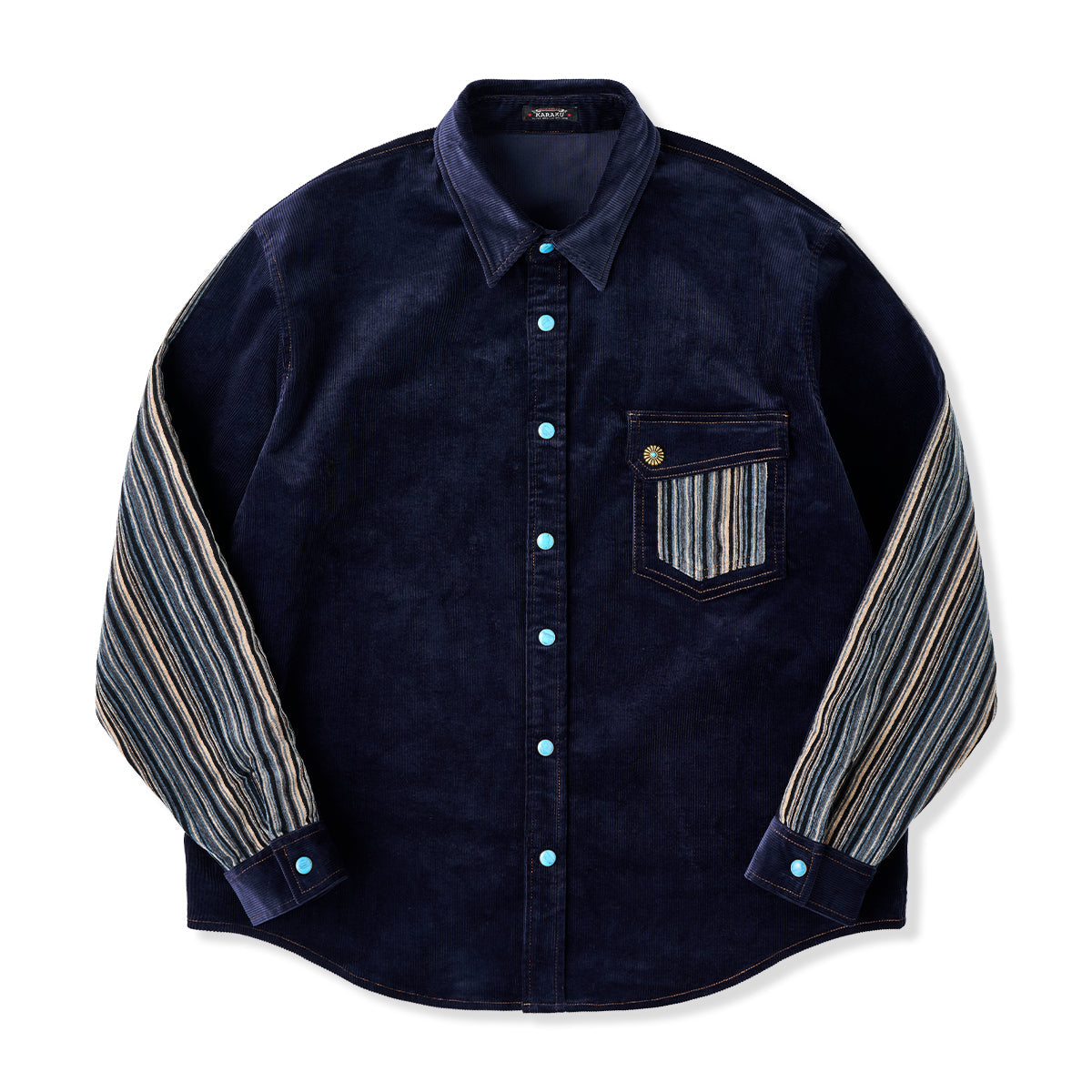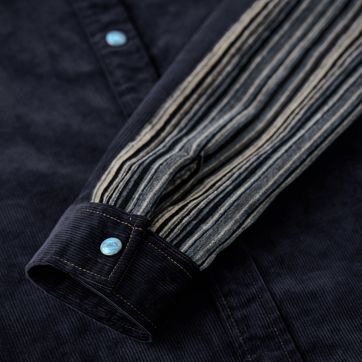 클래식한 코듀로이 셔츠에 모던한 감각을 더한 디자인. 스트라이프 원단과 청록빛 터키석 단추가 조화를 이루며 감각적인 분위기를 완성합니다.