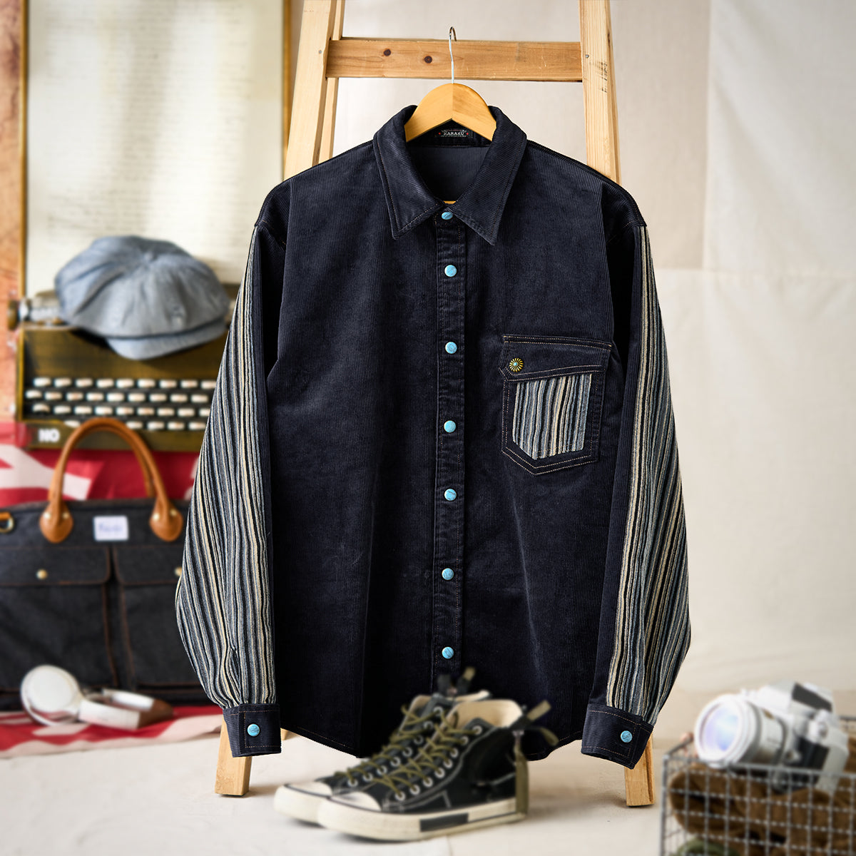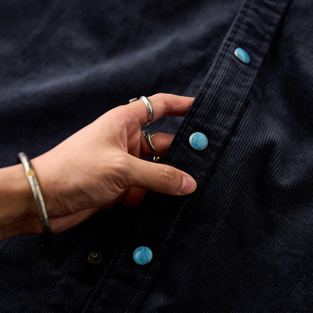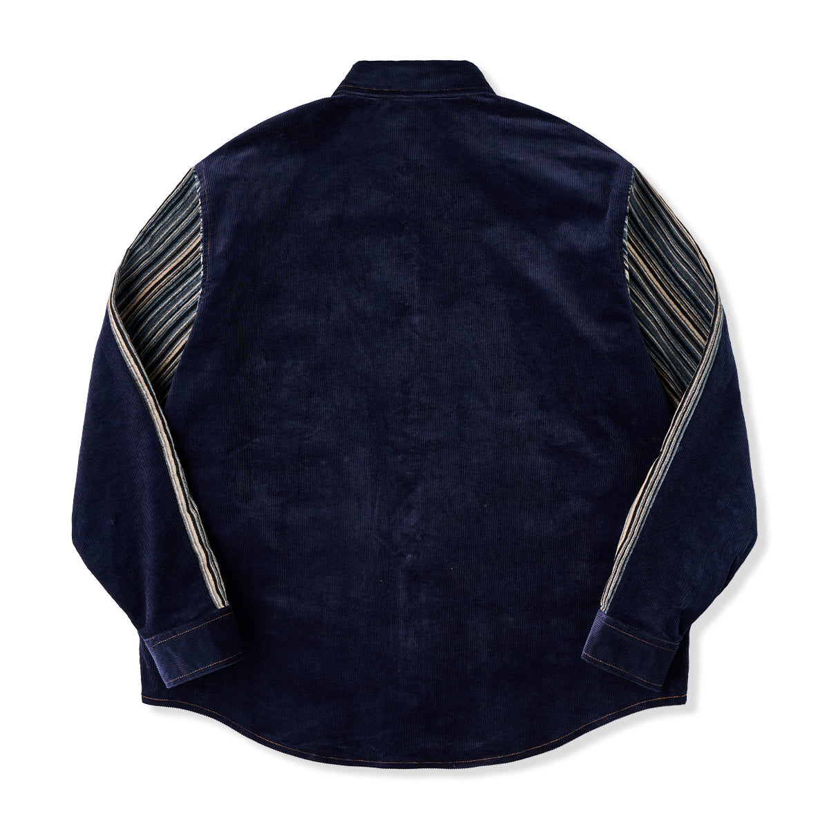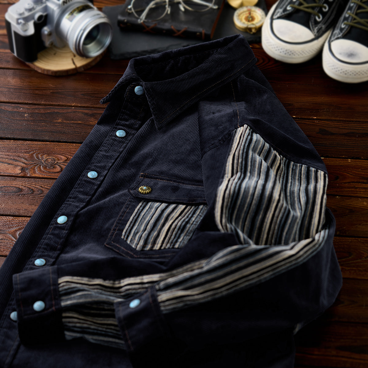 클래식한 코듀로이 셔츠에 모던한 감각을 더한 디자인. 스트라이프 원단과 청록빛 터키석 단추가 조화를 이루며 감각적인 분위기를 완성합니다.