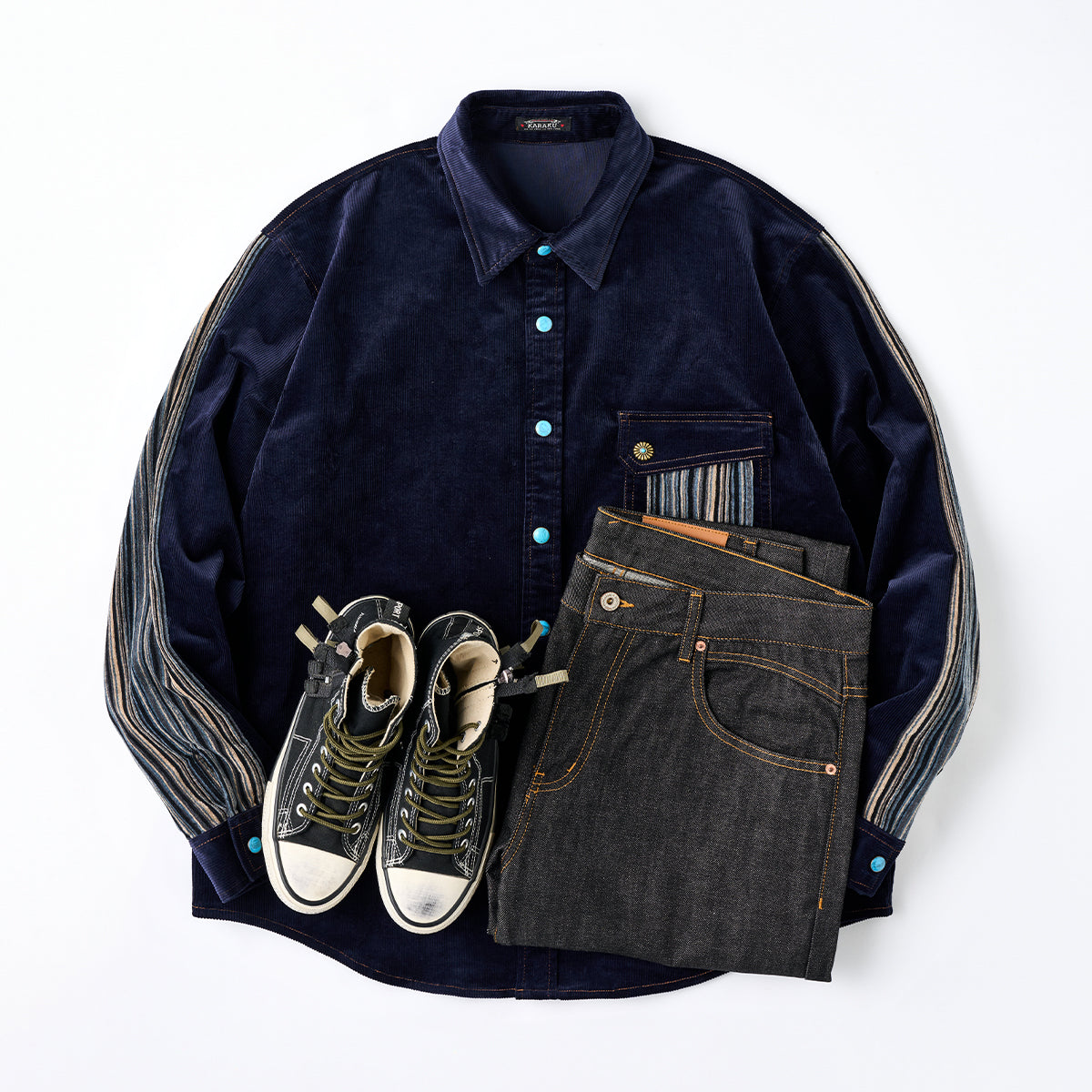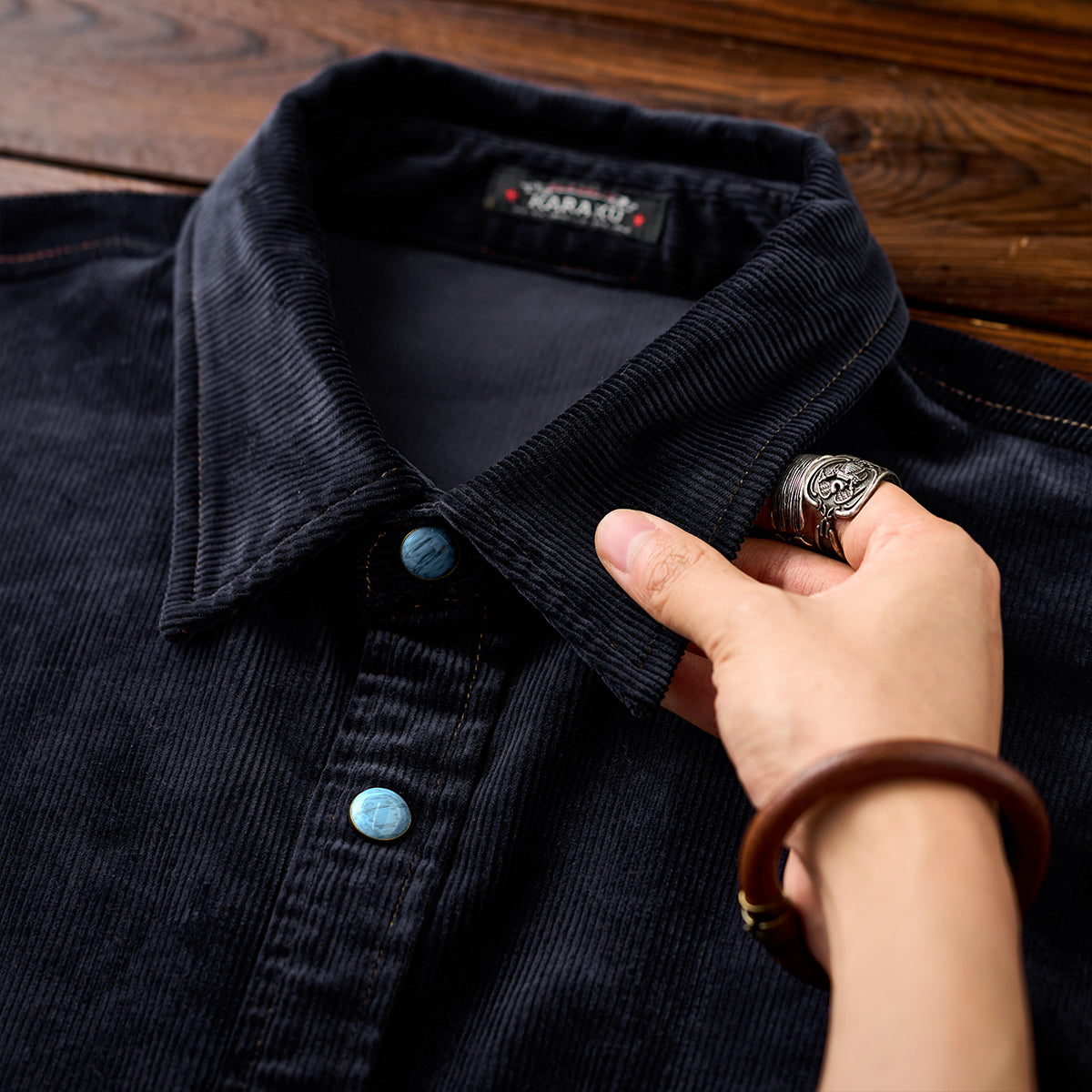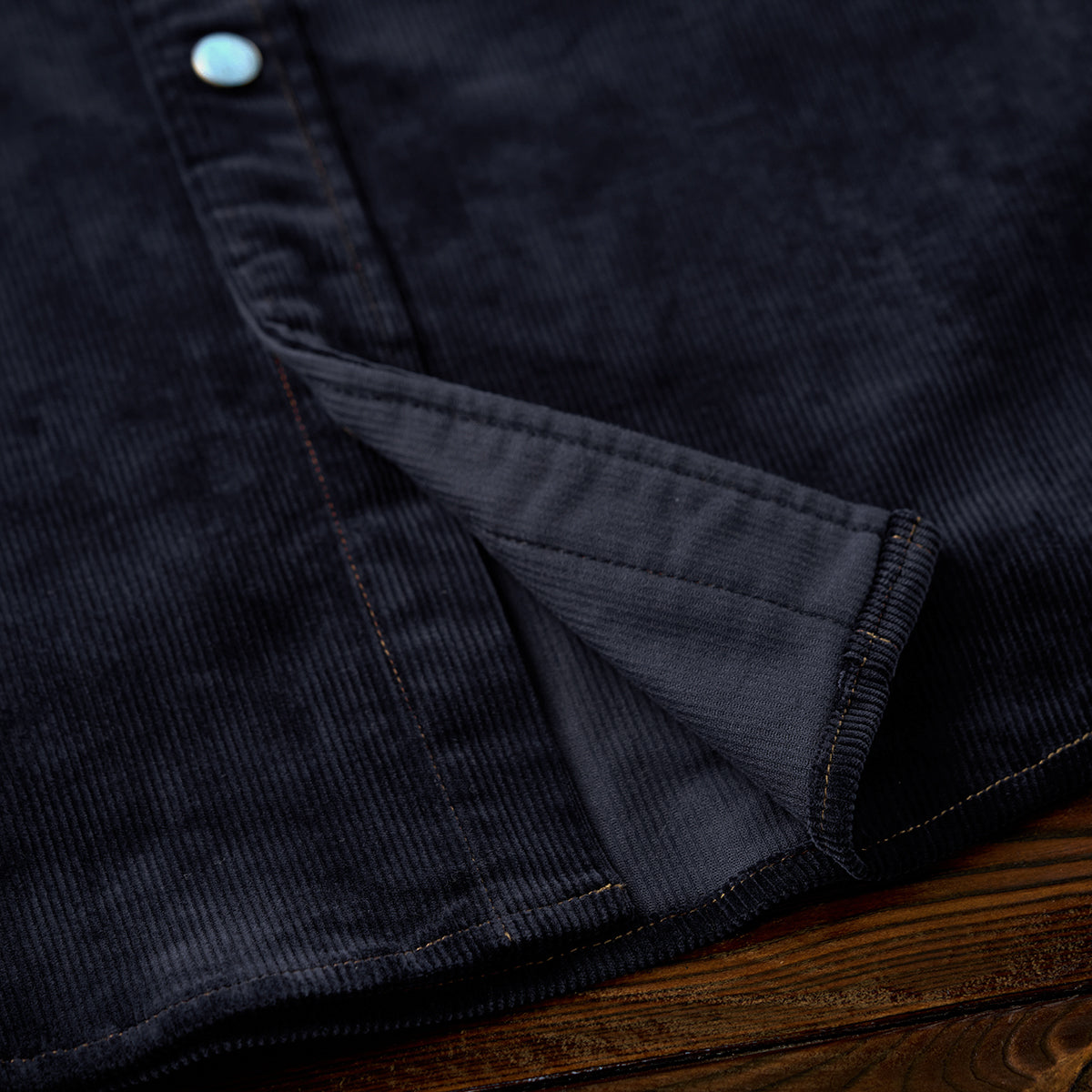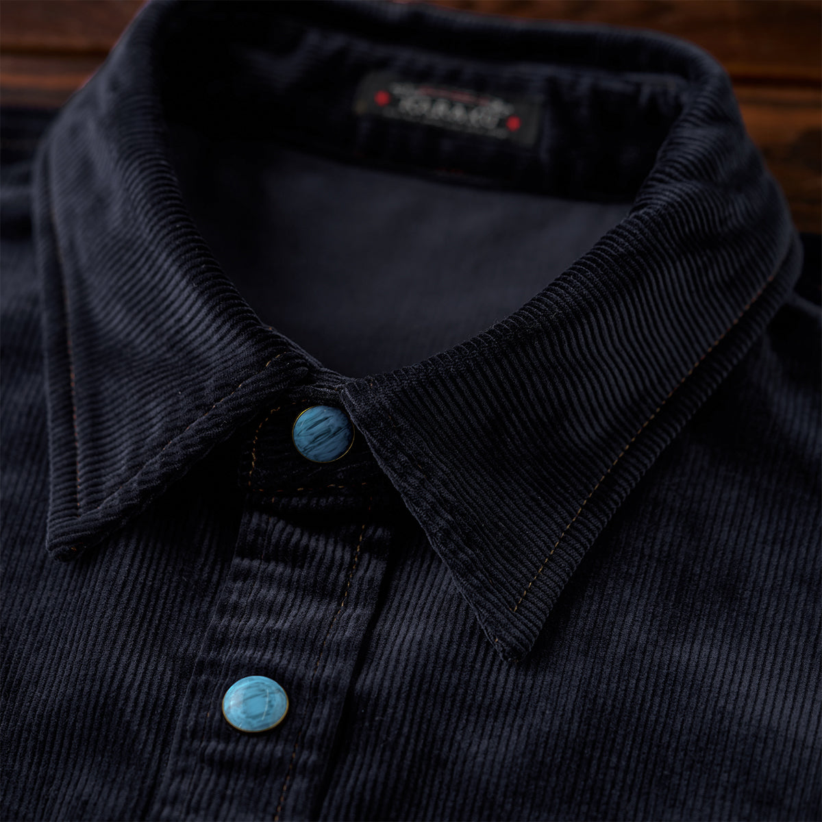클래식한 코듀로이 셔츠에 모던한 감각을 더한 디자인. 스트라이프 원단과 청록빛 터키석 단추가 조화를 이루며 감각적인 분위기를 완성합니다.