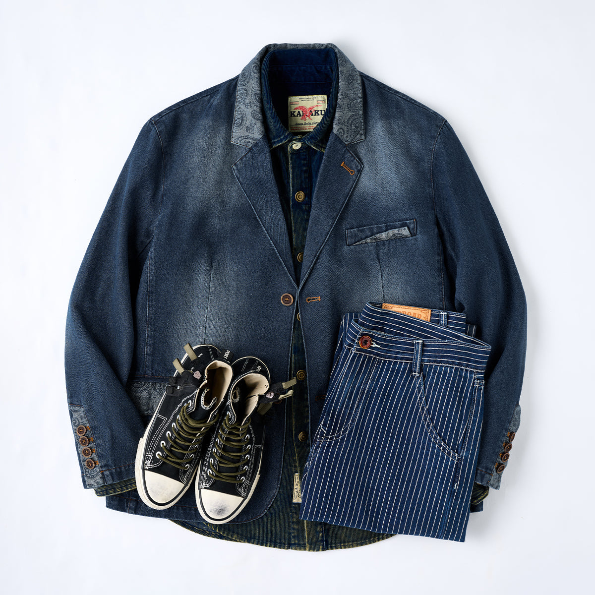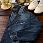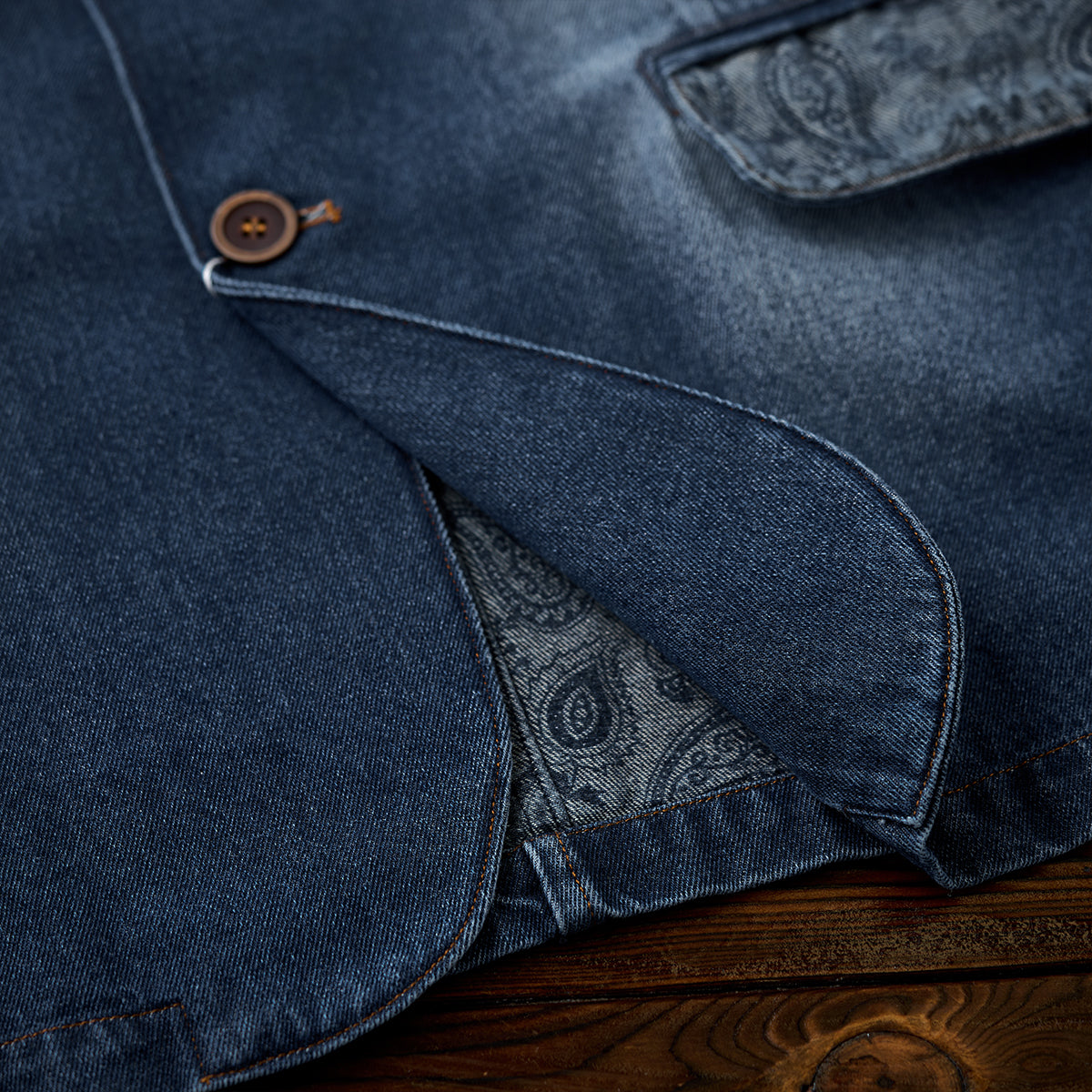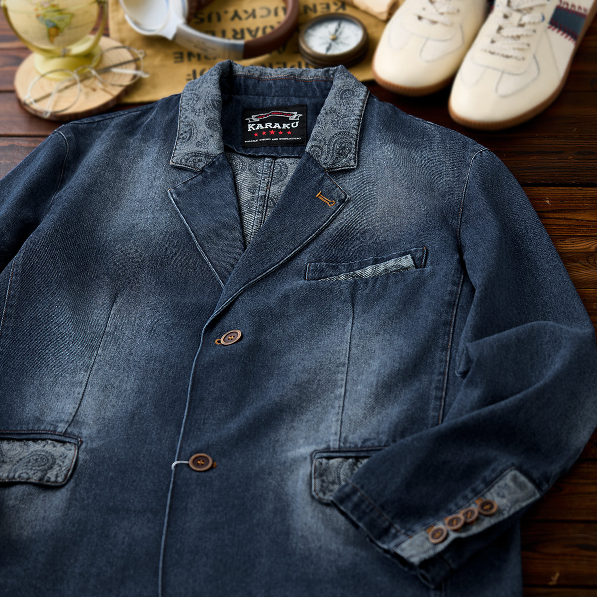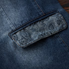 【사전예약】칼라·플랩·안감 페이즐리 패턴 몽키 워싱 가공 데님 테일러드 자켓